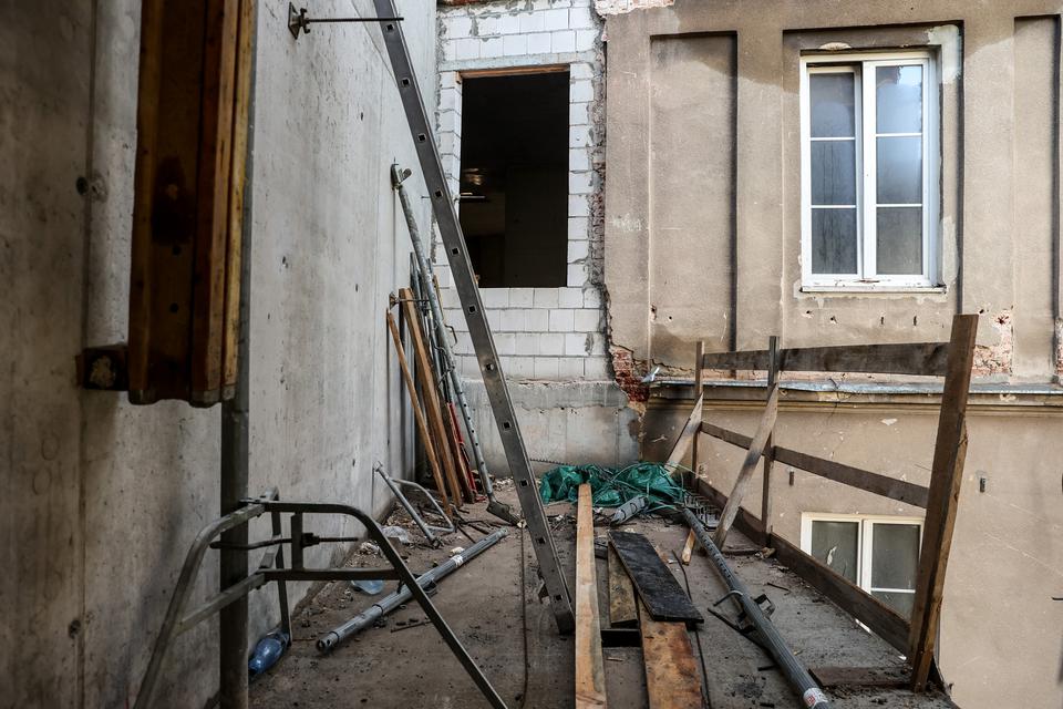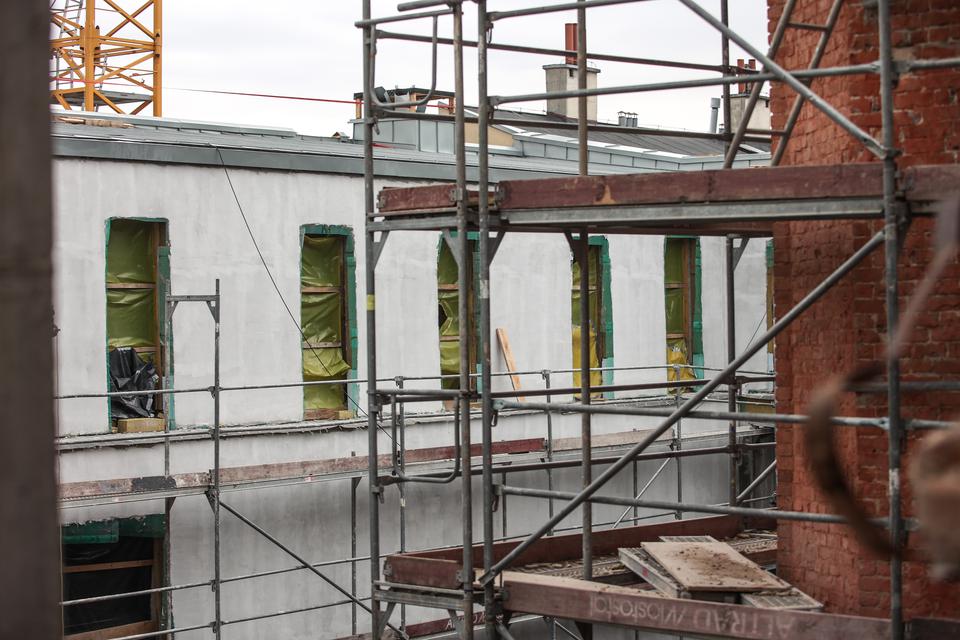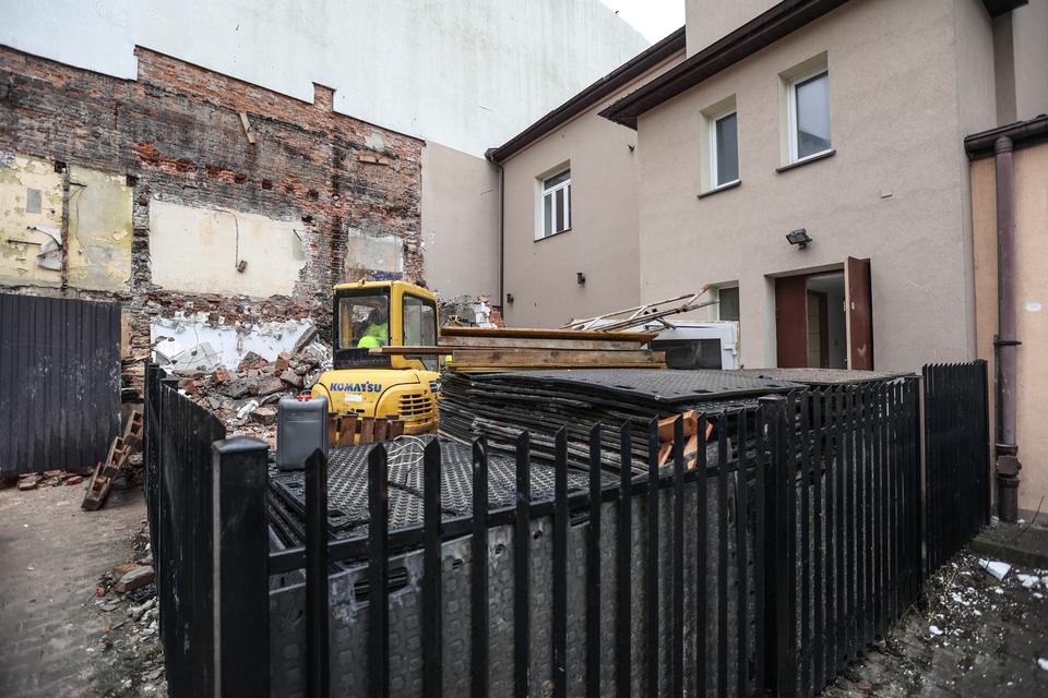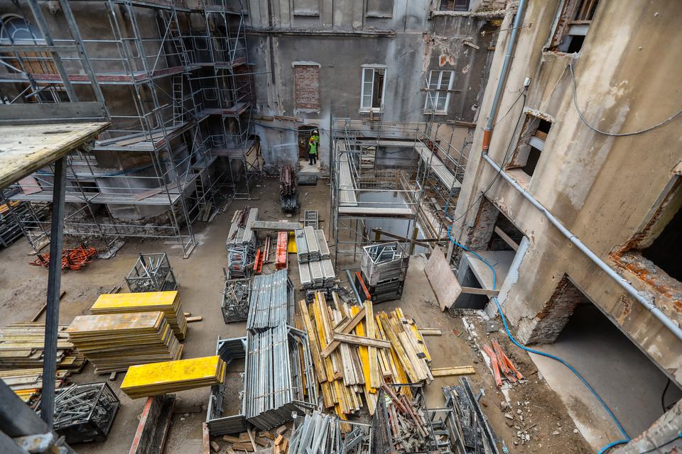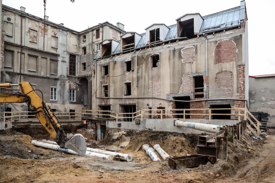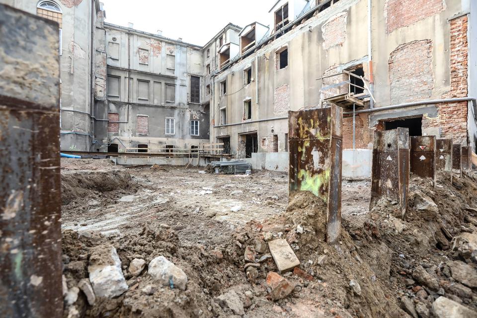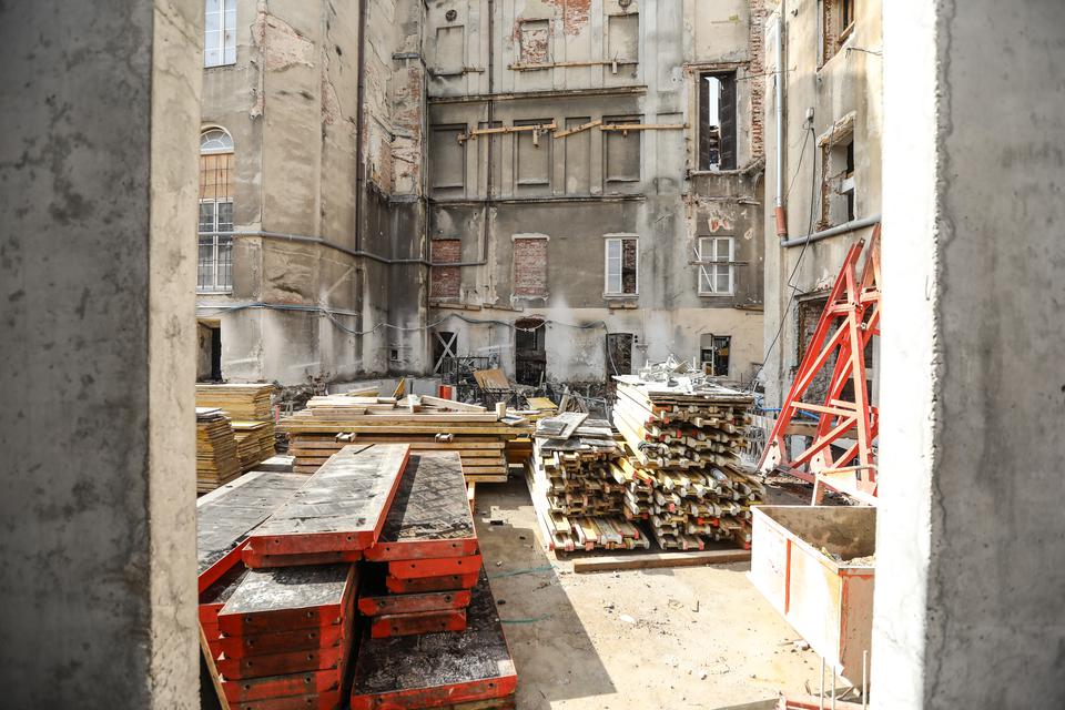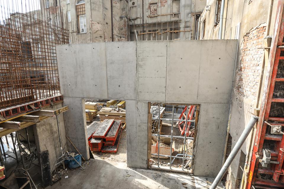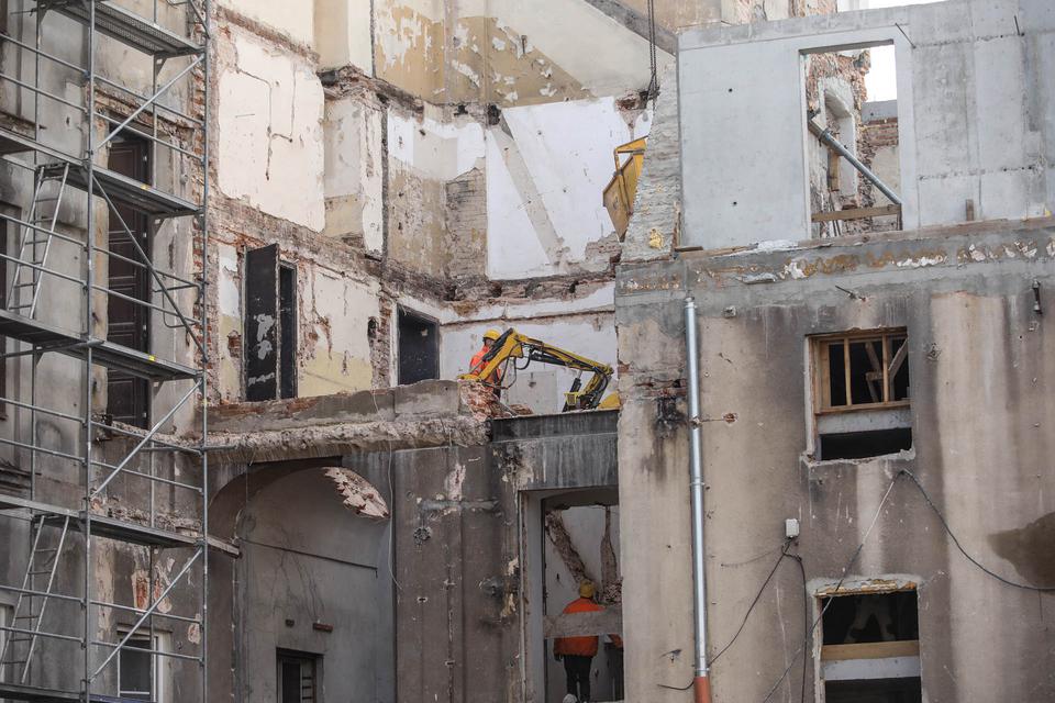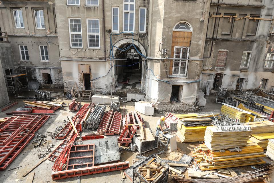 The first building works and advanced demolition works are being done at the construction site in 32 Sienkiewicza street. Installation and freight elevator were deconstructed. Disassembly of window frames and doors is taking place, as well as demolition of some partition walls and lining. Liquidation holes are being immured and walls are being strengthened. The ceilings in the main building are also being prepared for demolition.