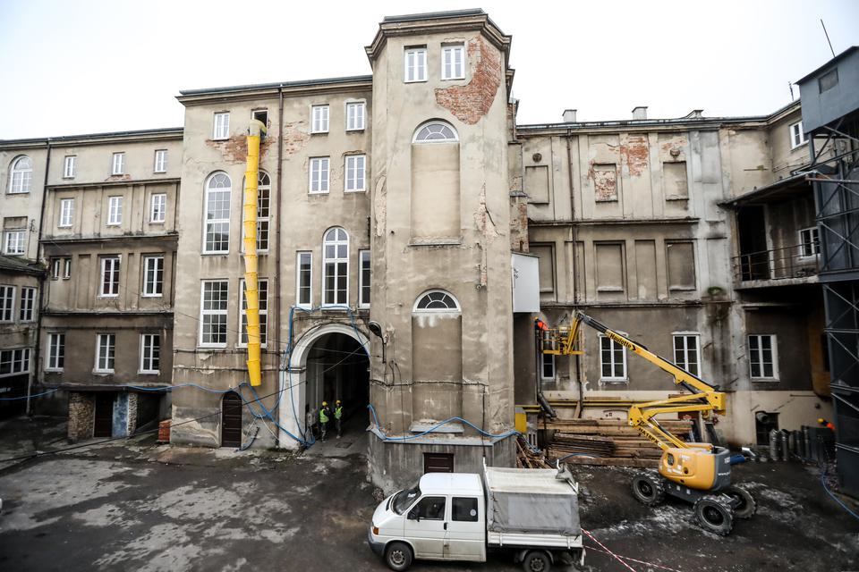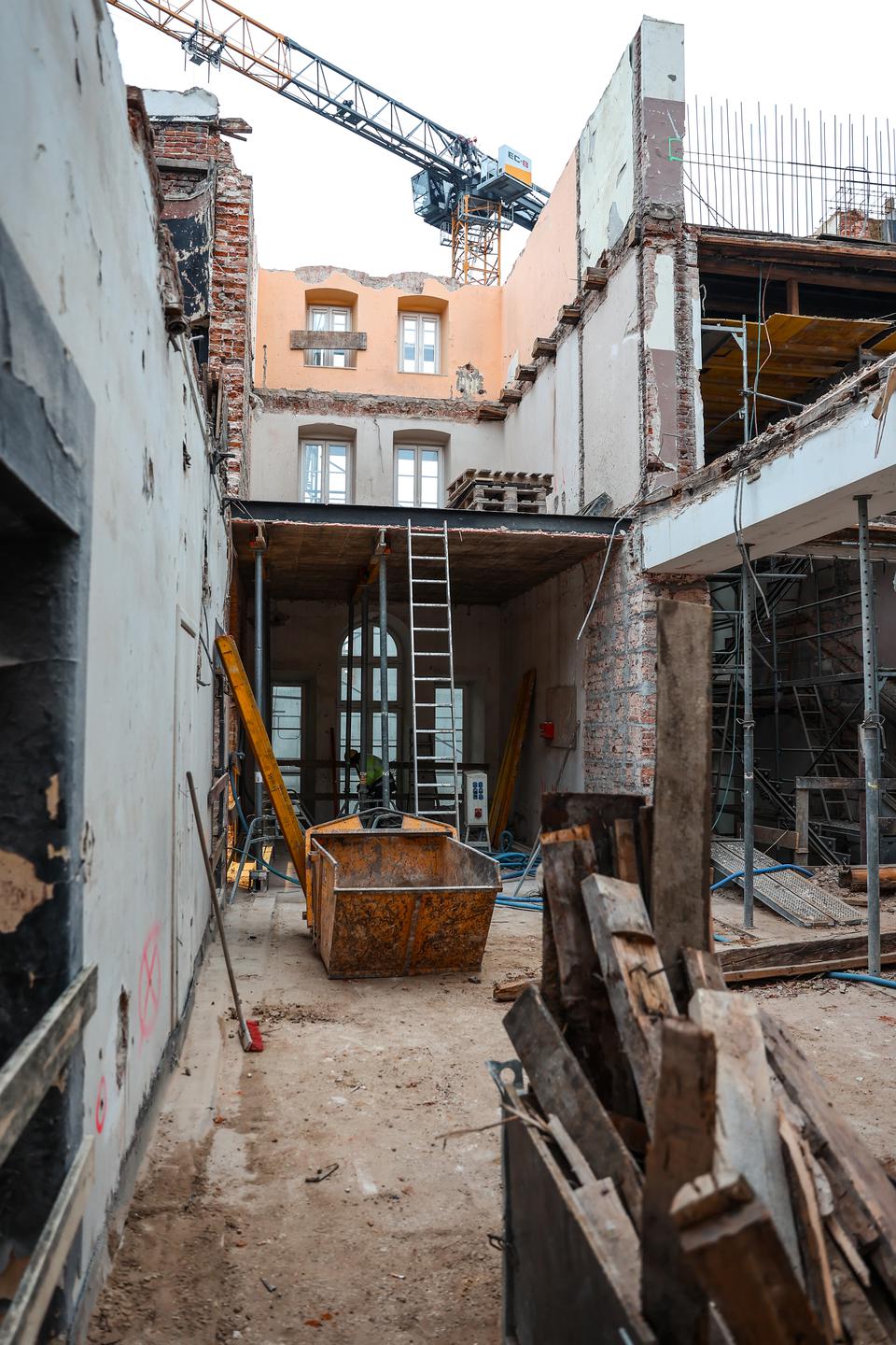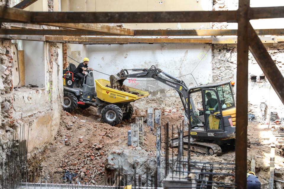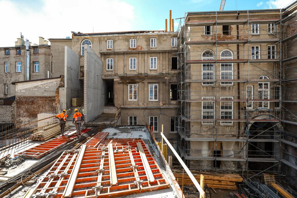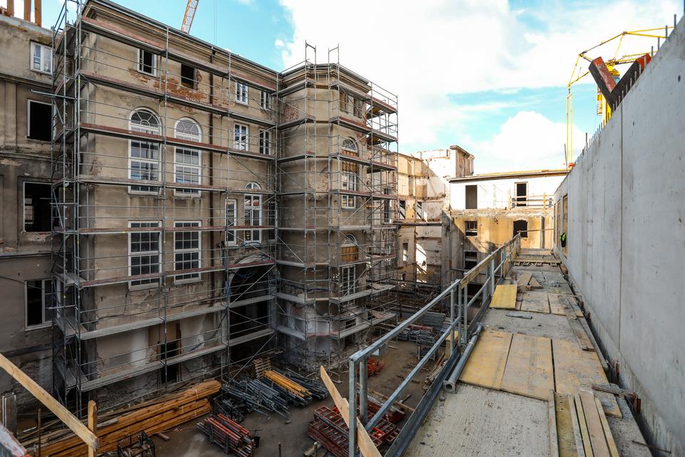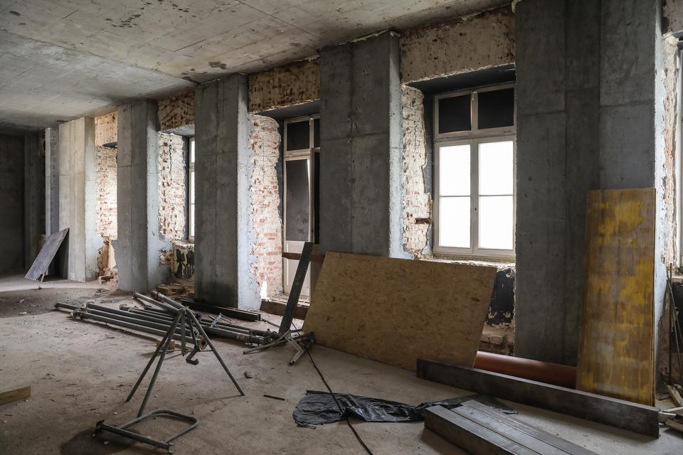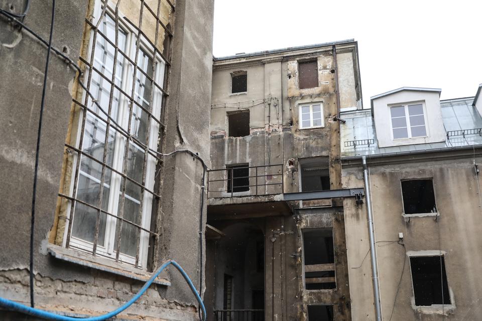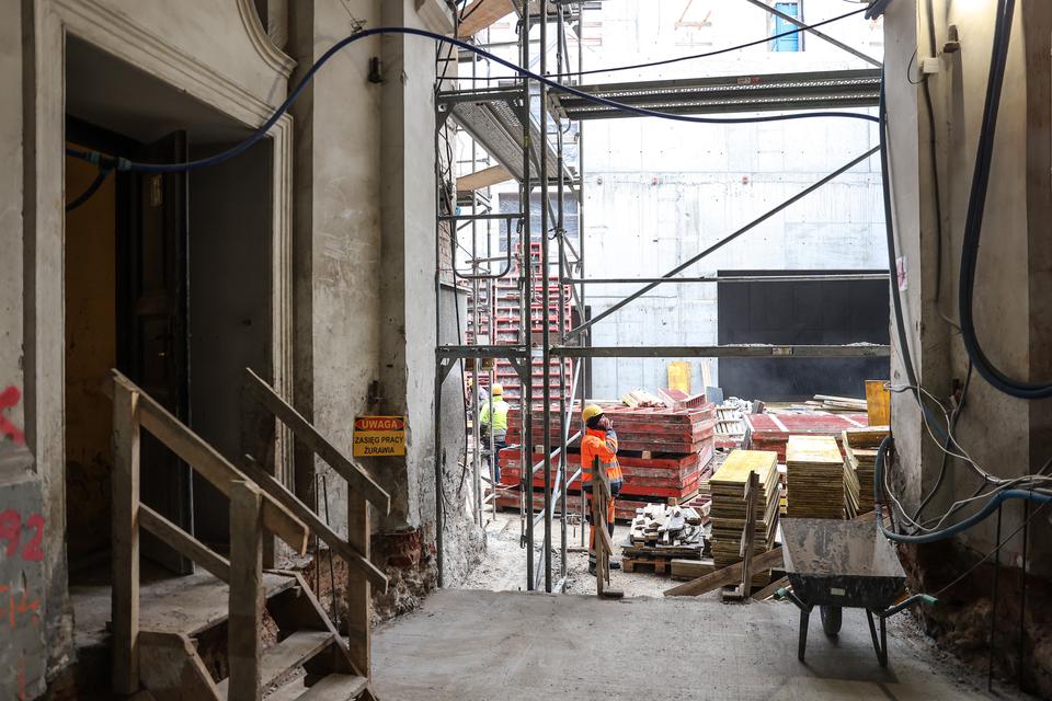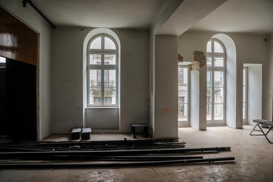The first building works and advanced demolition works are being done at the construction site in 32 Sienkiewicza street. Installation and freight elevator were deconstructed. Disassembly of window frames and doors is taking place, as well as demolition of some partition walls and lining. Liquidation holes are being immured and walls are being strengthened. The ceilings in the main building are also being prepared for demolition.