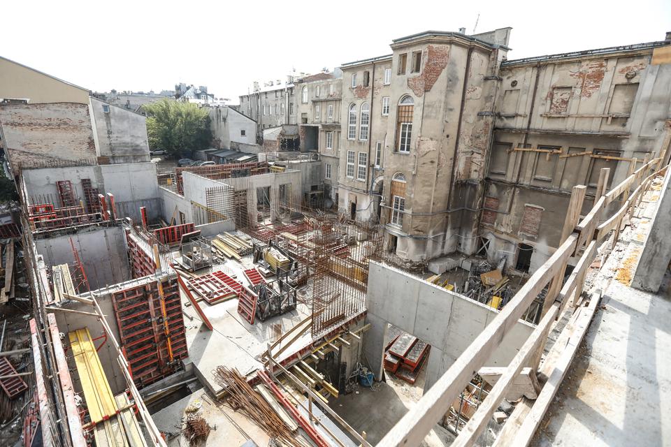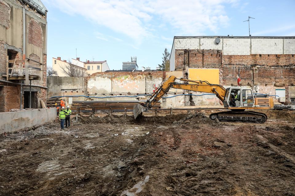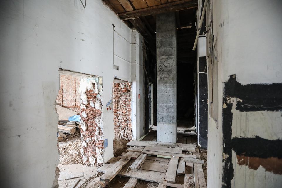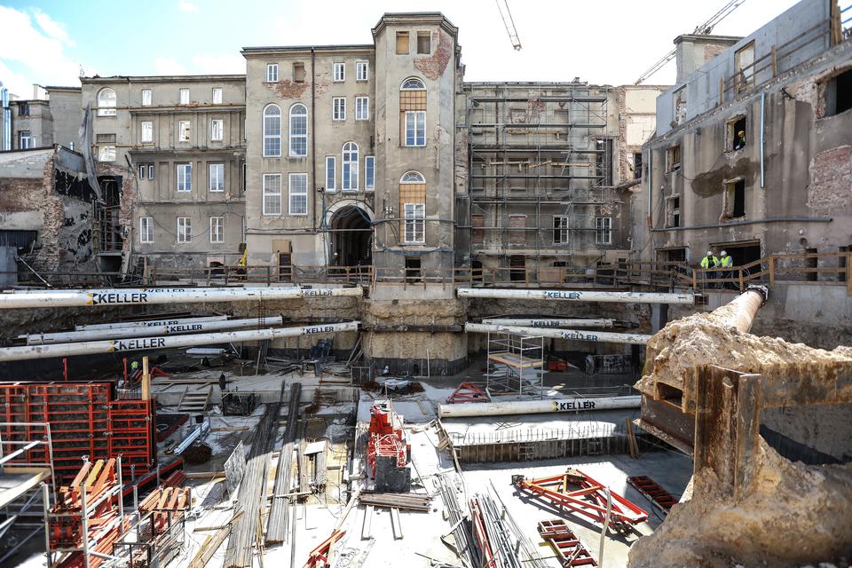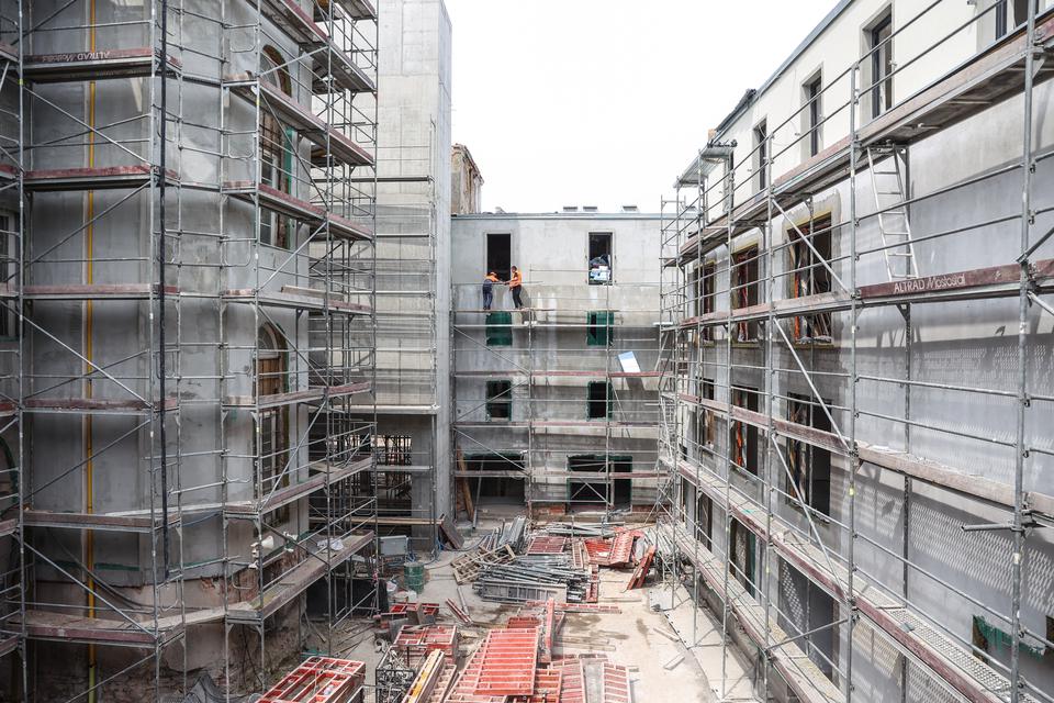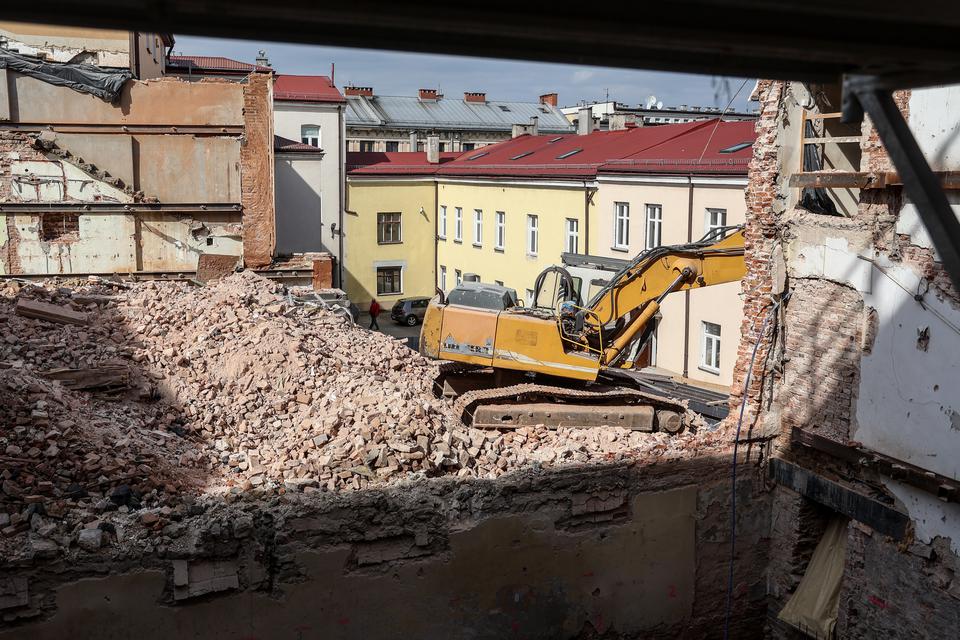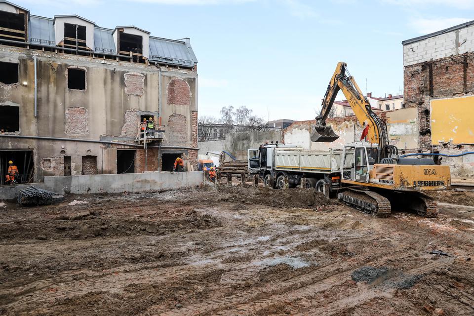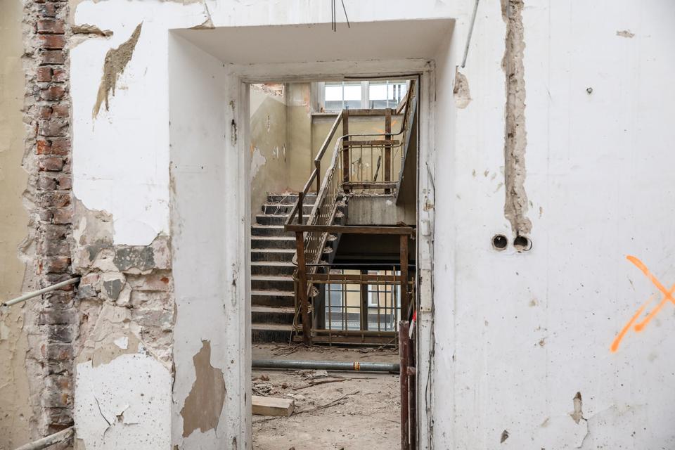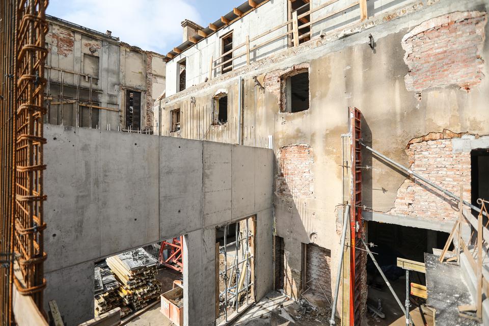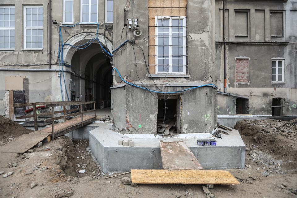 The first building works and advanced demolition works are being done at the construction site in 32 Sienkiewicza street. Installation and freight elevator were deconstructed. Disassembly of window frames and doors is taking place, as well as demolition of some partition walls and lining. Liquidation holes are being immured and walls are being strengthened. The ceilings in the main building are also being prepared for demolition.