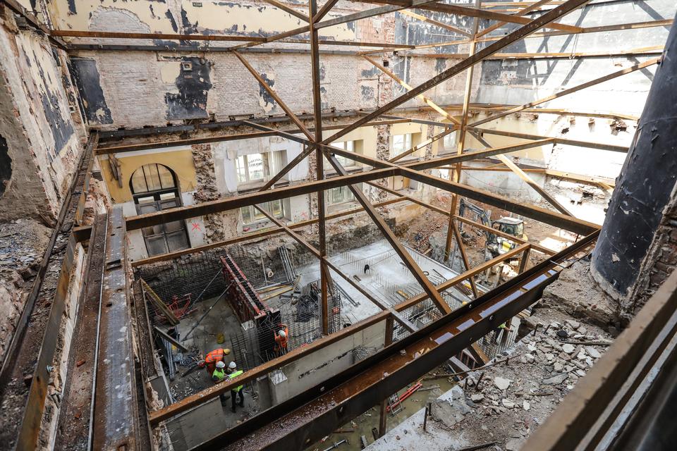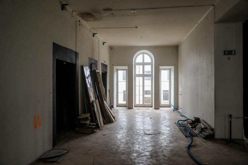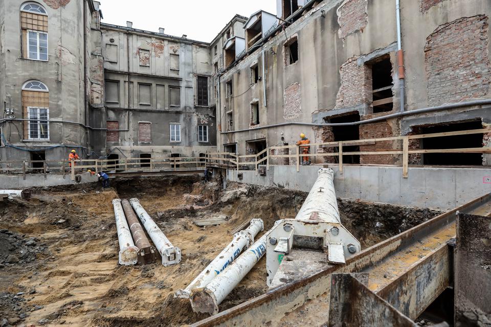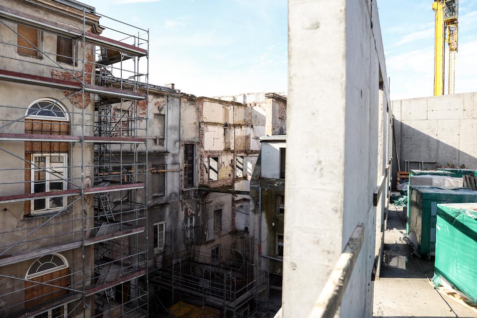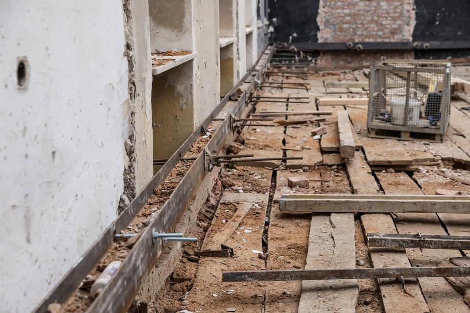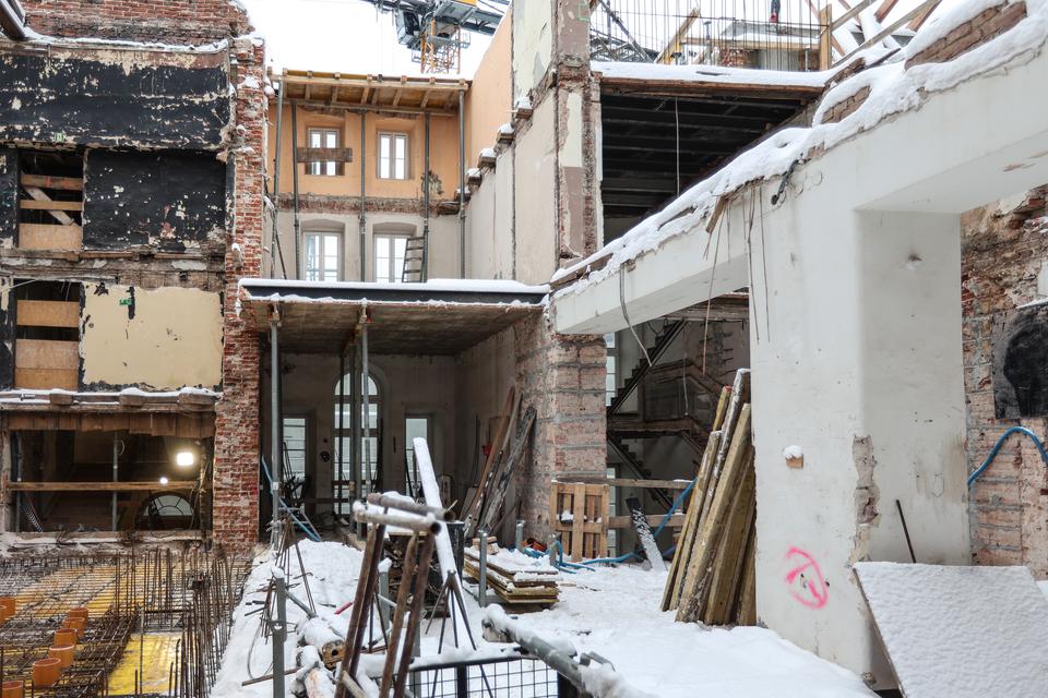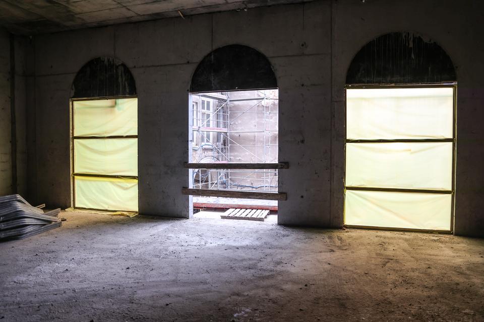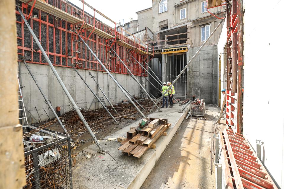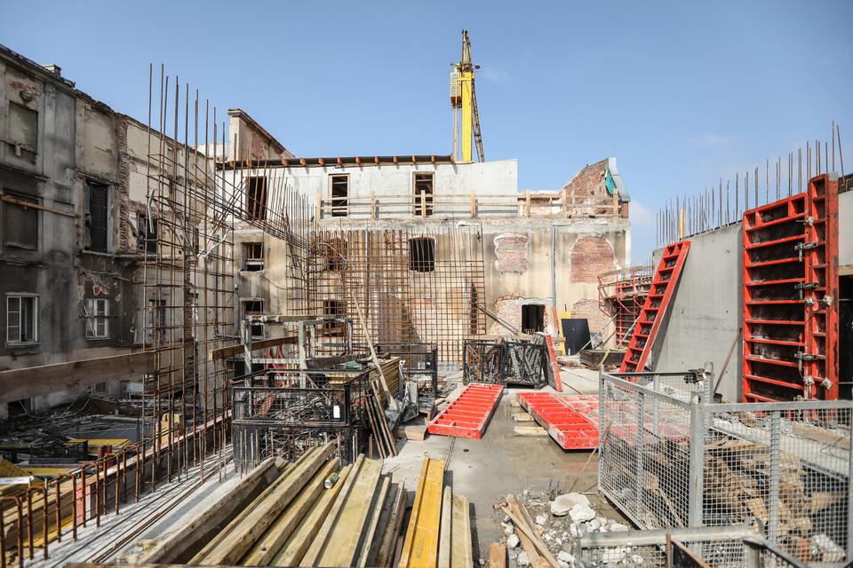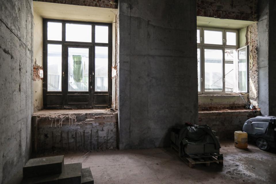 The first building works and advanced demolition works are being done at the construction site in 32 Sienkiewicza street. Installation and freight elevator were deconstructed. Disassembly of window frames and doors is taking place, as well as demolition of some partition walls and lining. Liquidation holes are being immured and walls are being strengthened. The ceilings in the main building are also being prepared for demolition.