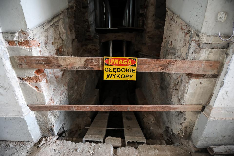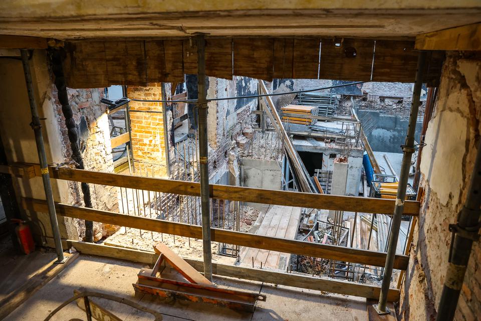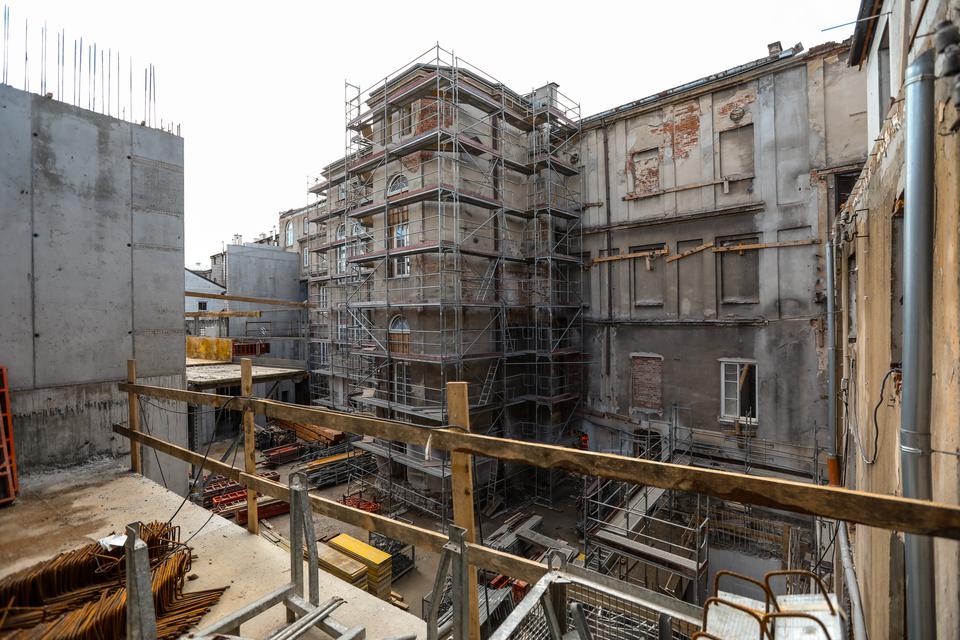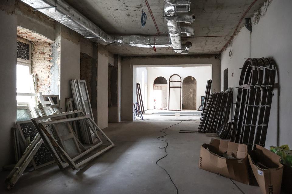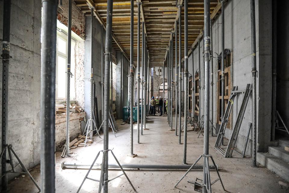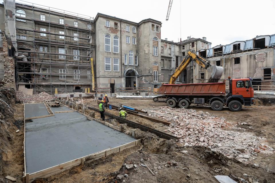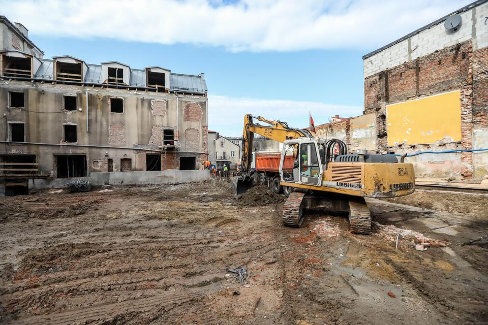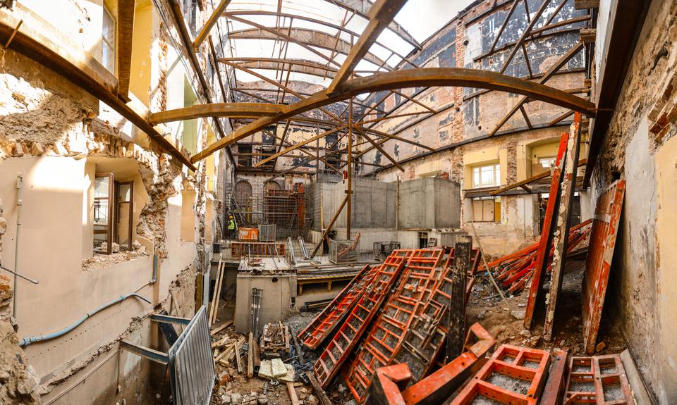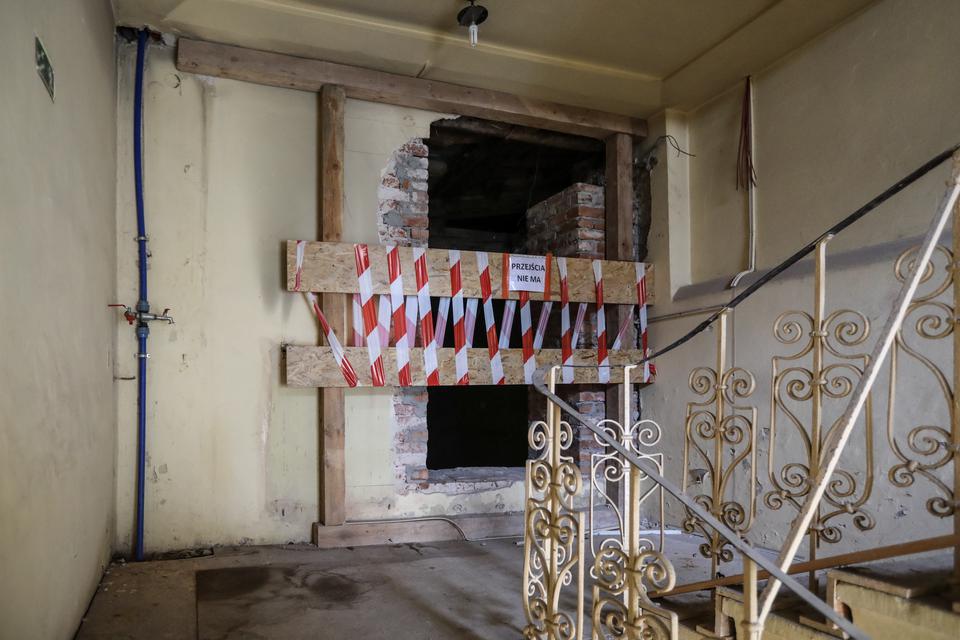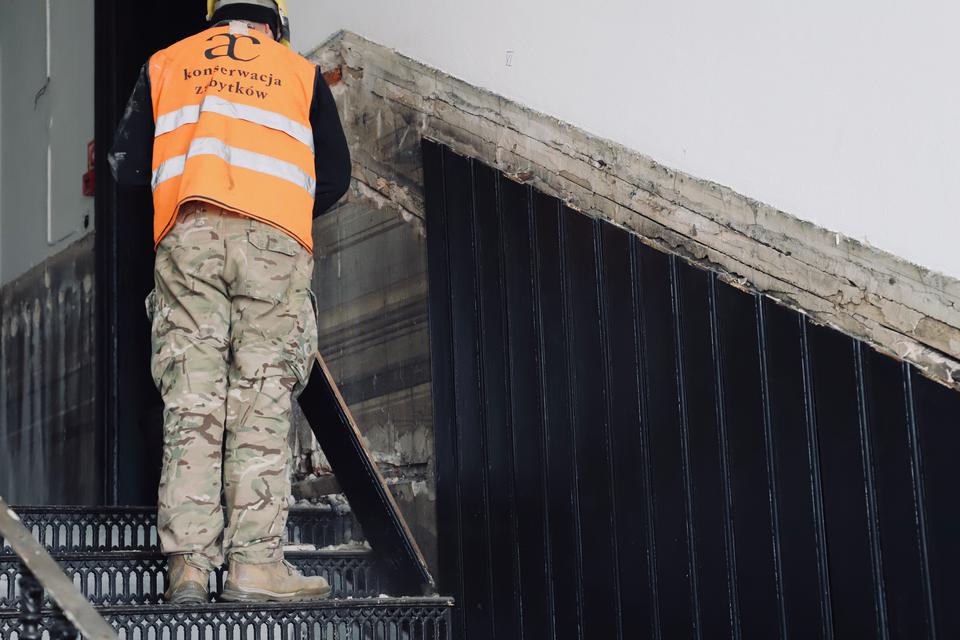 The first building works and advanced demolition works are being done at the construction site in 32 Sienkiewicza street. Installation and freight elevator were deconstructed. Disassembly of window frames and doors is taking place, as well as demolition of some partition walls and lining. Liquidation holes are being immured and walls are being strengthened. The ceilings in the main building are also being prepared for demolition.