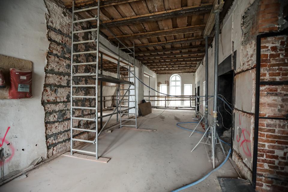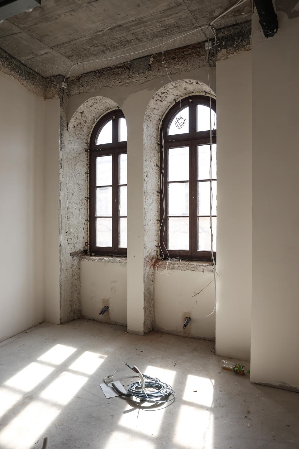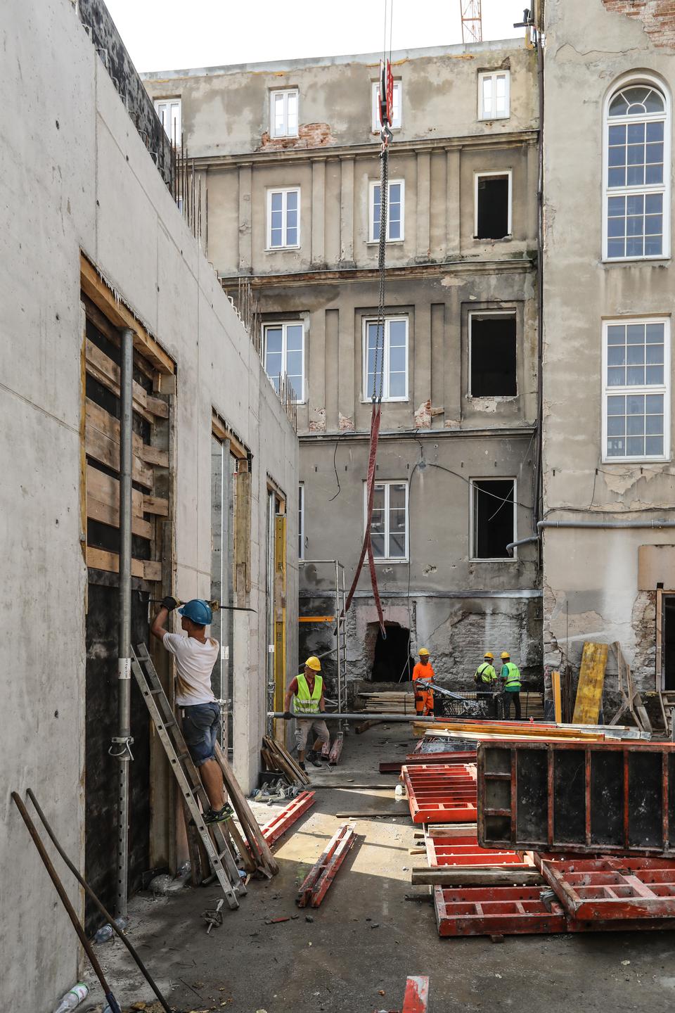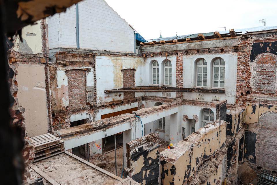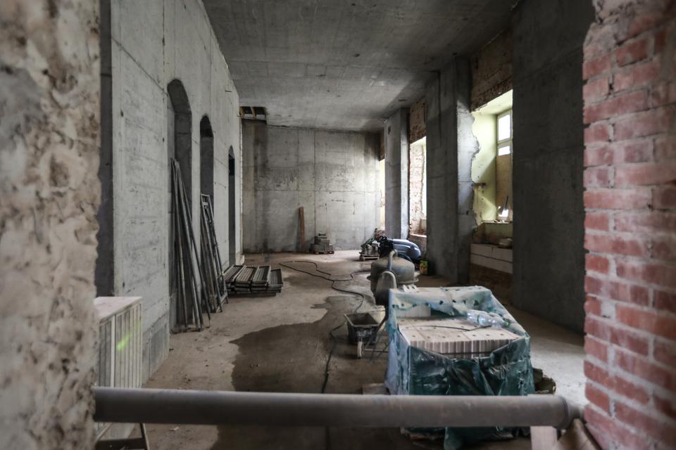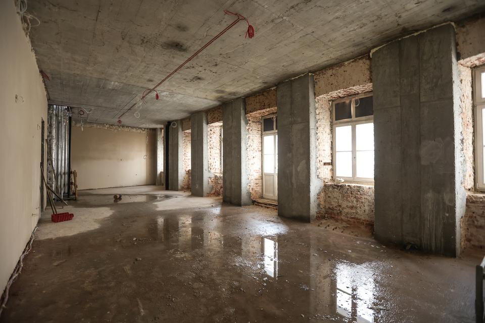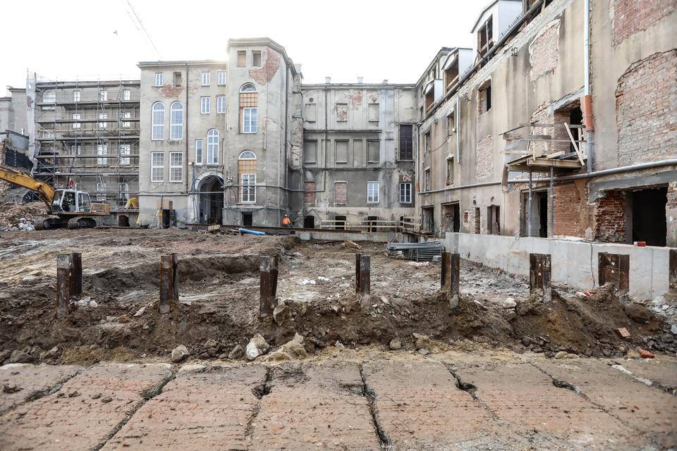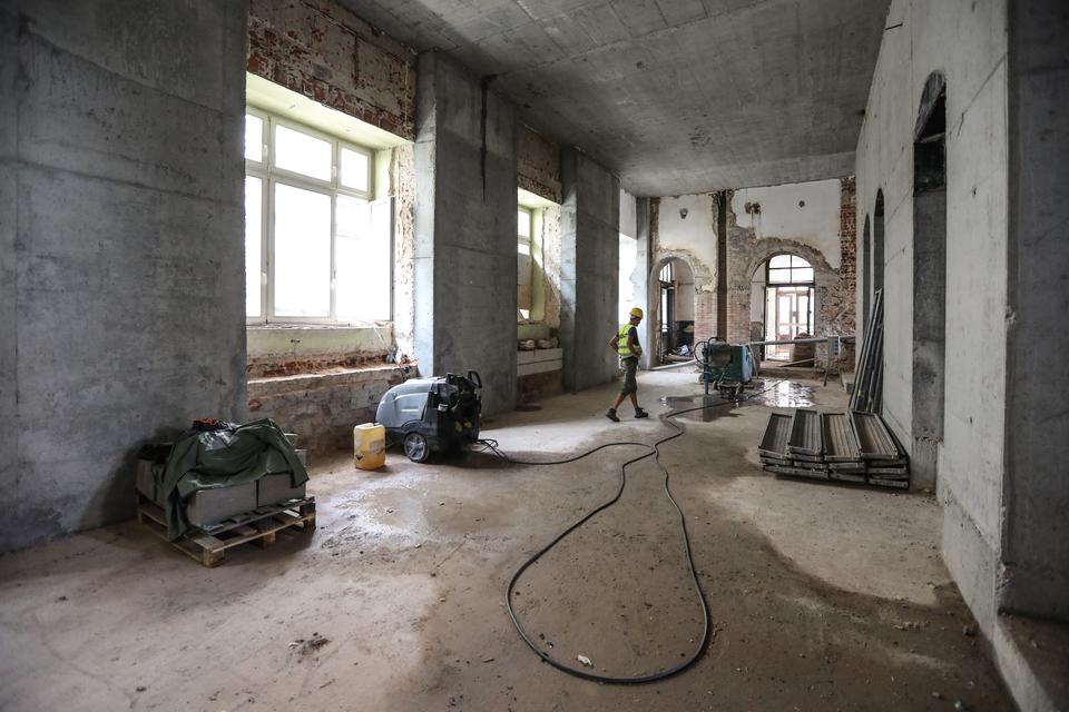 The first building works and advanced demolition works are being done at the construction site in 32 Sienkiewicza street. Installation and freight elevator were deconstructed. Disassembly of window frames and doors is taking place, as well as demolition of some partition walls and lining. Liquidation holes are being immured and walls are being strengthened. The ceilings in the main building are also being prepared for demolition.