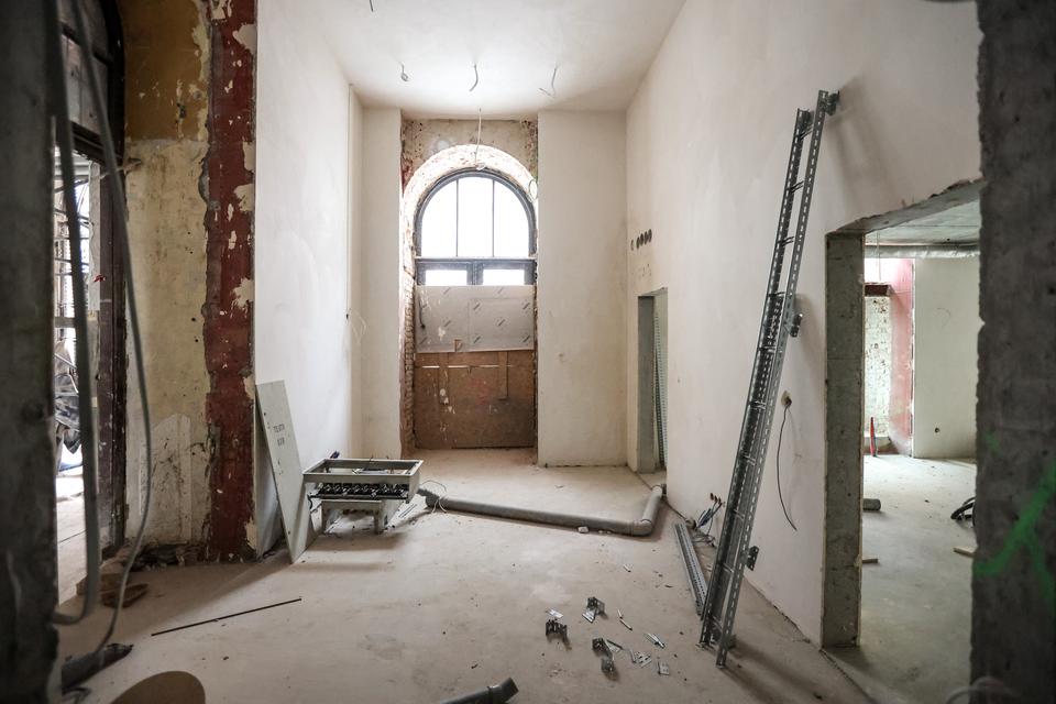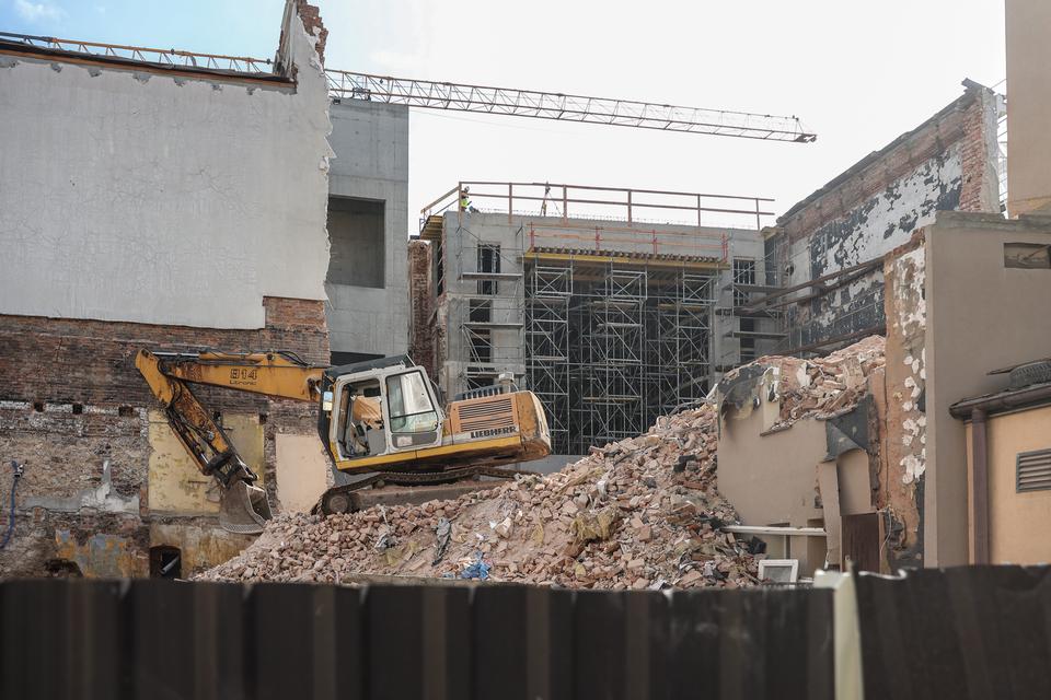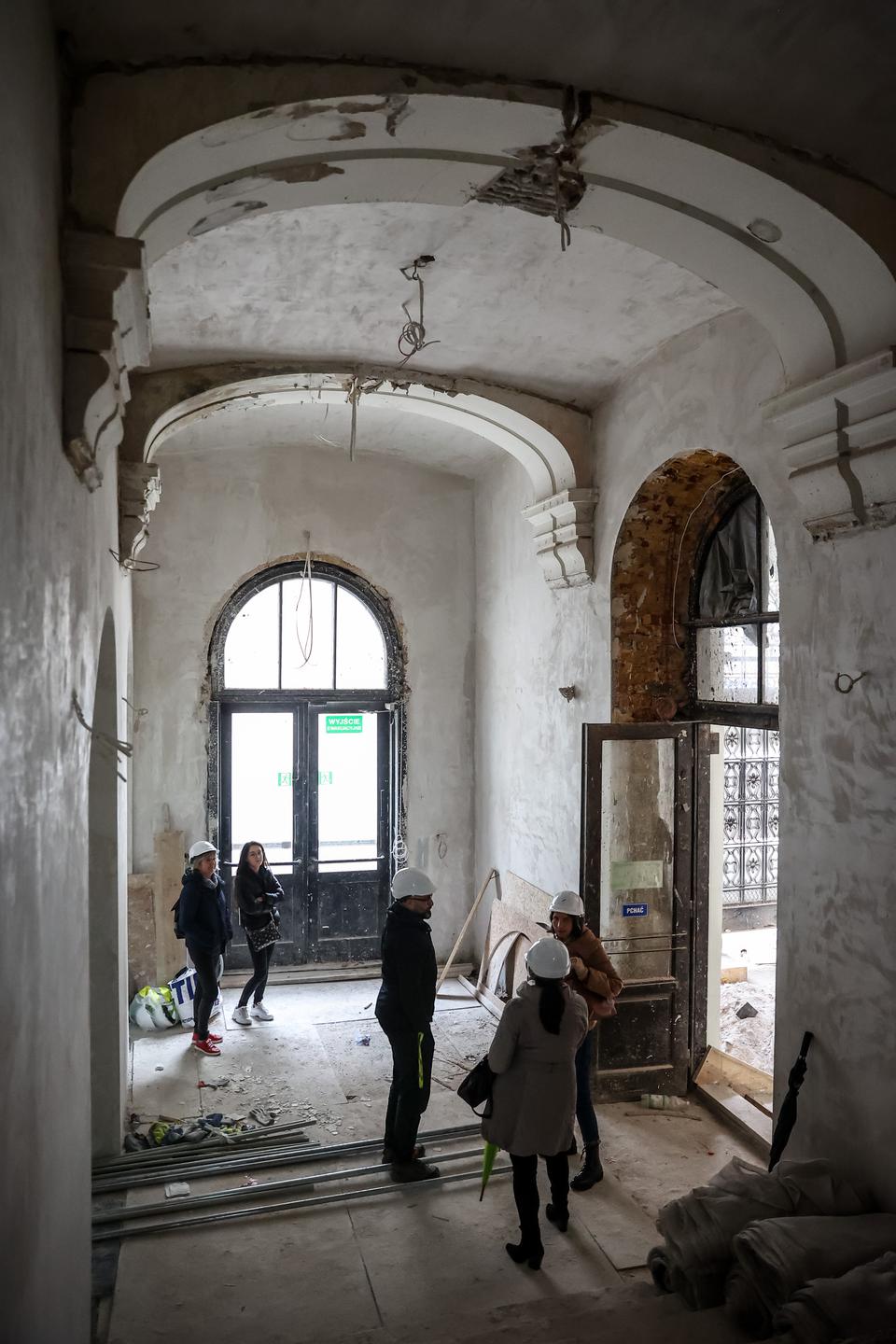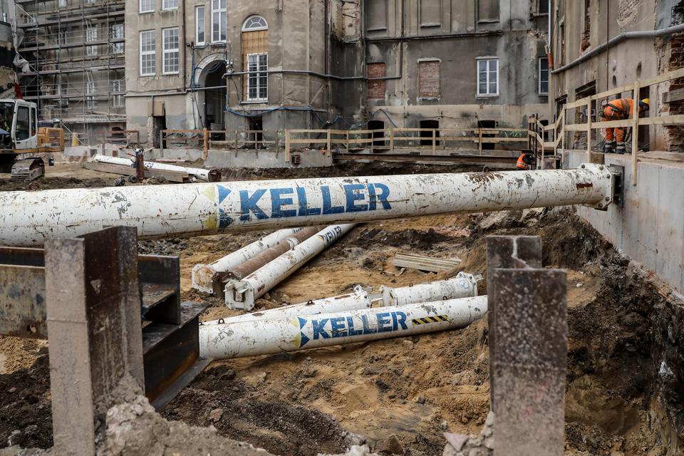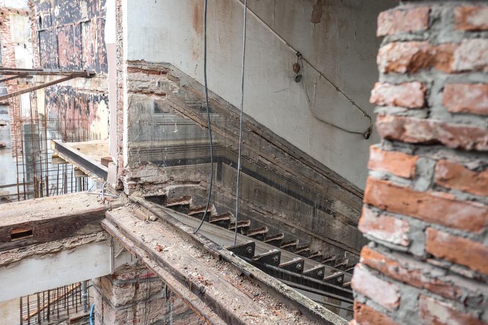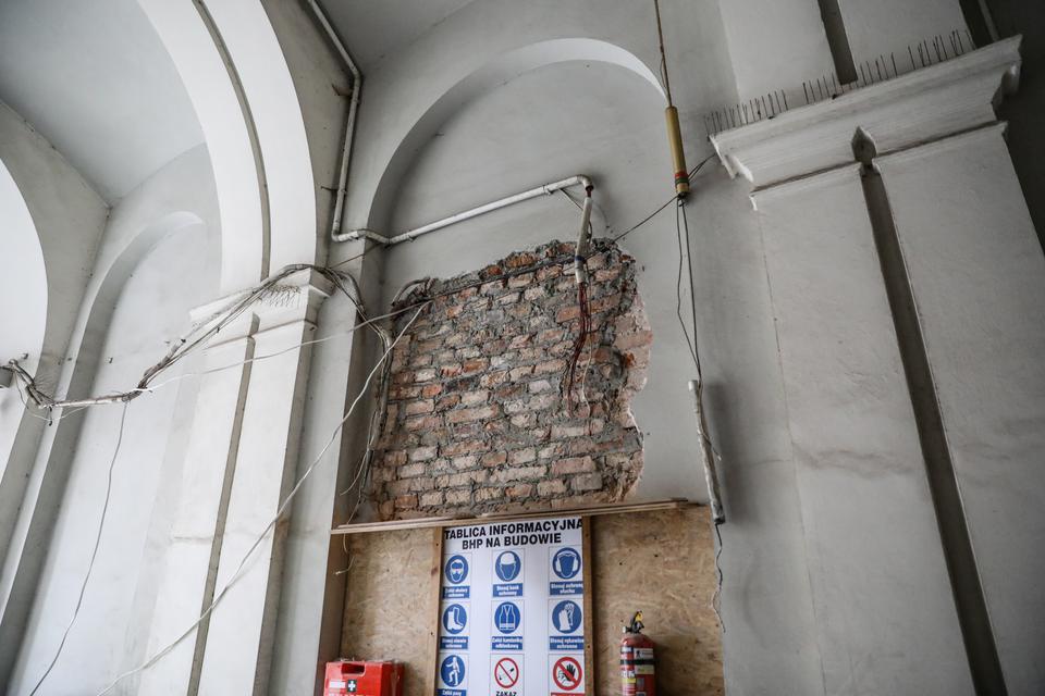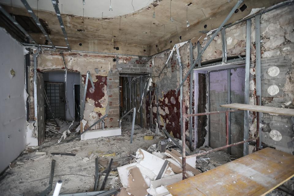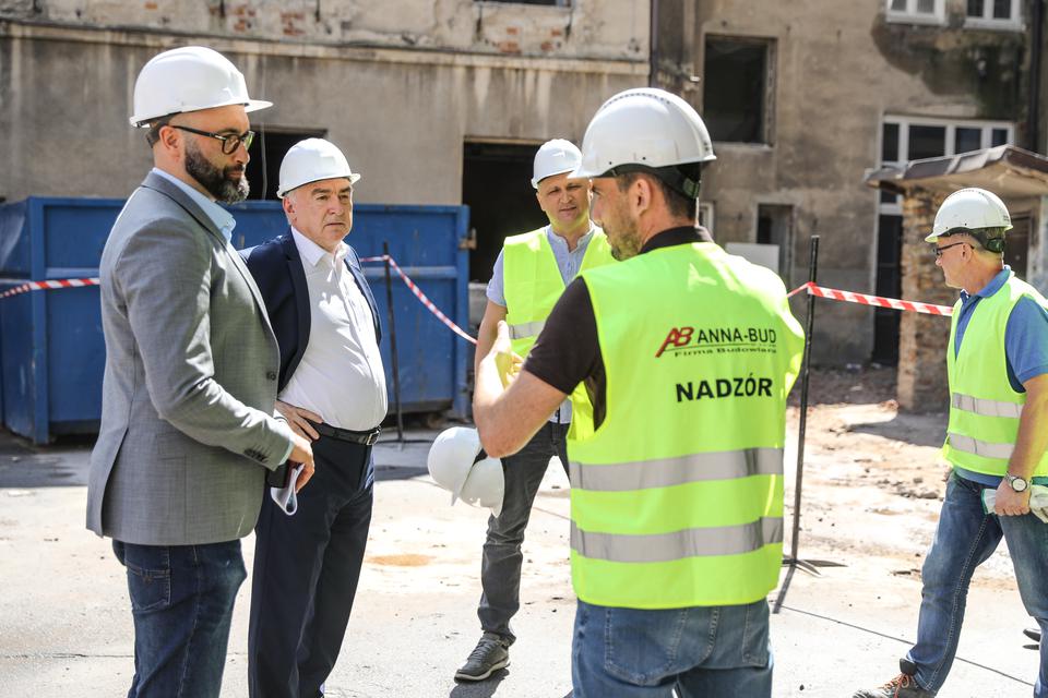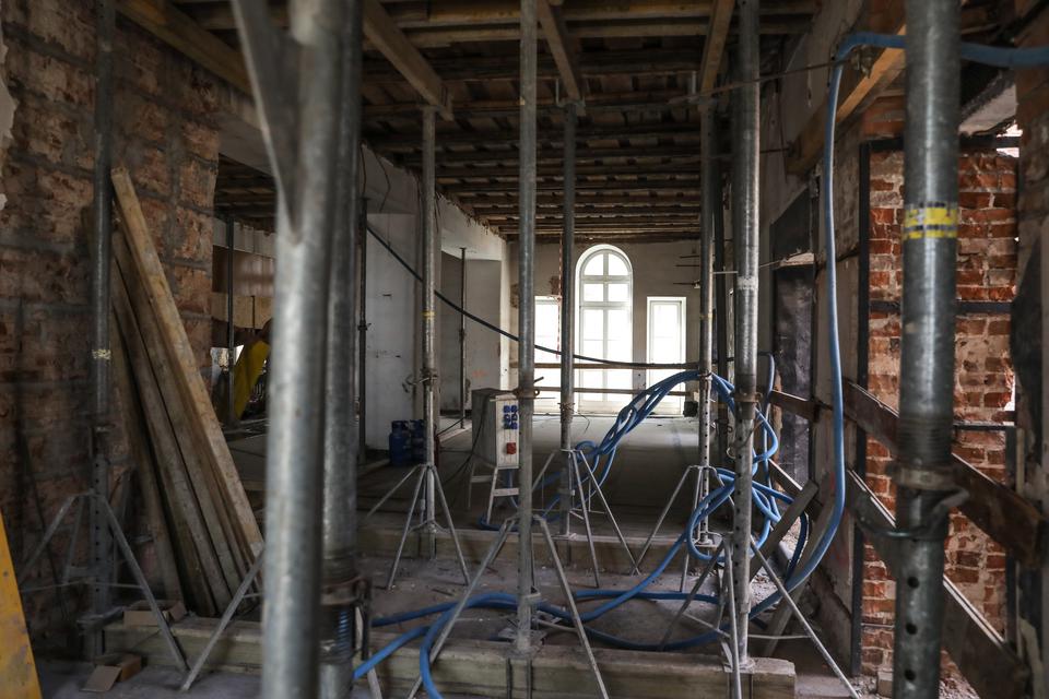 The first building works and advanced demolition works are being done at the construction site in 32 Sienkiewicza street. Installation and freight elevator were deconstructed. Disassembly of window frames and doors is taking place, as well as demolition of some partition walls and lining. Liquidation holes are being immured and walls are being strengthened. The ceilings in the main building are also being prepared for demolition.