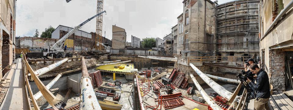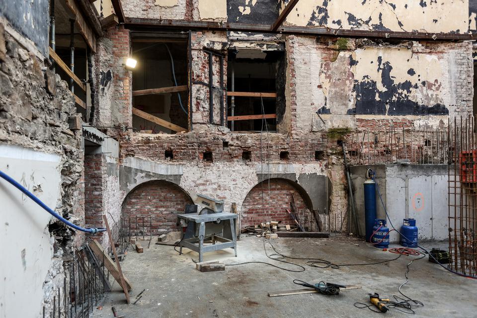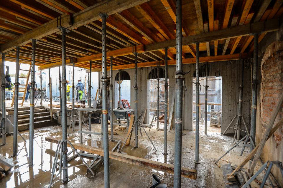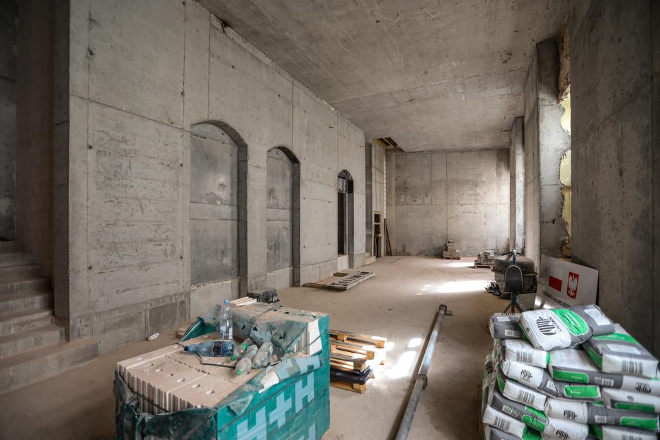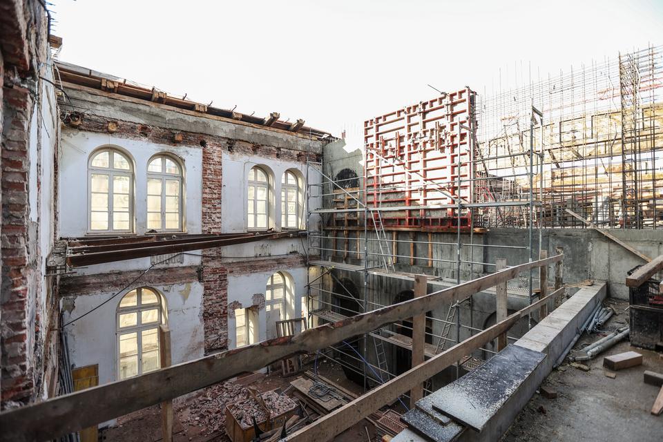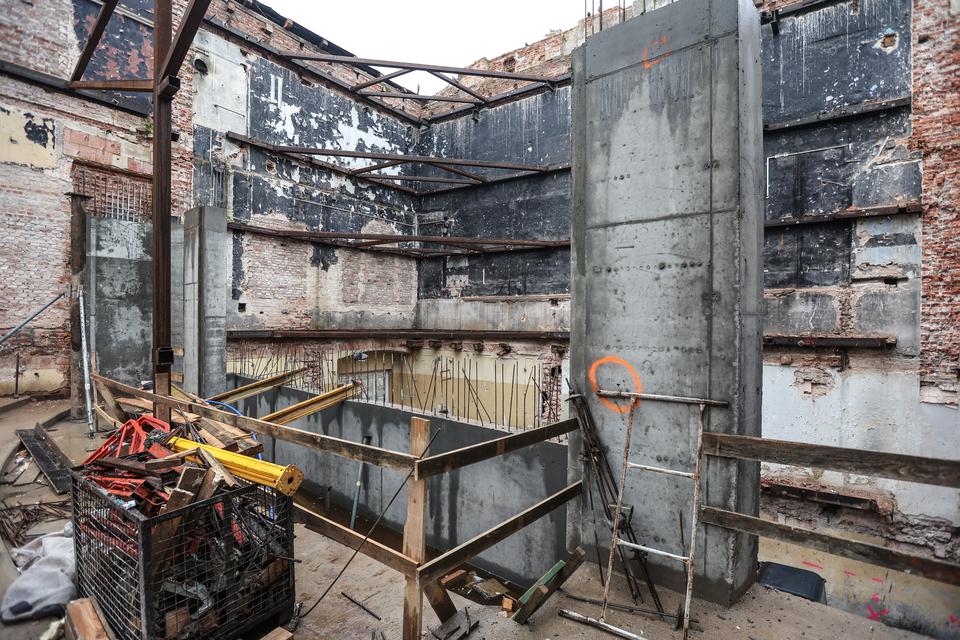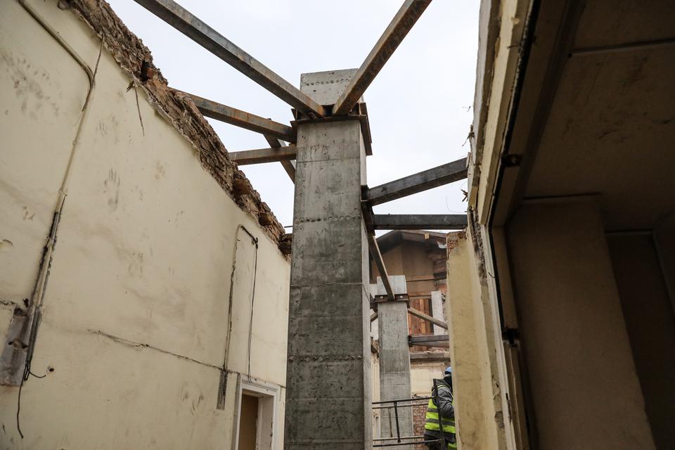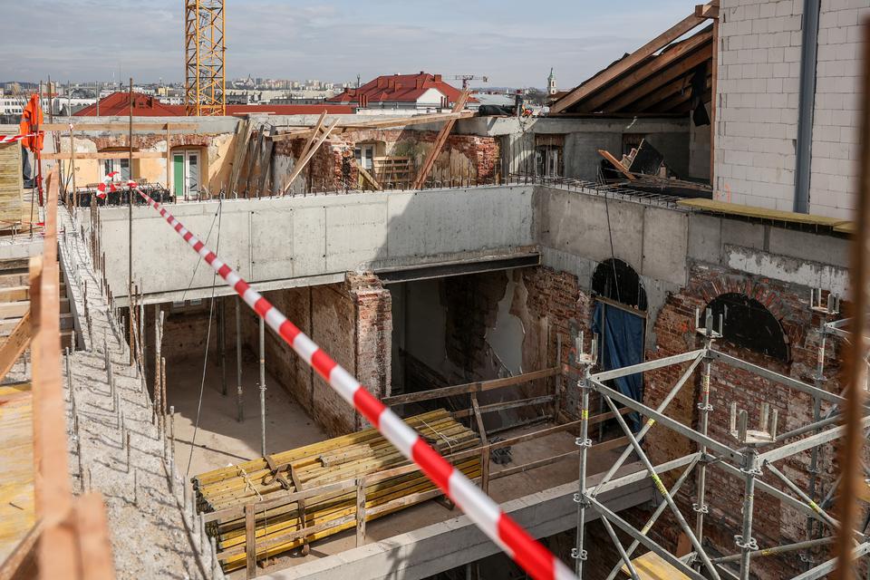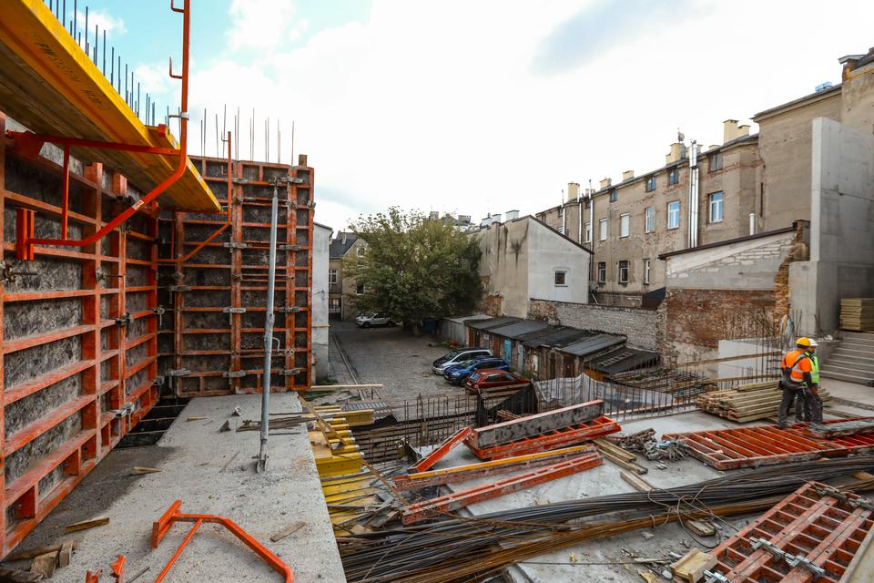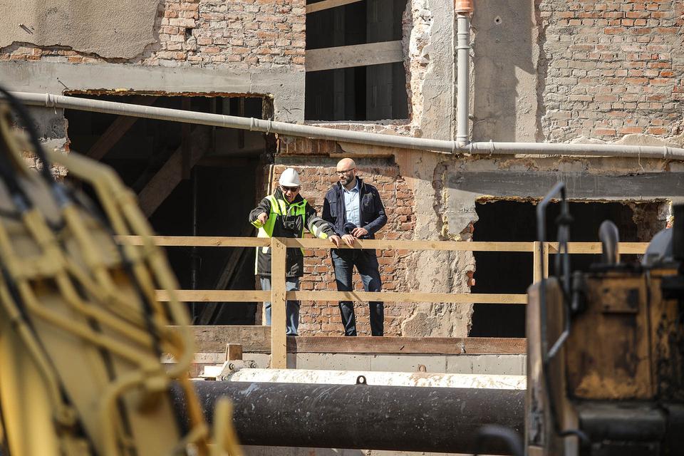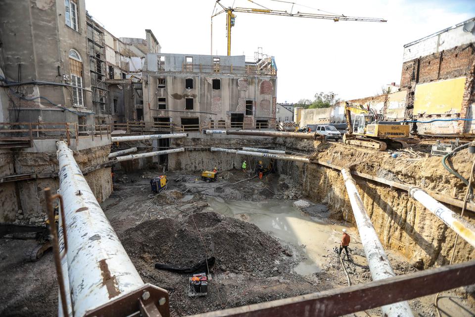 The first building works and advanced demolition works are being done at the construction site in 32 Sienkiewicza street. Installation and freight elevator were deconstructed. Disassembly of window frames and doors is taking place, as well as demolition of some partition walls and lining. Liquidation holes are being immured and walls are being strengthened. The ceilings in the main building are also being prepared for demolition.
