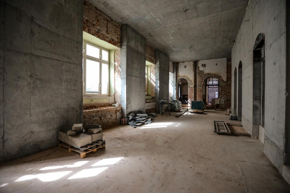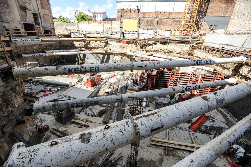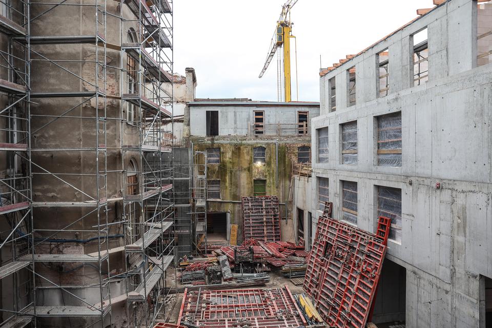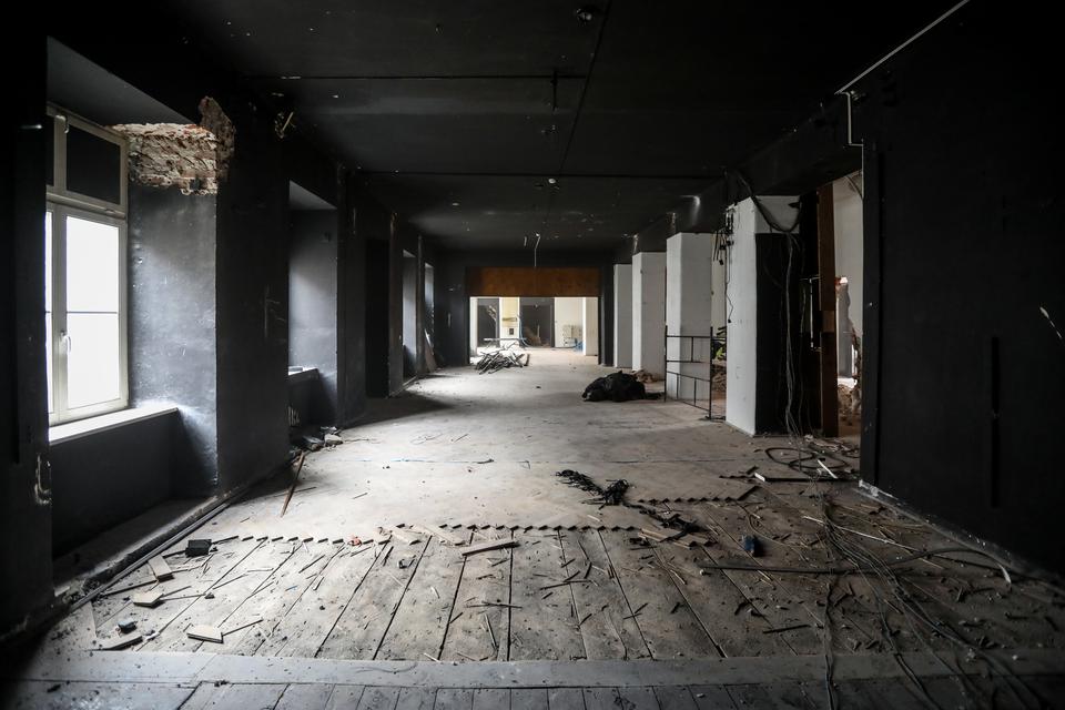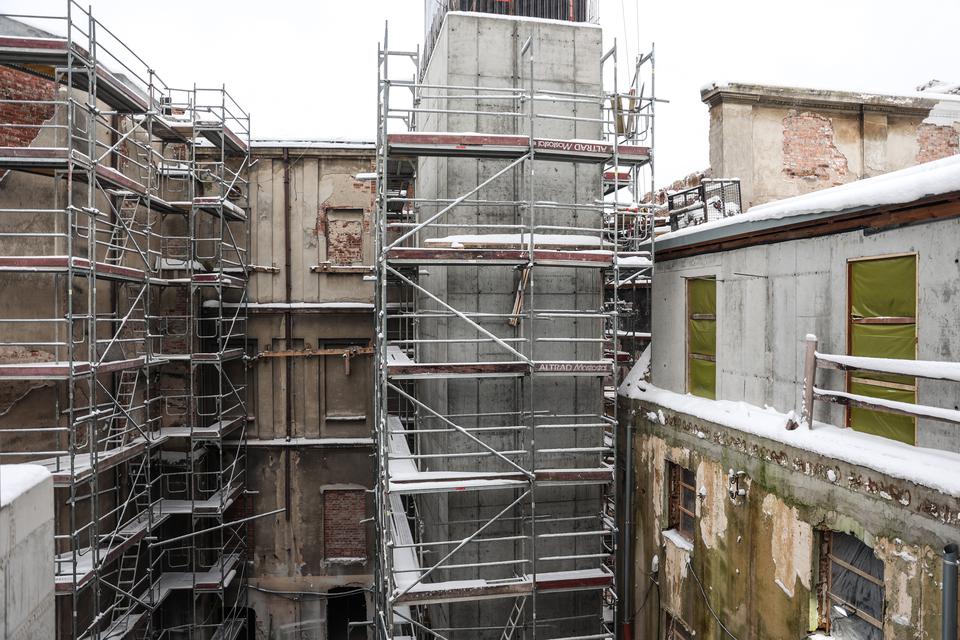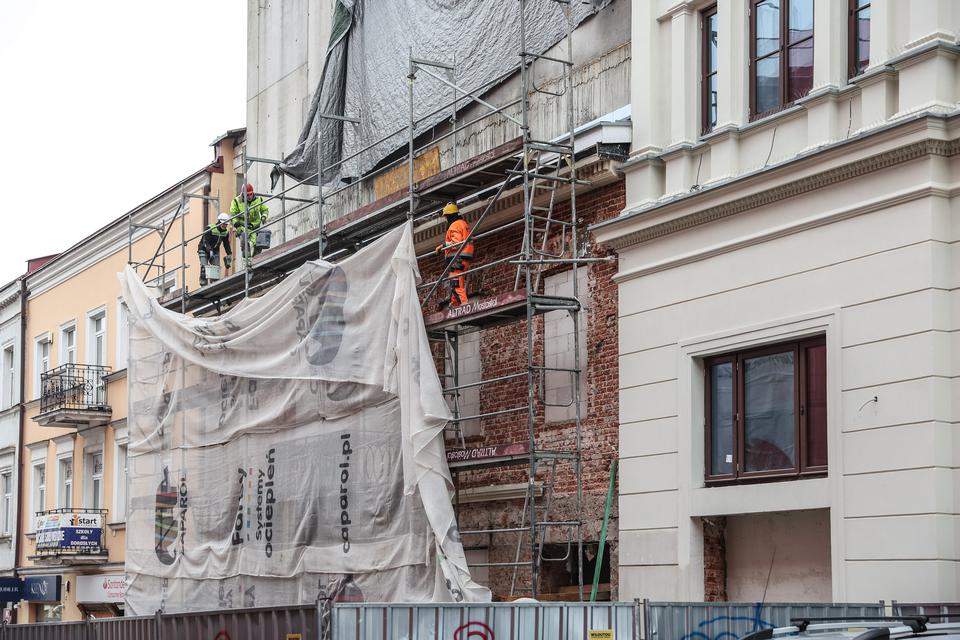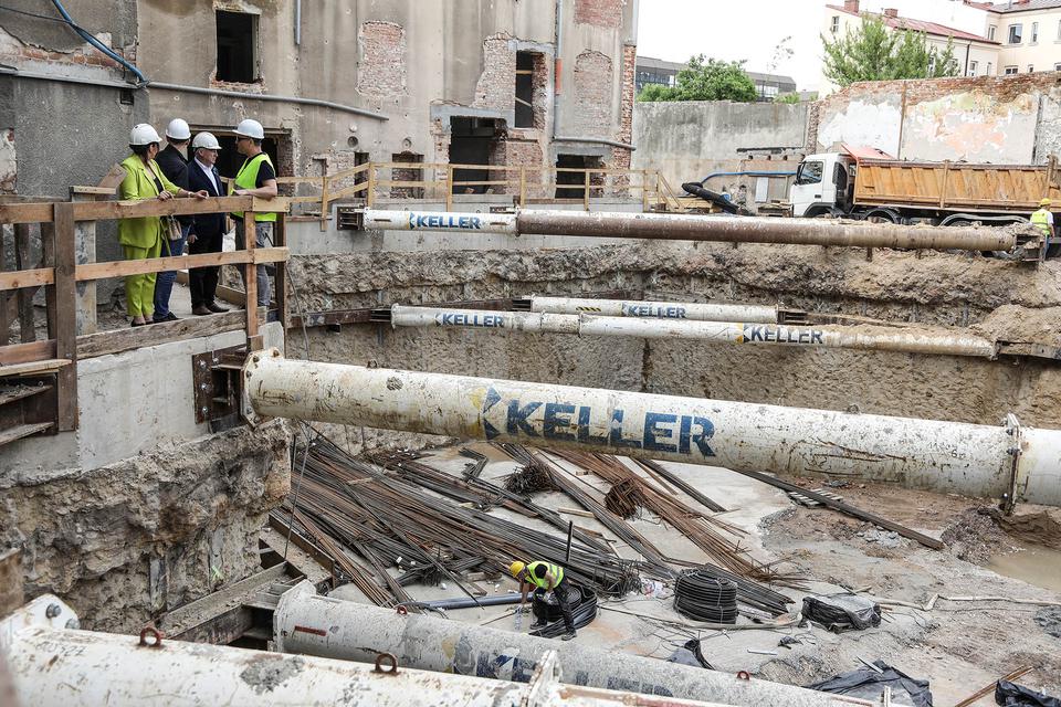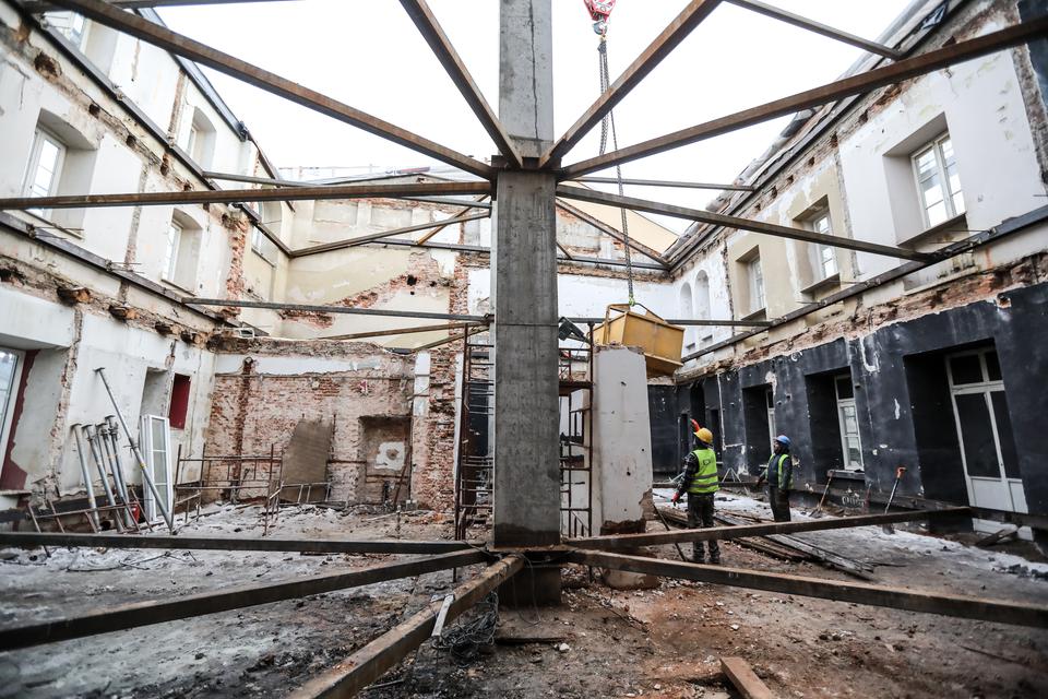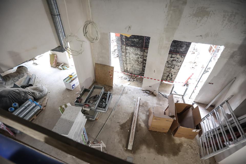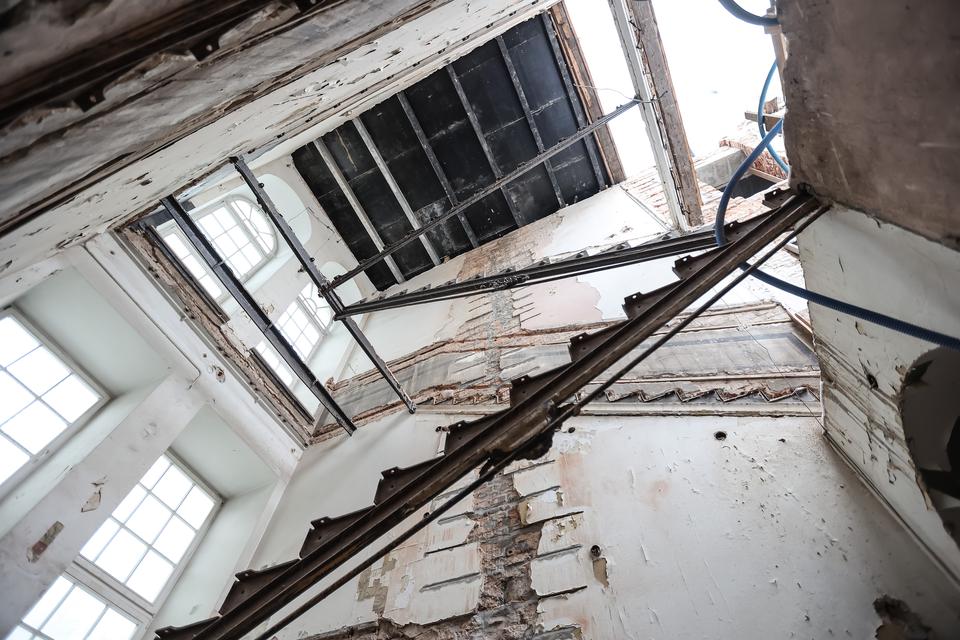 The first building works and advanced demolition works are being done at the construction site in 32 Sienkiewicza street. Installation and freight elevator were deconstructed. Disassembly of window frames and doors is taking place, as well as demolition of some partition walls and lining. Liquidation holes are being immured and walls are being strengthened. The ceilings in the main building are also being prepared for demolition.