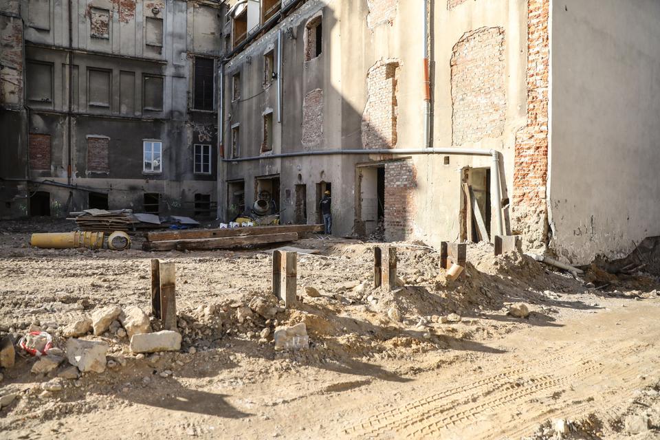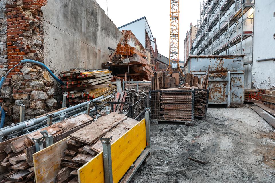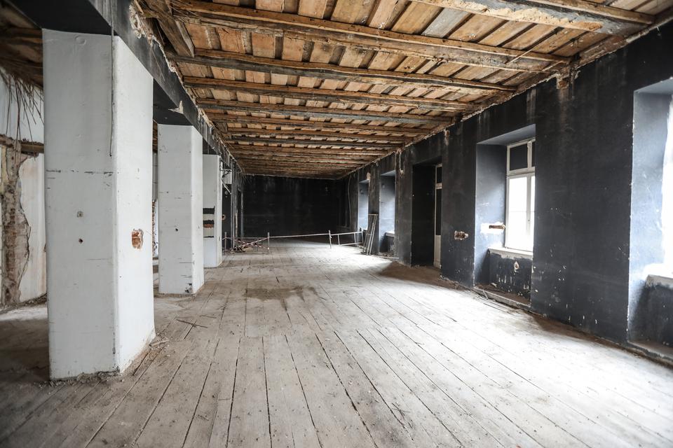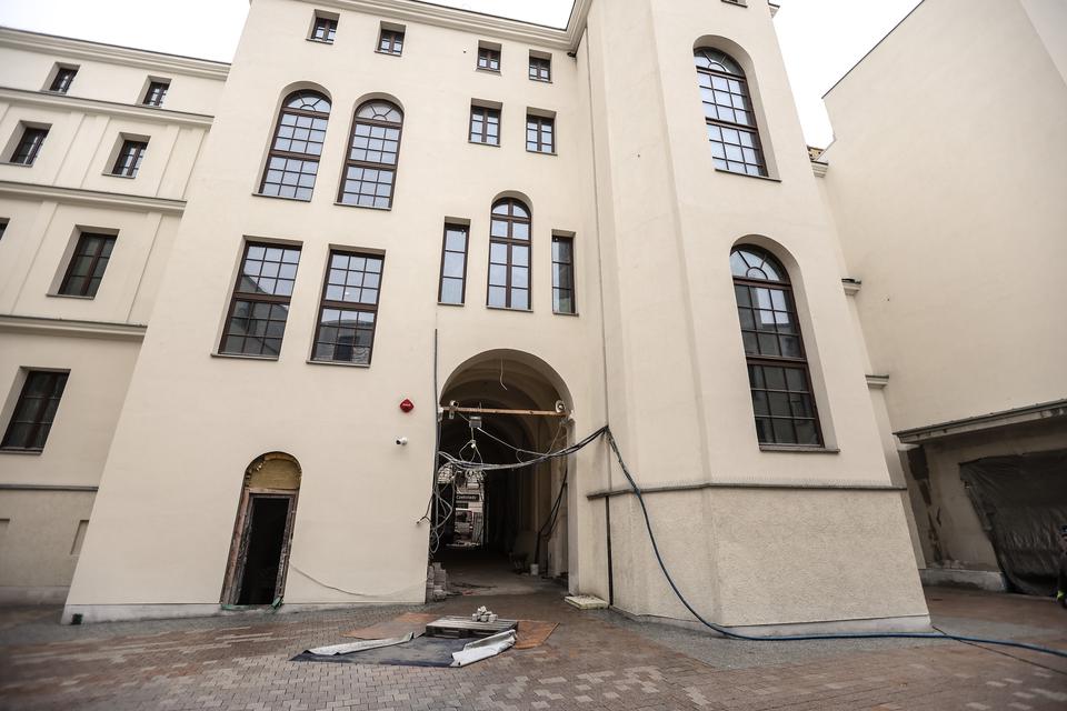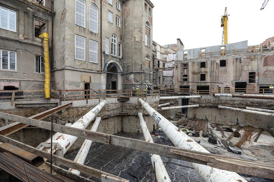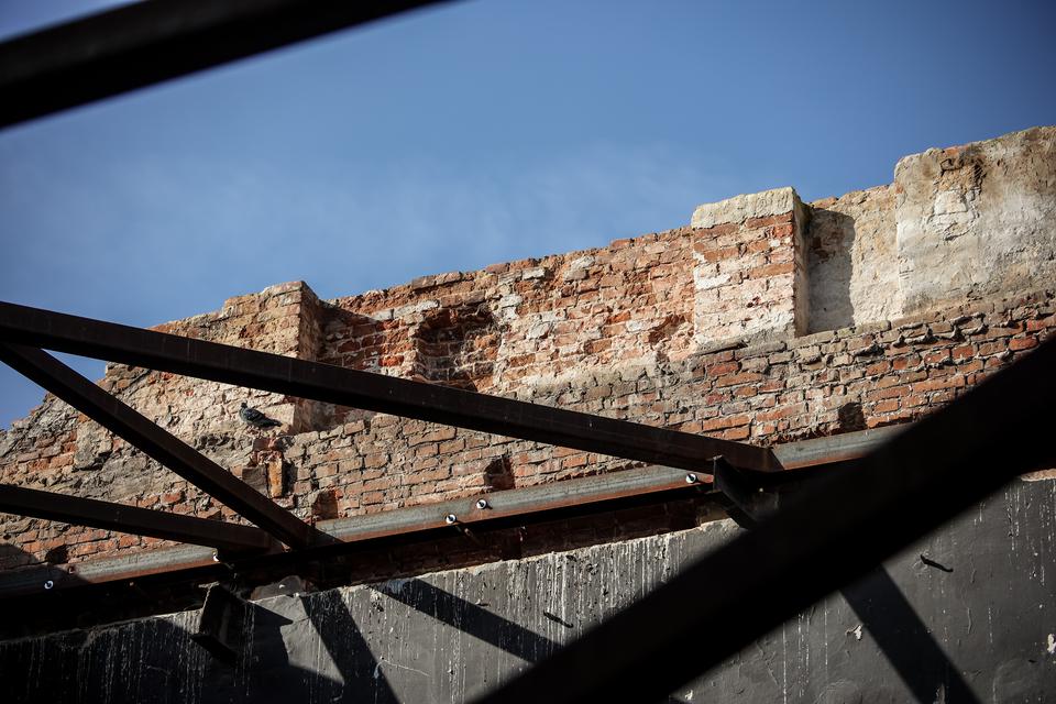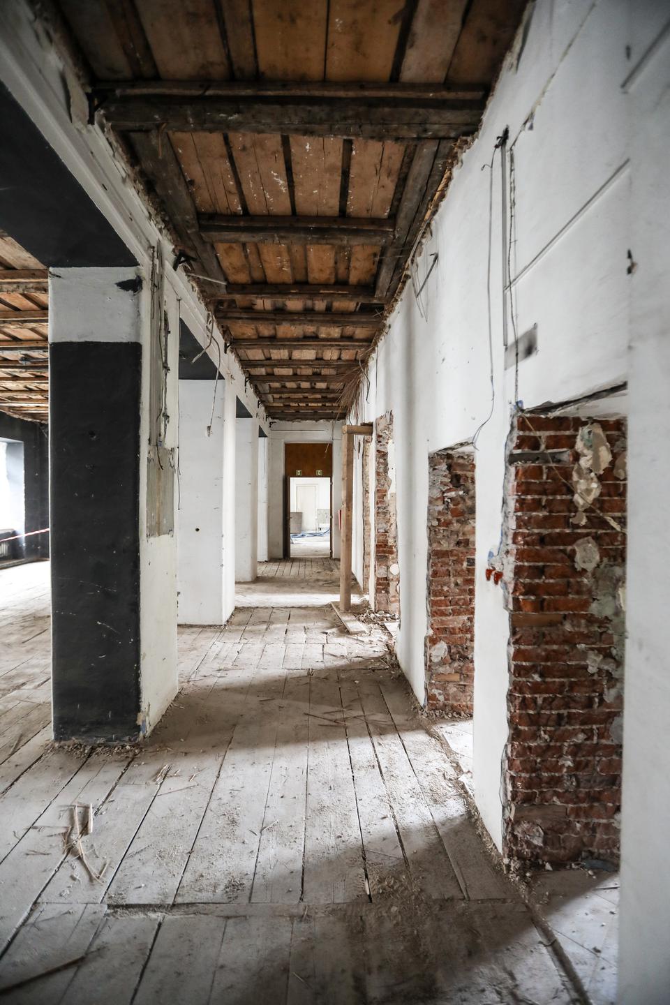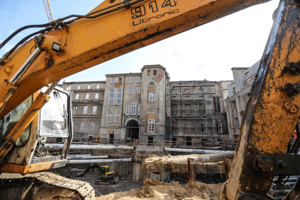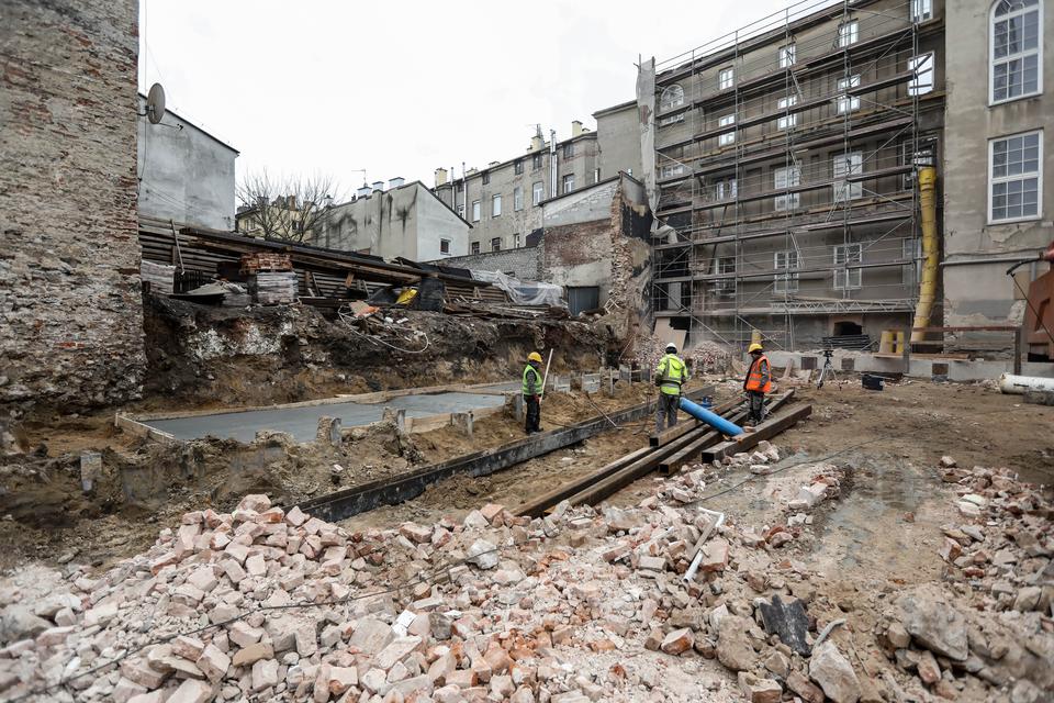 The first building works and advanced demolition works are being done at the construction site in 32 Sienkiewicza street. Installation and freight elevator were deconstructed. Disassembly of window frames and doors is taking place, as well as demolition of some partition walls and lining. Liquidation holes are being immured and walls are being strengthened. The ceilings in the main building are also being prepared for demolition.