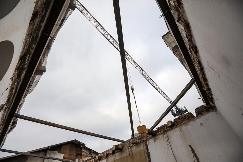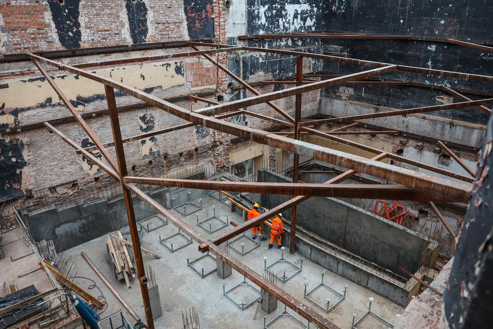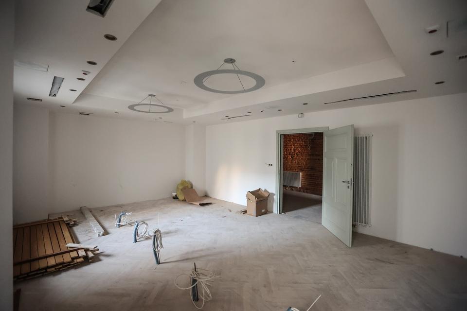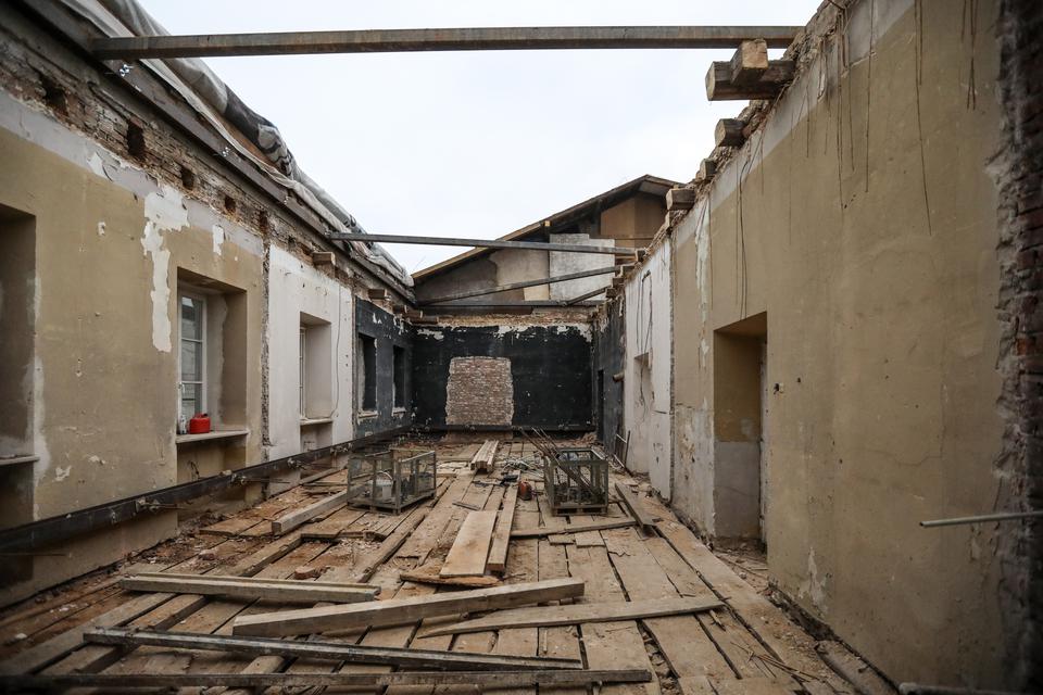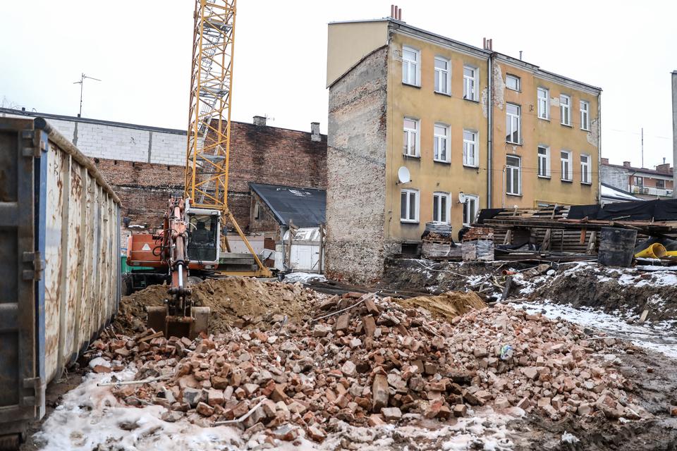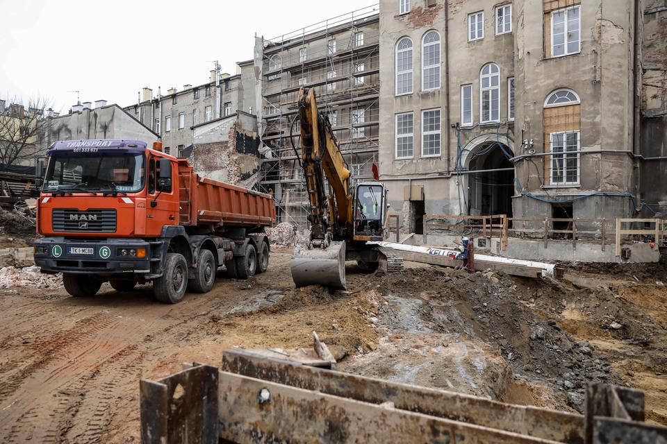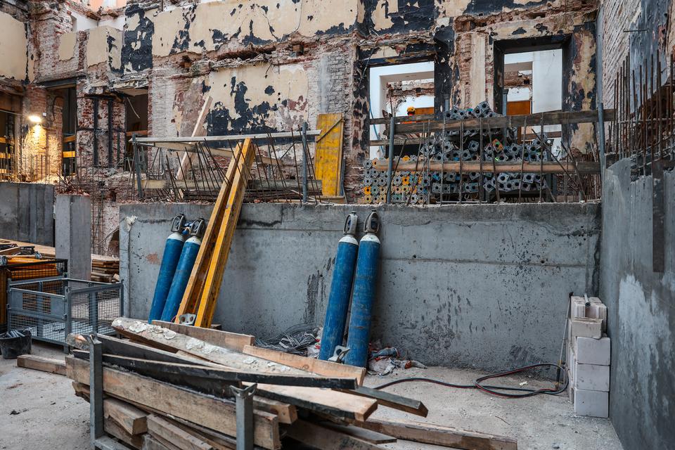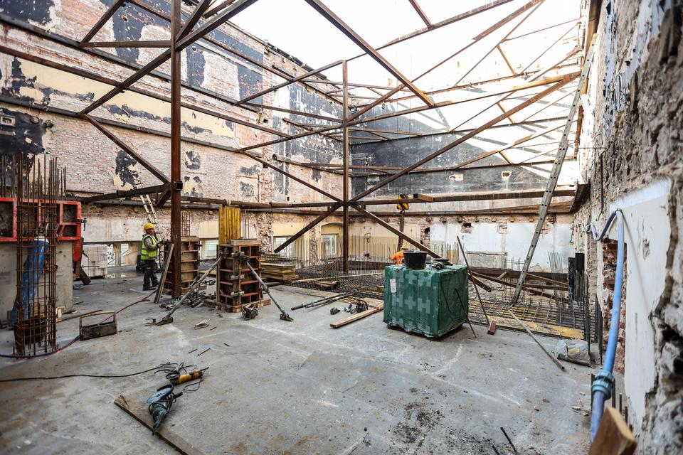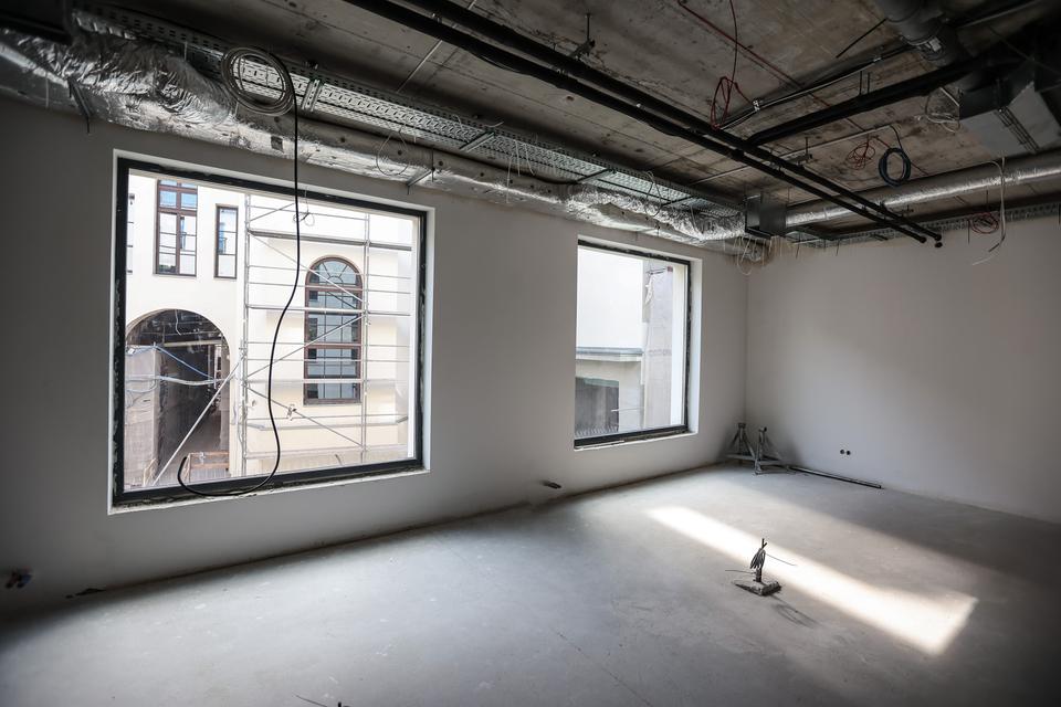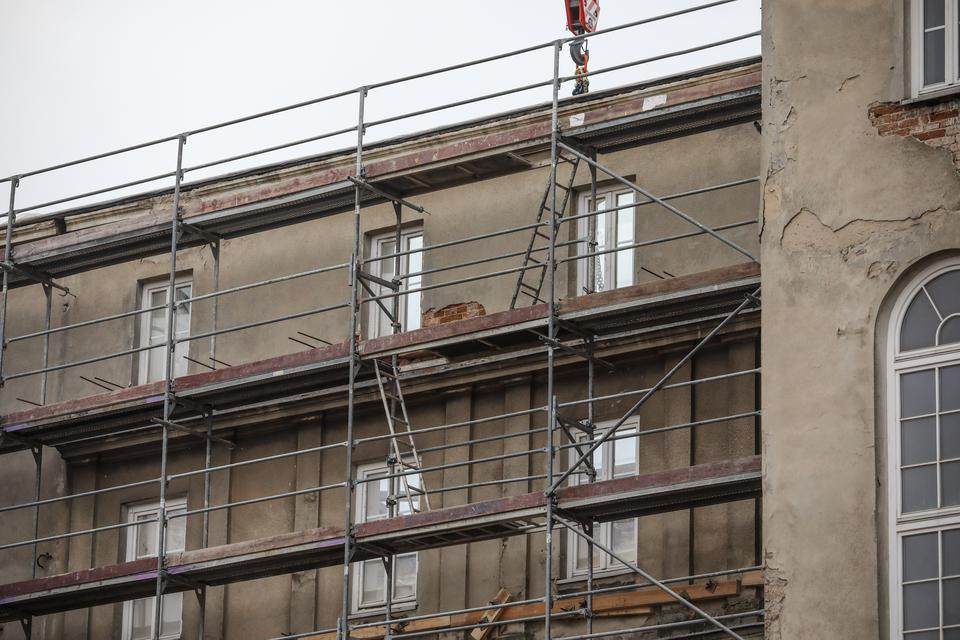 The first building works and advanced demolition works are being done at the construction site in 32 Sienkiewicza street. Installation and freight elevator were deconstructed. Disassembly of window frames and doors is taking place, as well as demolition of some partition walls and lining. Liquidation holes are being immured and walls are being strengthened. The ceilings in the main building are also being prepared for demolition.