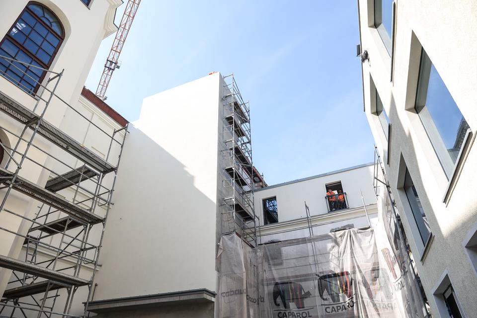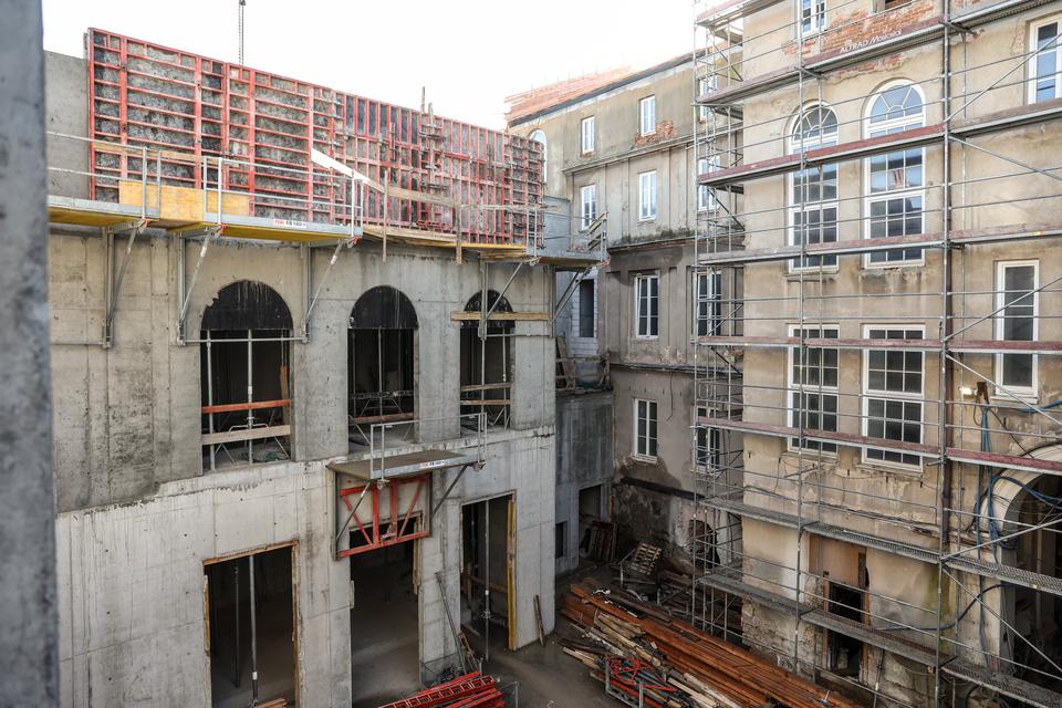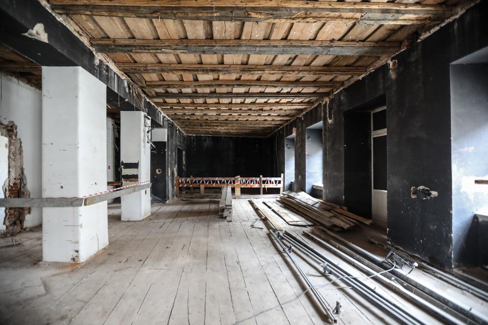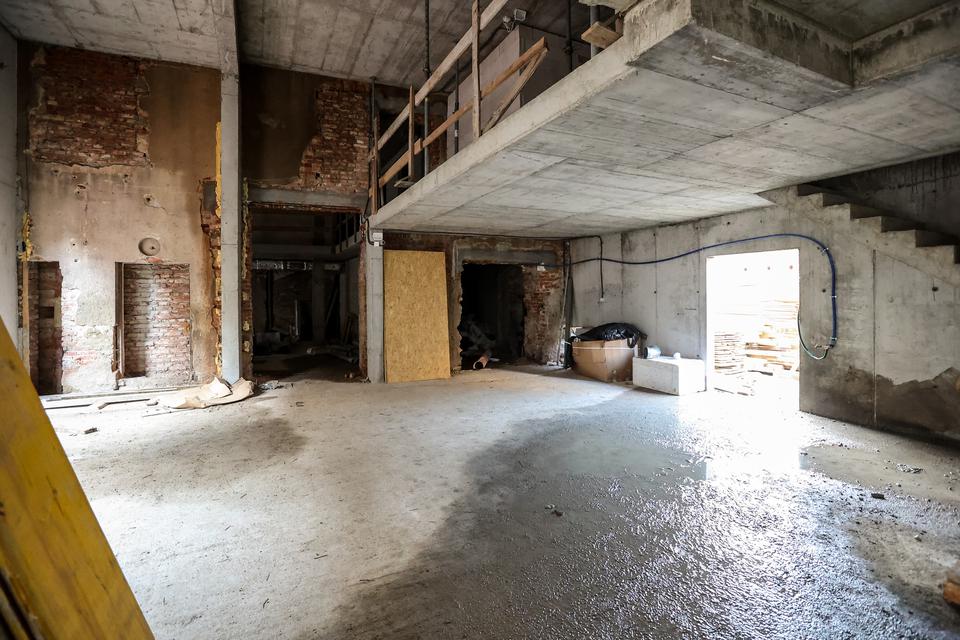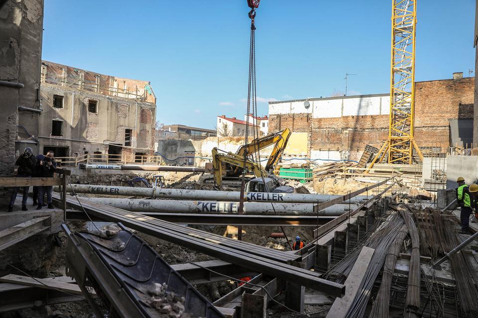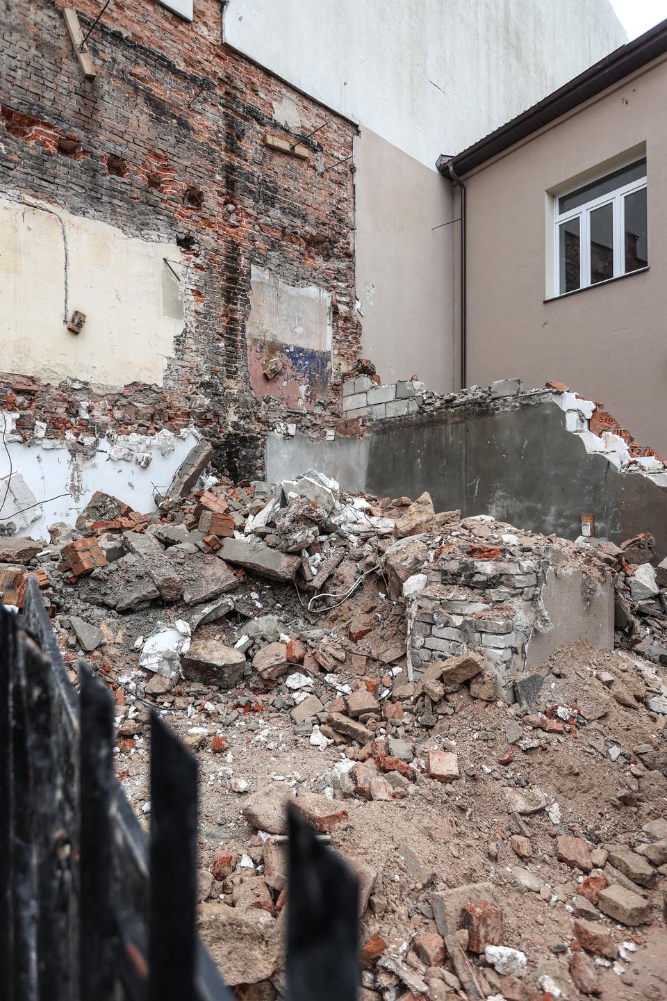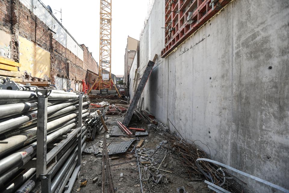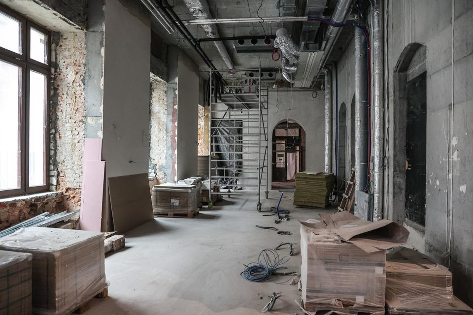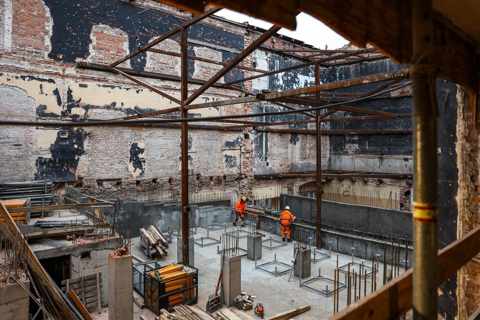 The first building works and advanced demolition works are being done at the construction site in 32 Sienkiewicza street. Installation and freight elevator were deconstructed. Disassembly of window frames and doors is taking place, as well as demolition of some partition walls and lining. Liquidation holes are being immured and walls are being strengthened. The ceilings in the main building are also being prepared for demolition.