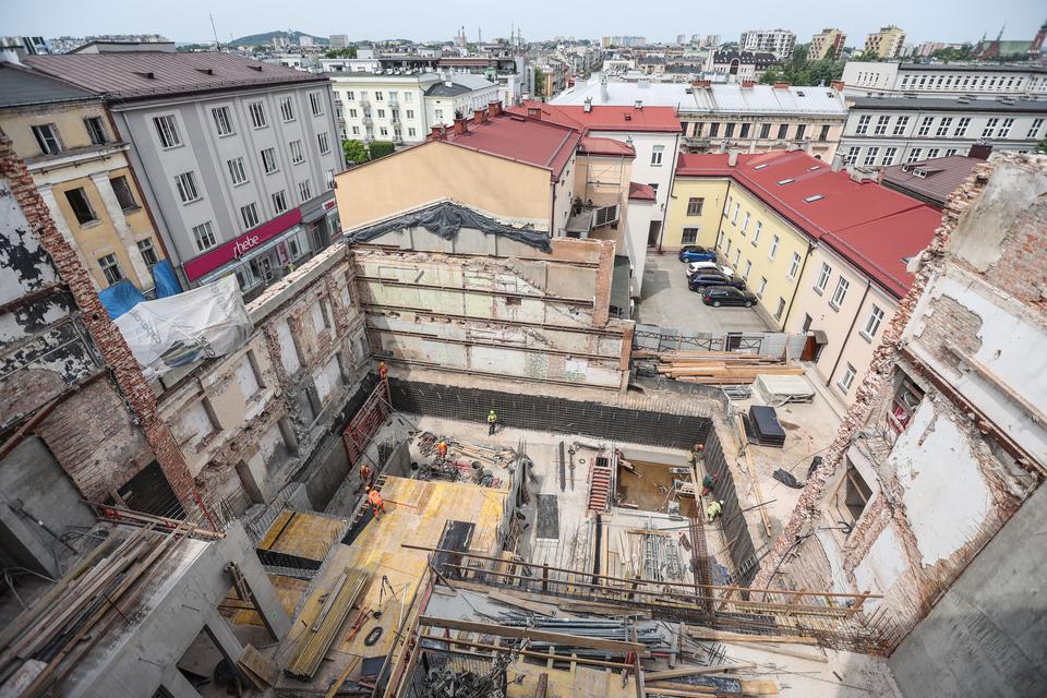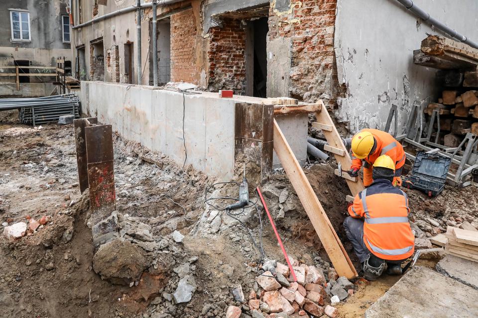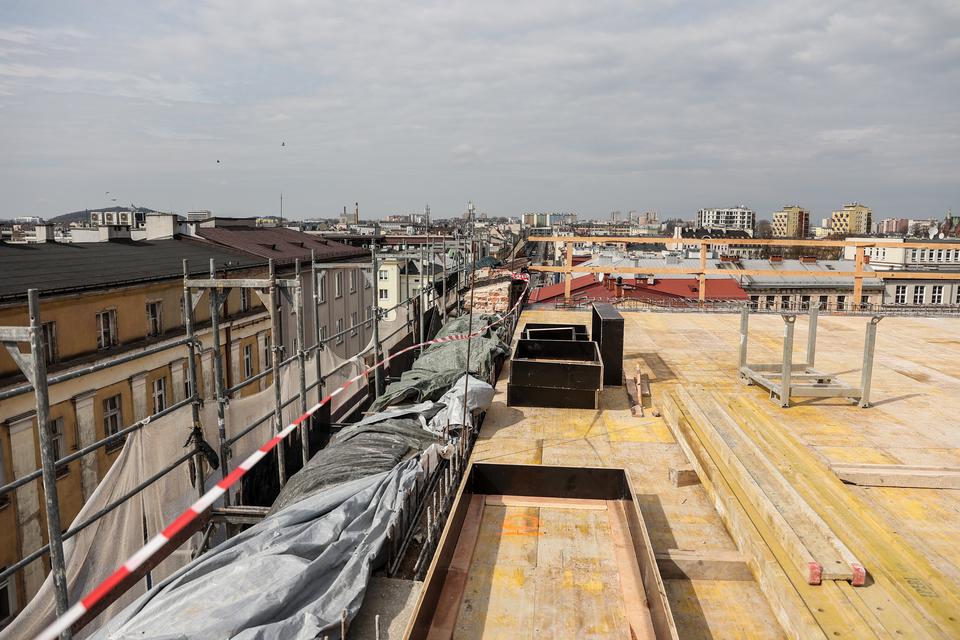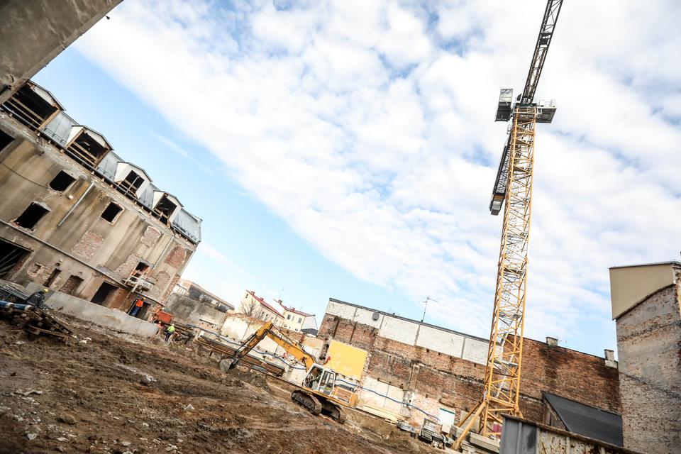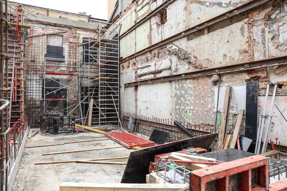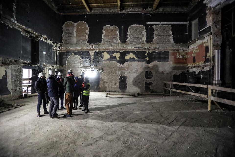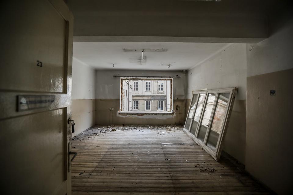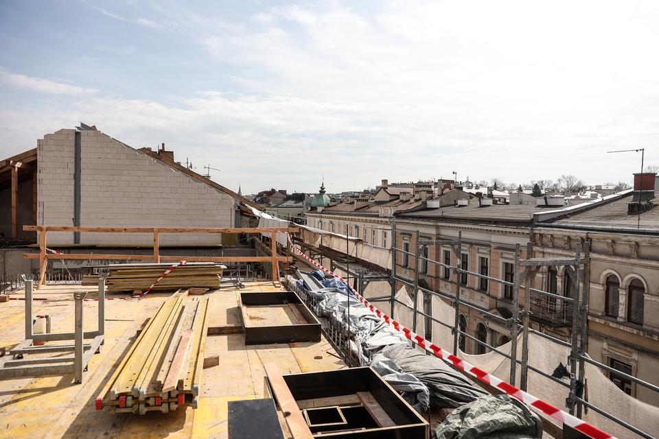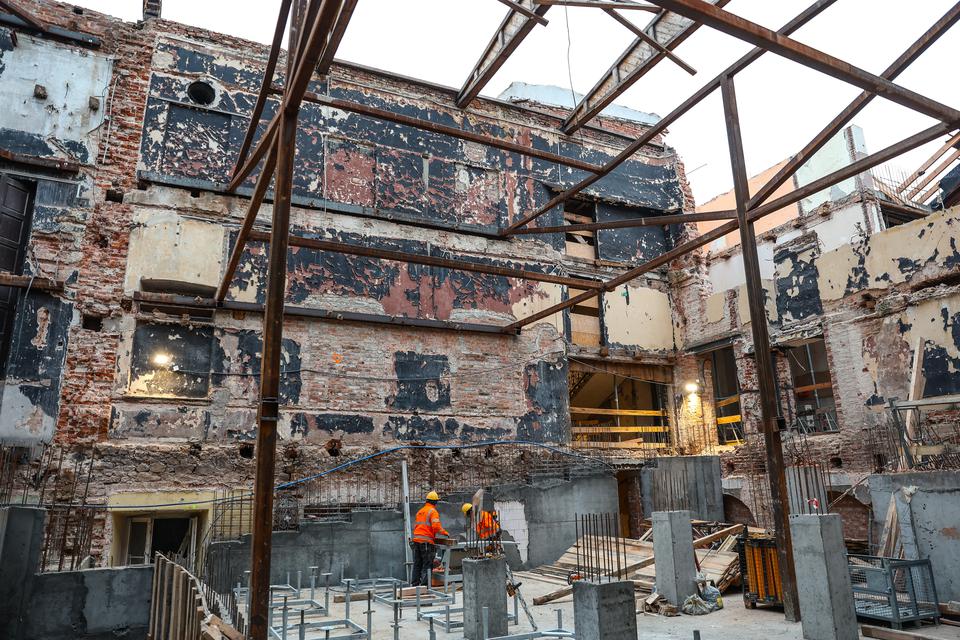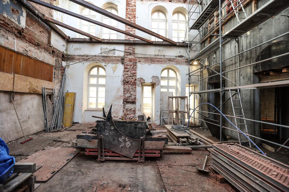 The first building works and advanced demolition works are being done at the construction site in 32 Sienkiewicza street. Installation and freight elevator were deconstructed. Disassembly of window frames and doors is taking place, as well as demolition of some partition walls and lining. Liquidation holes are being immured and walls are being strengthened. The ceilings in the main building are also being prepared for demolition.