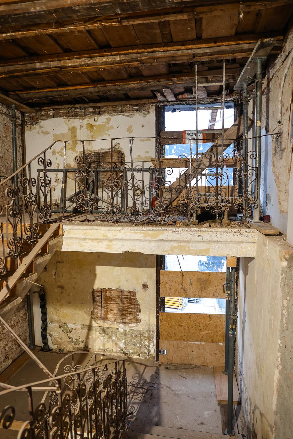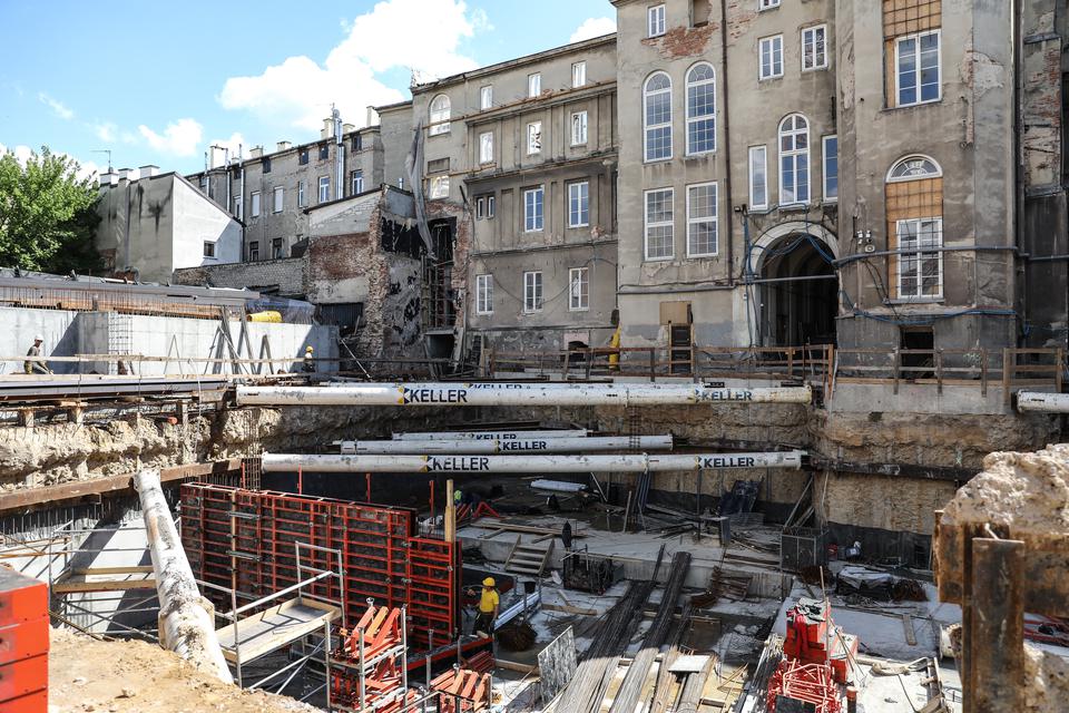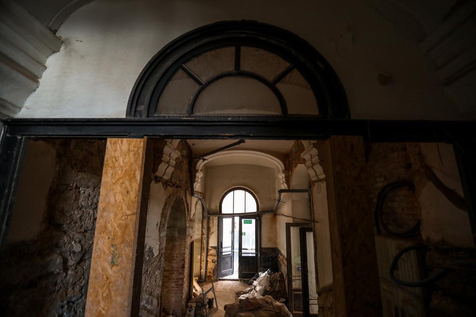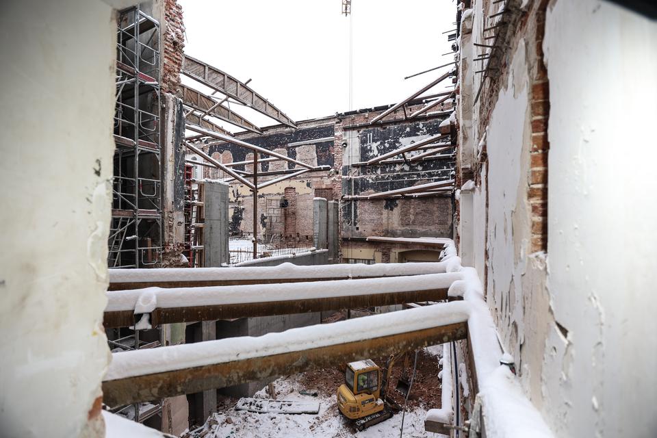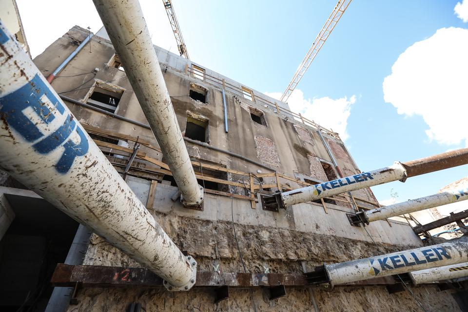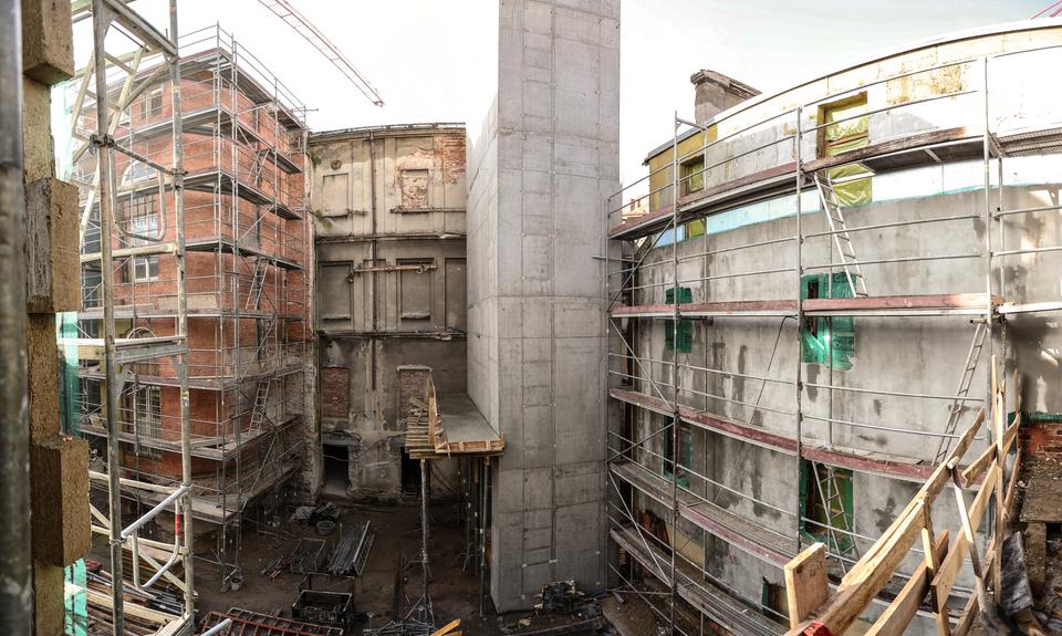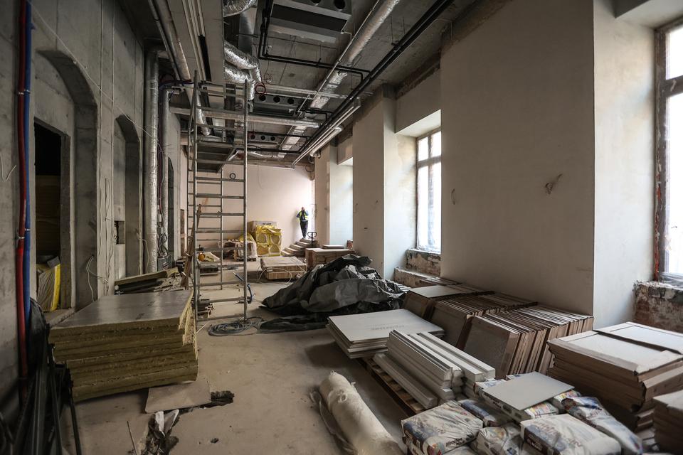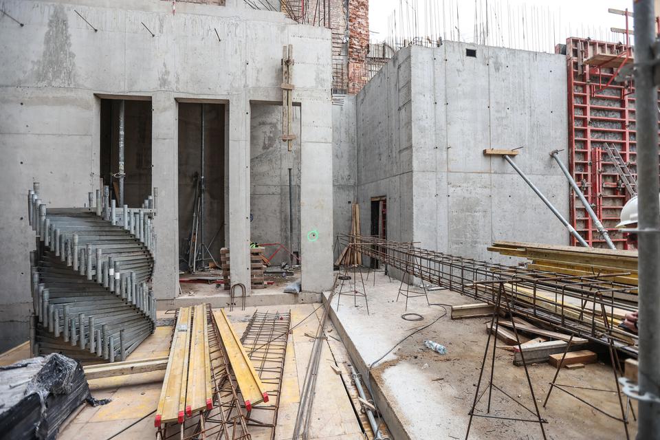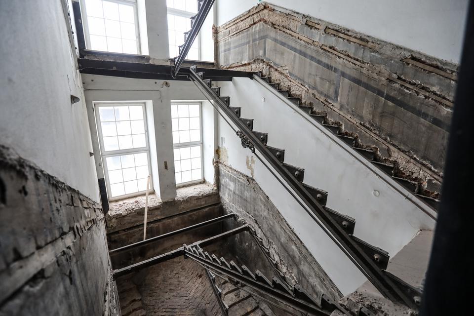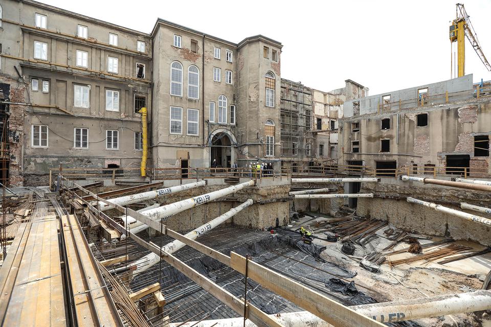 The first building works and advanced demolition works are being done at the construction site in 32 Sienkiewicza street. Installation and freight elevator were deconstructed. Disassembly of window frames and doors is taking place, as well as demolition of some partition walls and lining. Liquidation holes are being immured and walls are being strengthened. The ceilings in the main building are also being prepared for demolition.