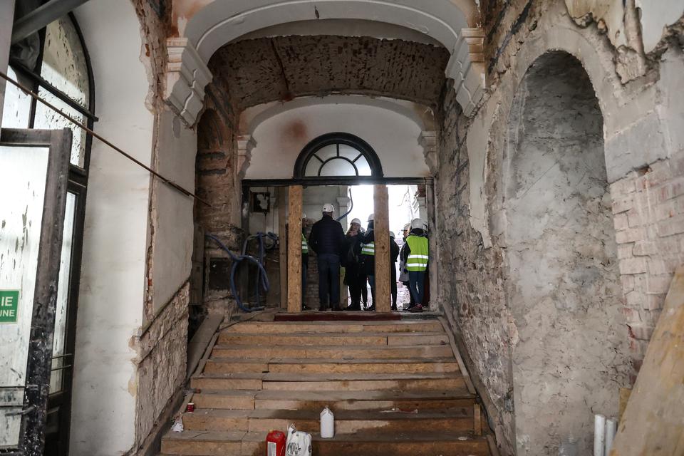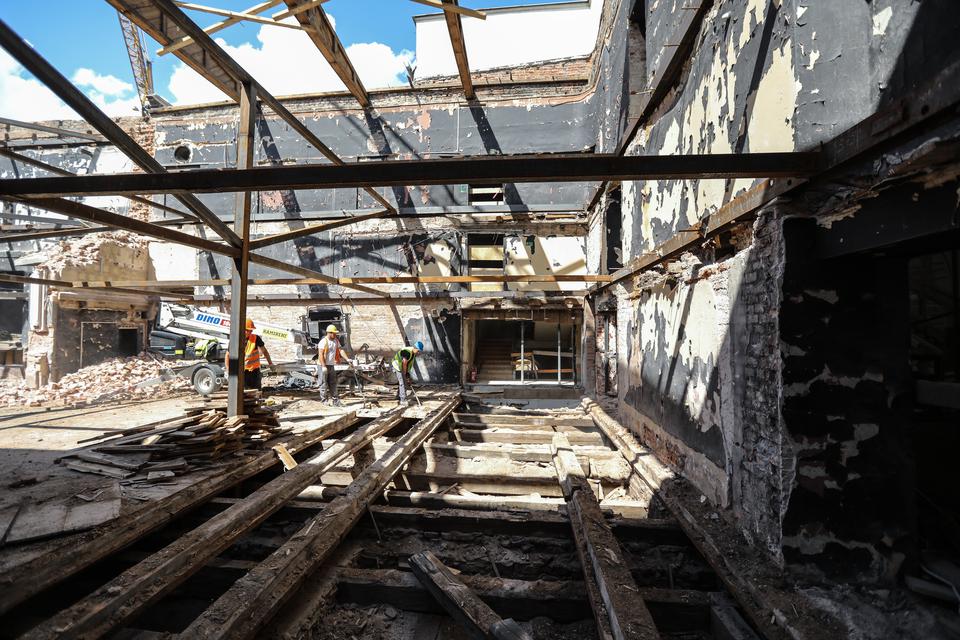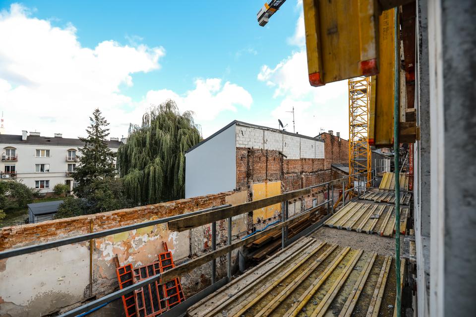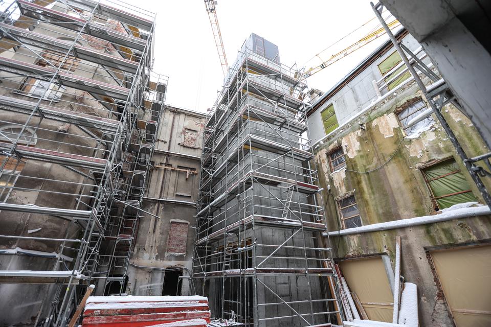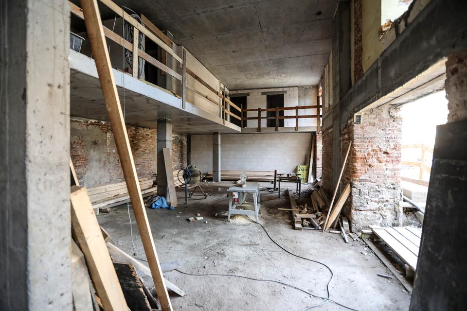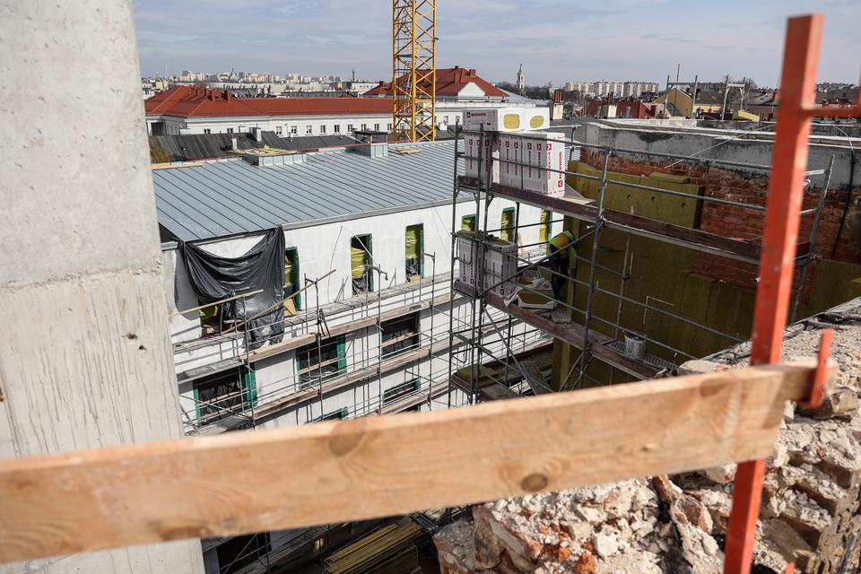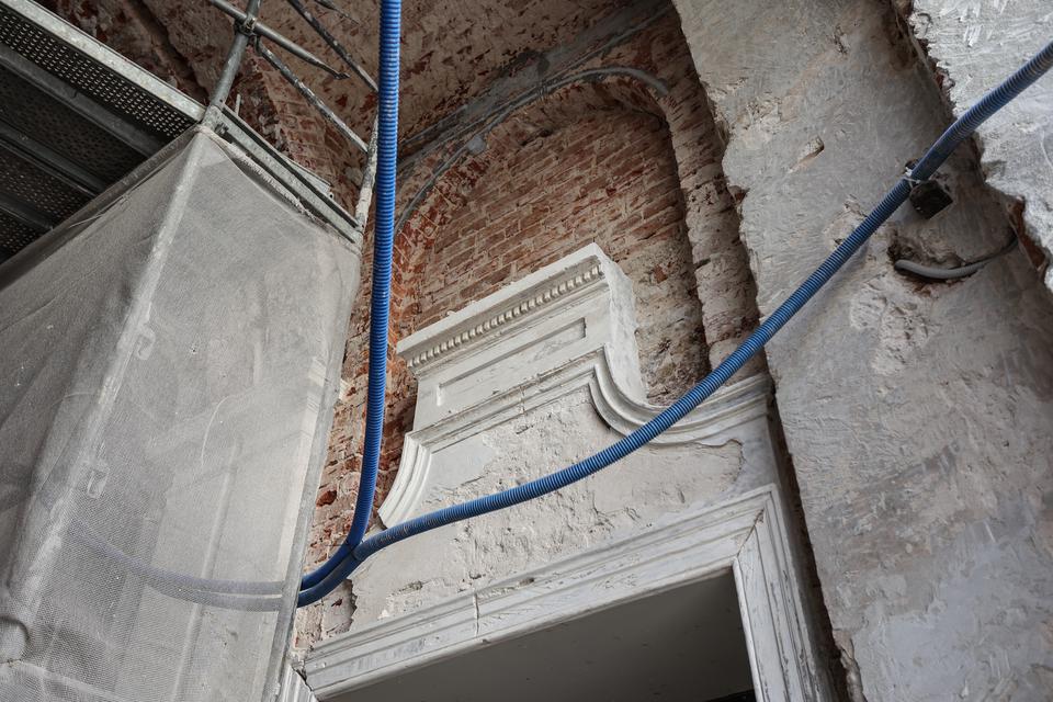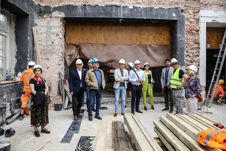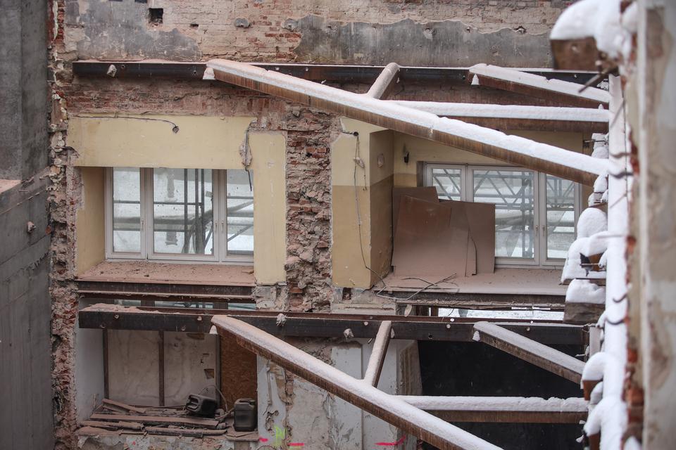 The first building works and advanced demolition works are being done at the construction site in 32 Sienkiewicza street. Installation and freight elevator were deconstructed. Disassembly of window frames and doors is taking place, as well as demolition of some partition walls and lining. Liquidation holes are being immured and walls are being strengthened. The ceilings in the main building are also being prepared for demolition.