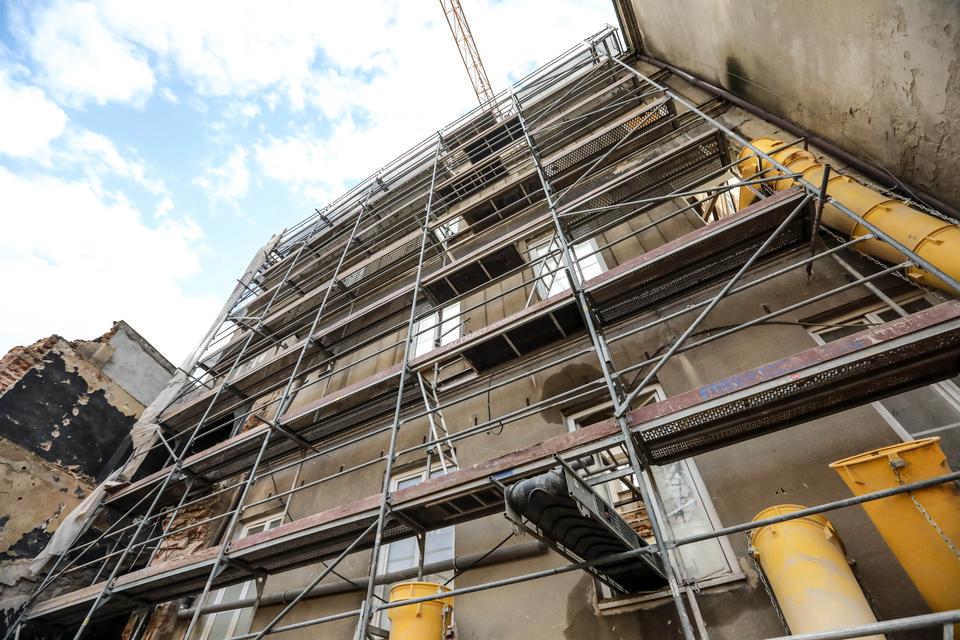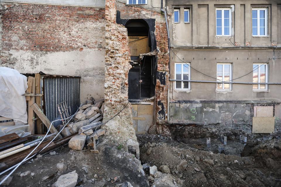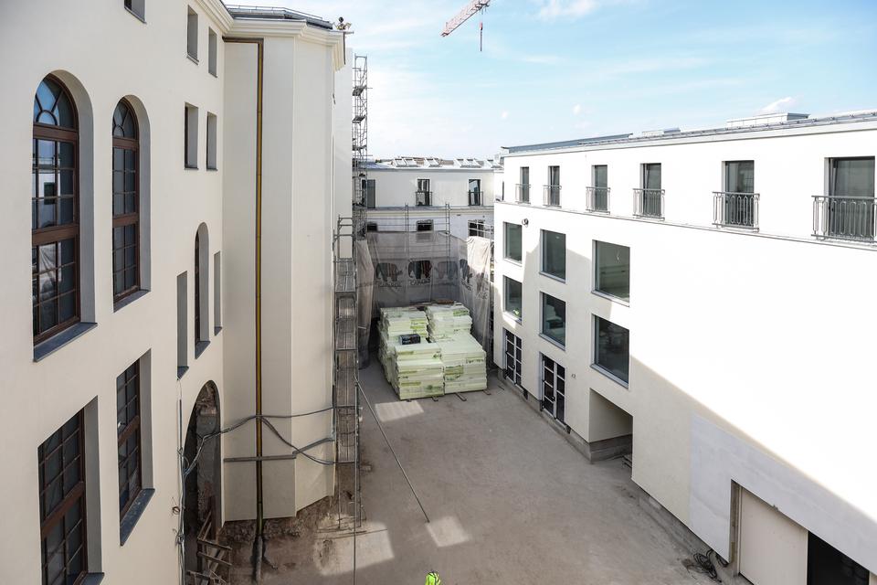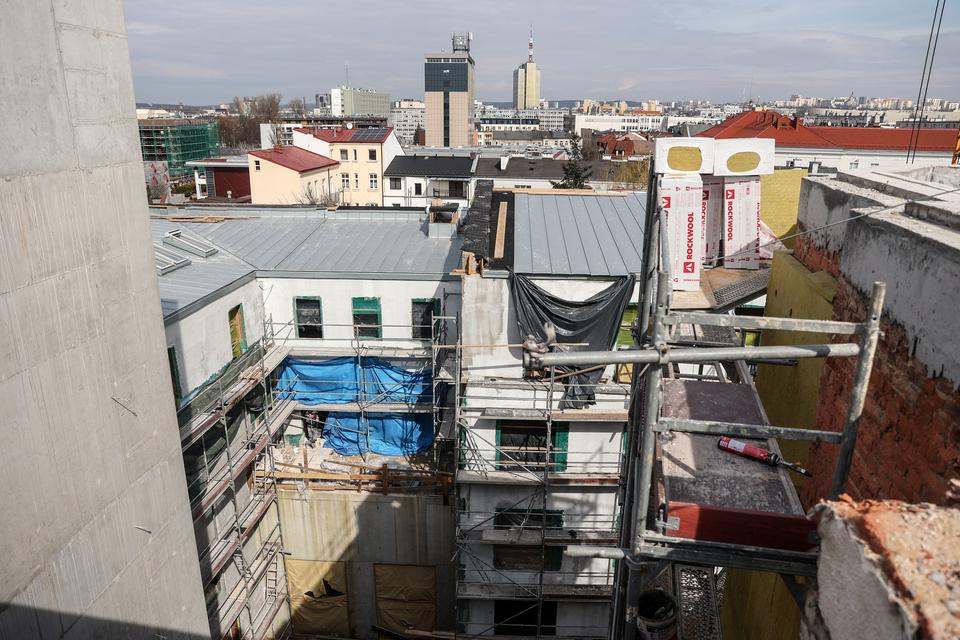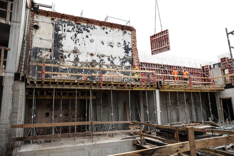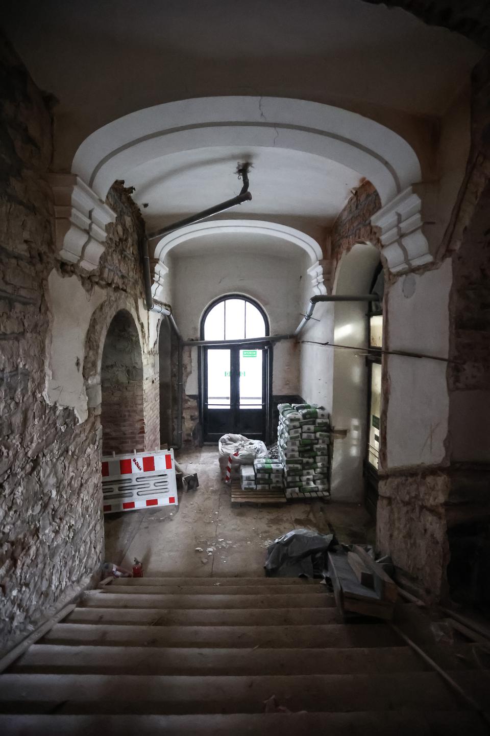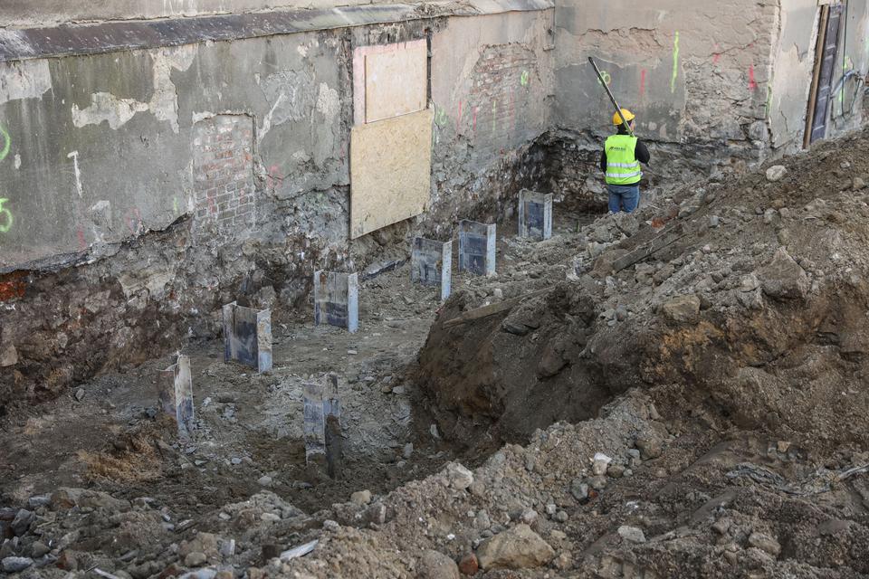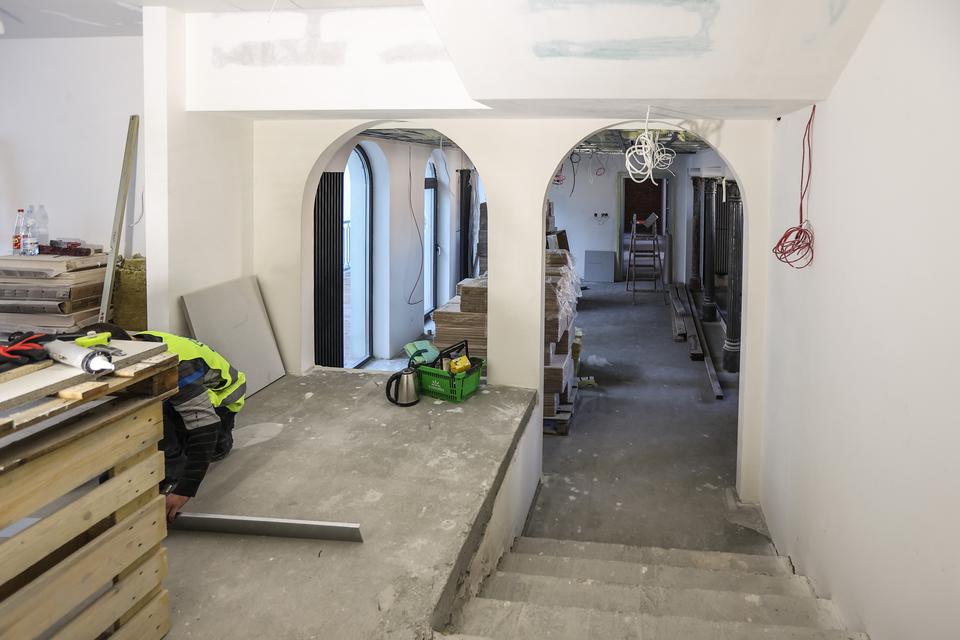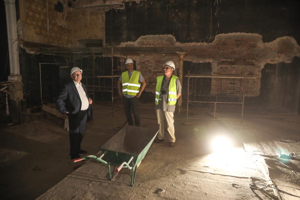 The first building works and advanced demolition works are being done at the construction site in 32 Sienkiewicza street. Installation and freight elevator were deconstructed. Disassembly of window frames and doors is taking place, as well as demolition of some partition walls and lining. Liquidation holes are being immured and walls are being strengthened. The ceilings in the main building are also being prepared for demolition.
