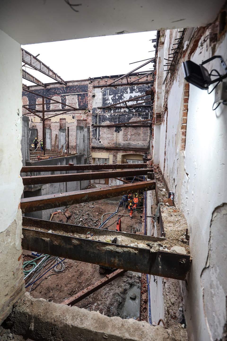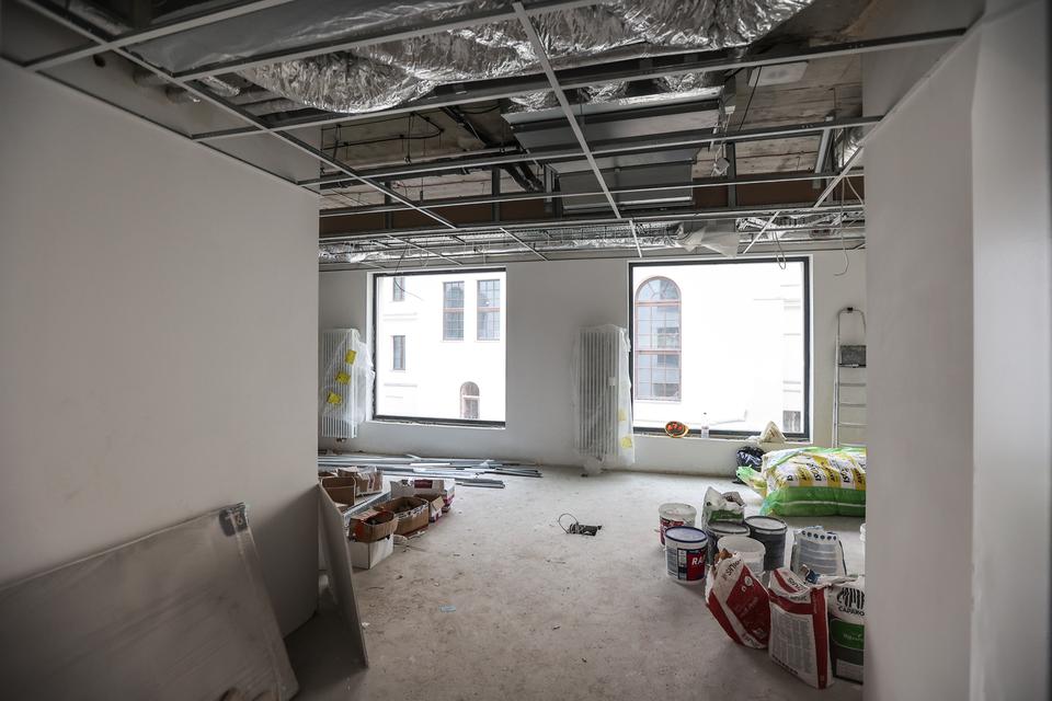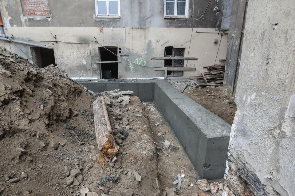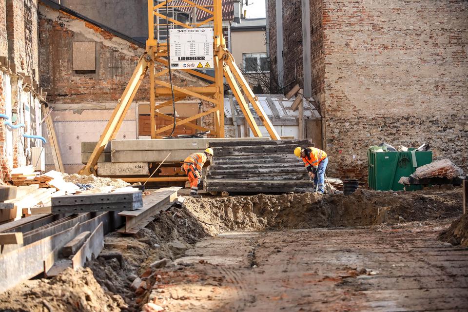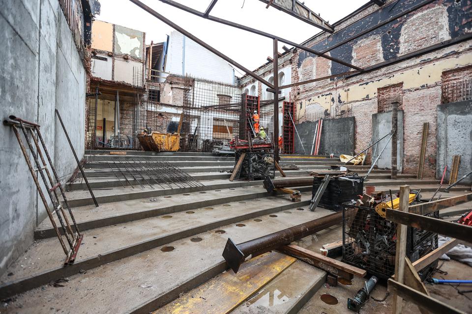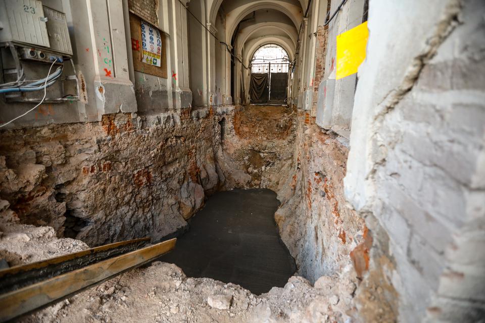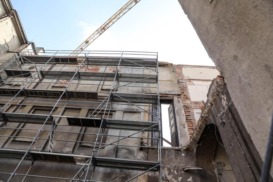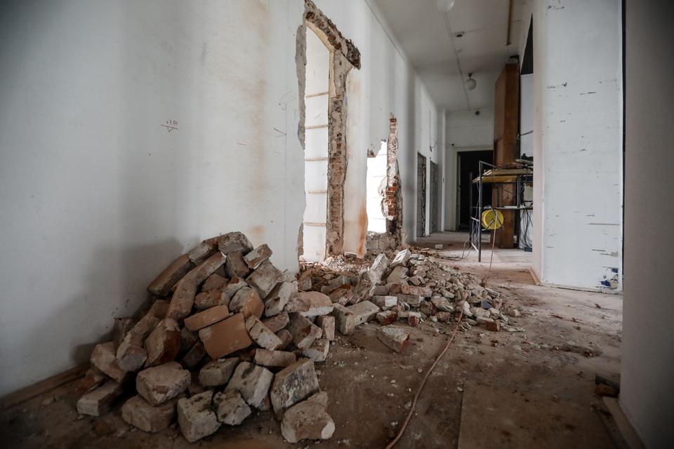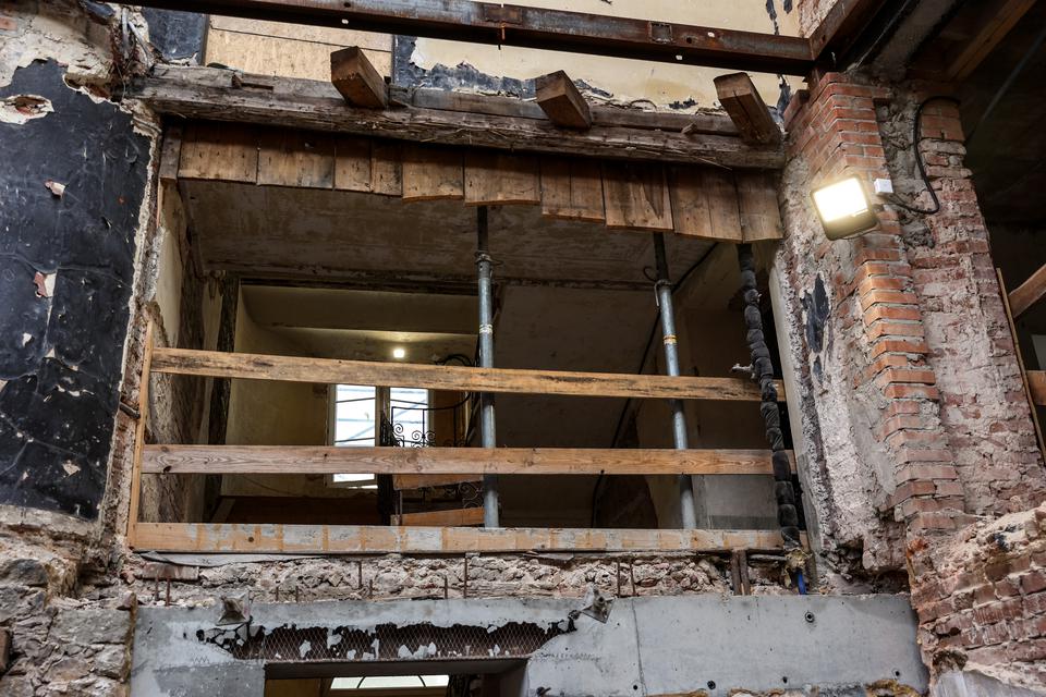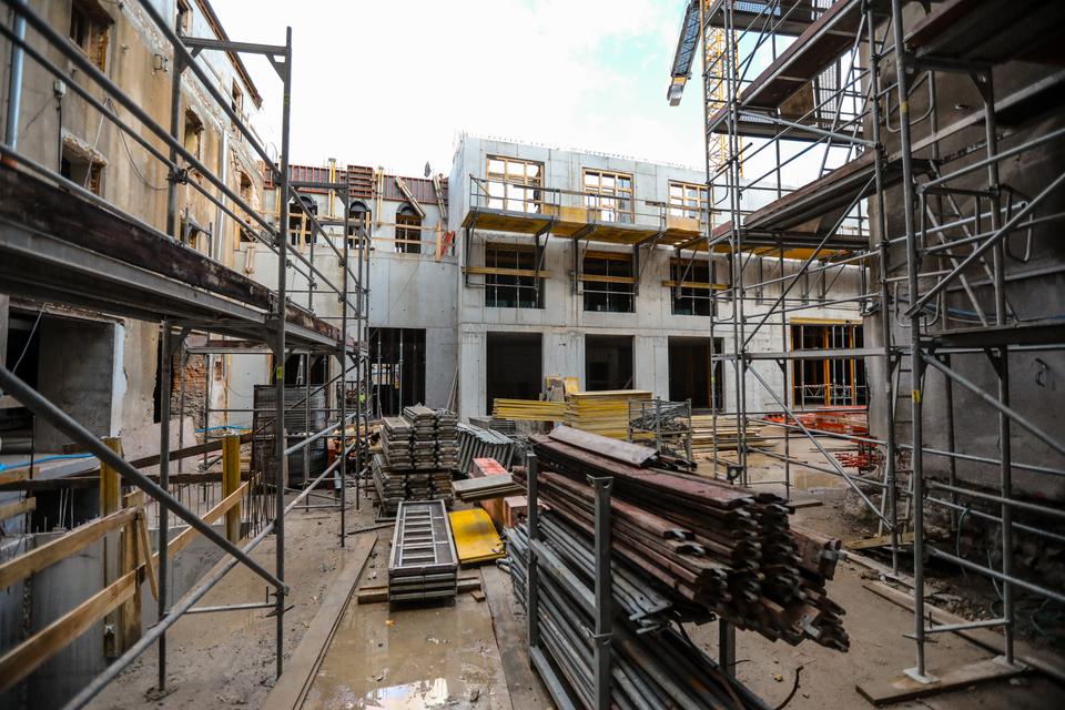 The first building works and advanced demolition works are being done at the construction site in 32 Sienkiewicza street. Installation and freight elevator were deconstructed. Disassembly of window frames and doors is taking place, as well as demolition of some partition walls and lining. Liquidation holes are being immured and walls are being strengthened. The ceilings in the main building are also being prepared for demolition.
