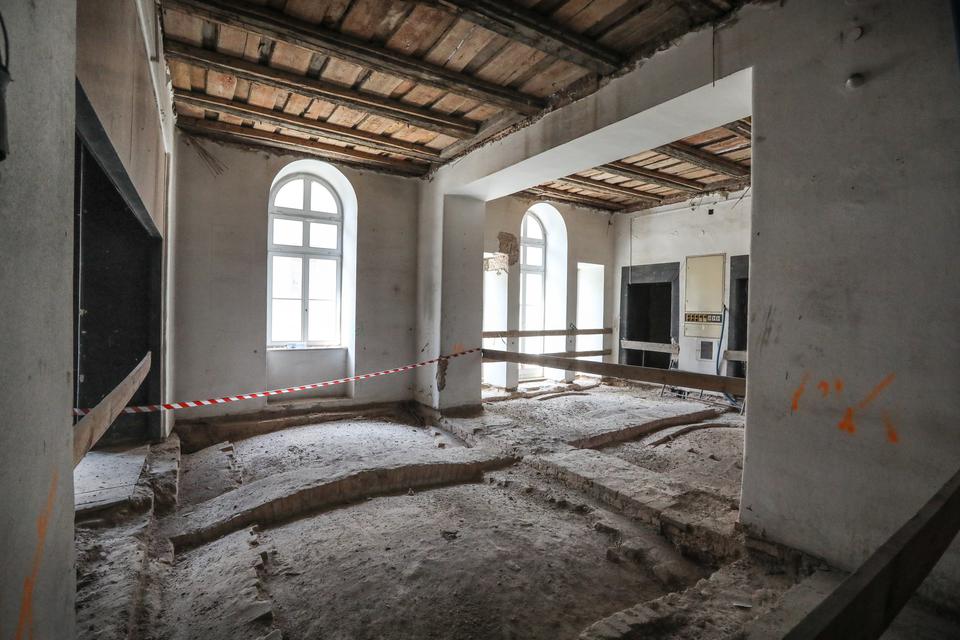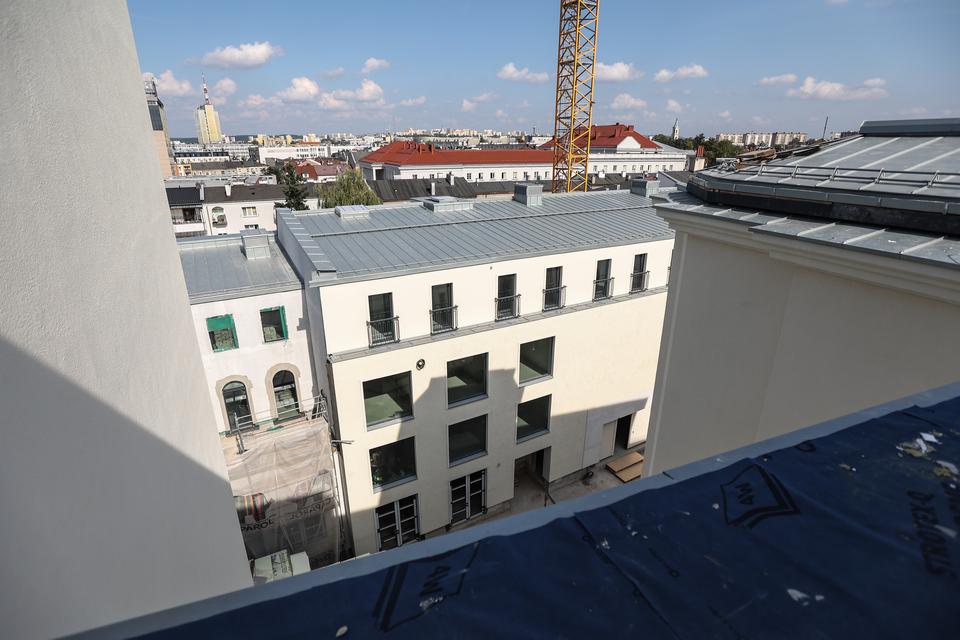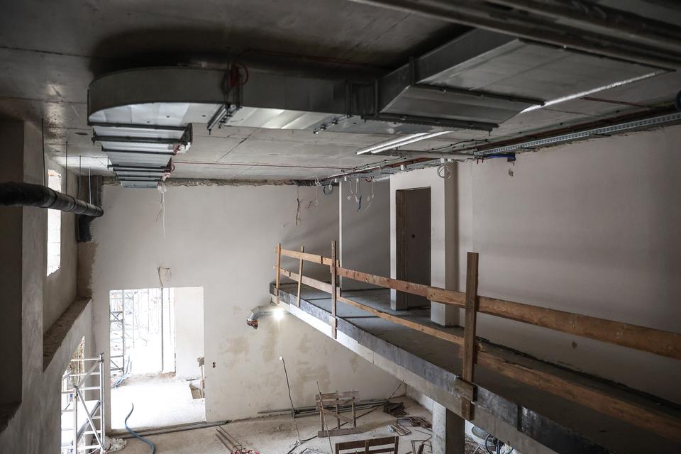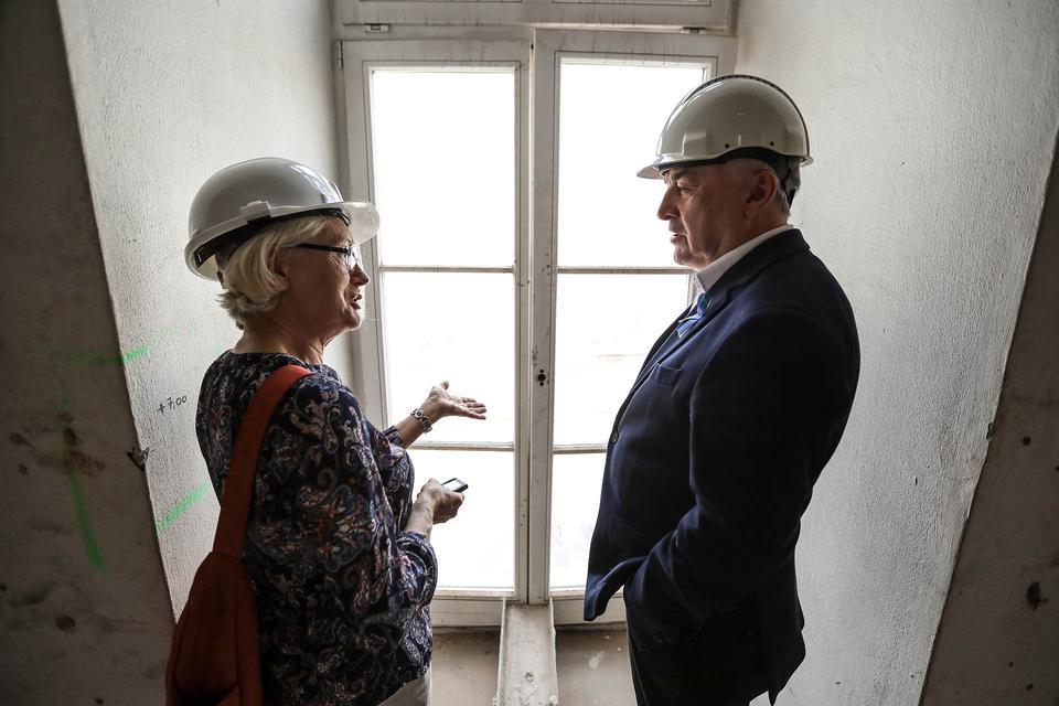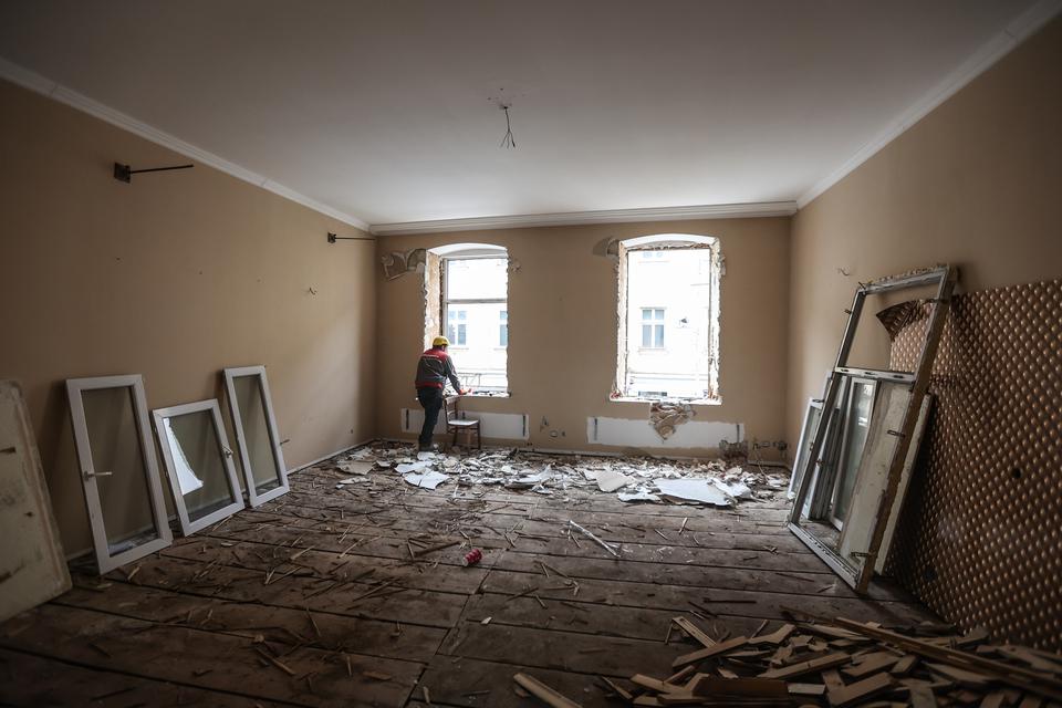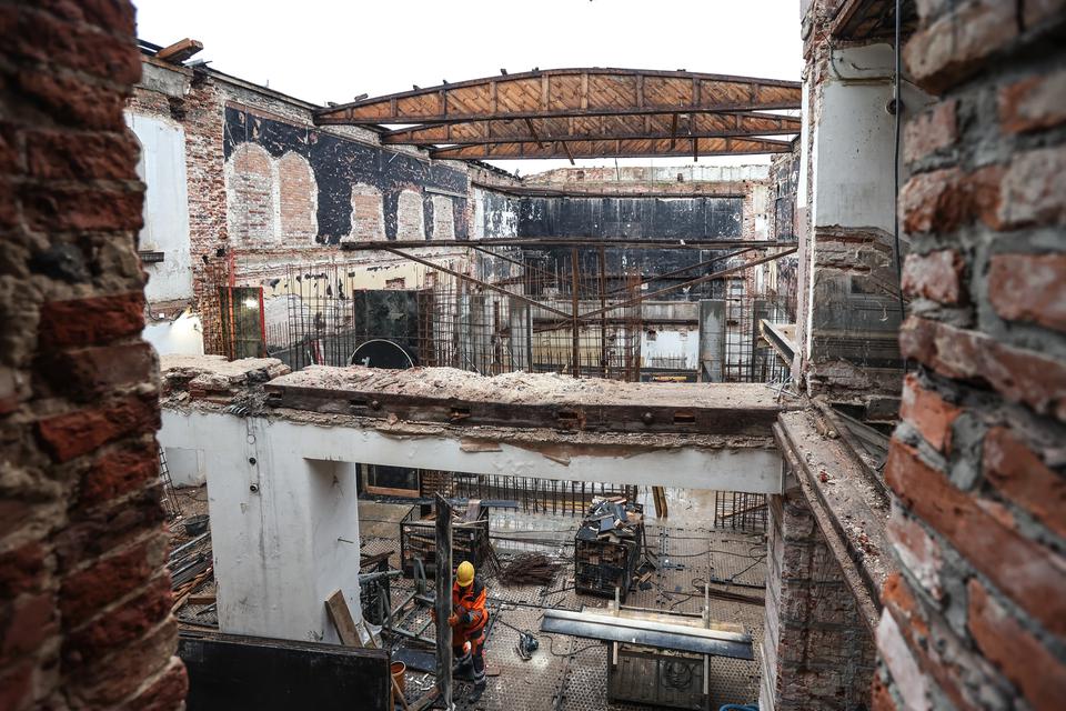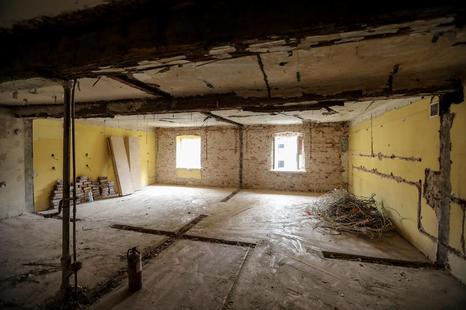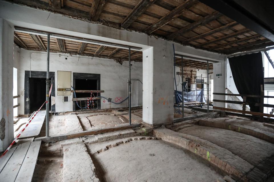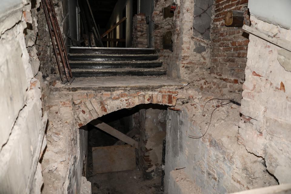 The first building works and advanced demolition works are being done at the construction site in 32 Sienkiewicza street. Installation and freight elevator were deconstructed. Disassembly of window frames and doors is taking place, as well as demolition of some partition walls and lining. Liquidation holes are being immured and walls are being strengthened. The ceilings in the main building are also being prepared for demolition.