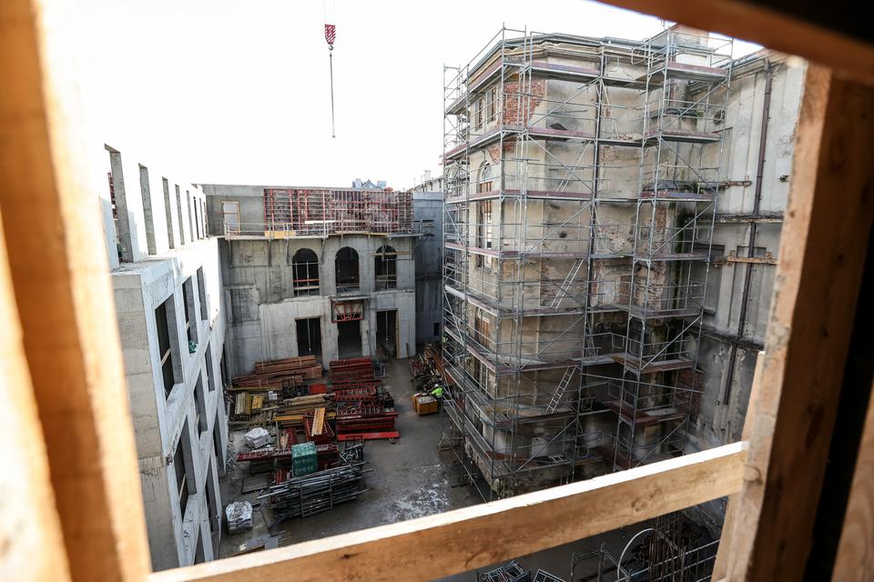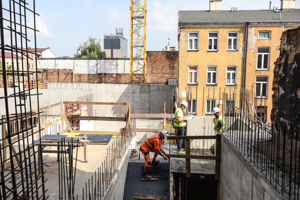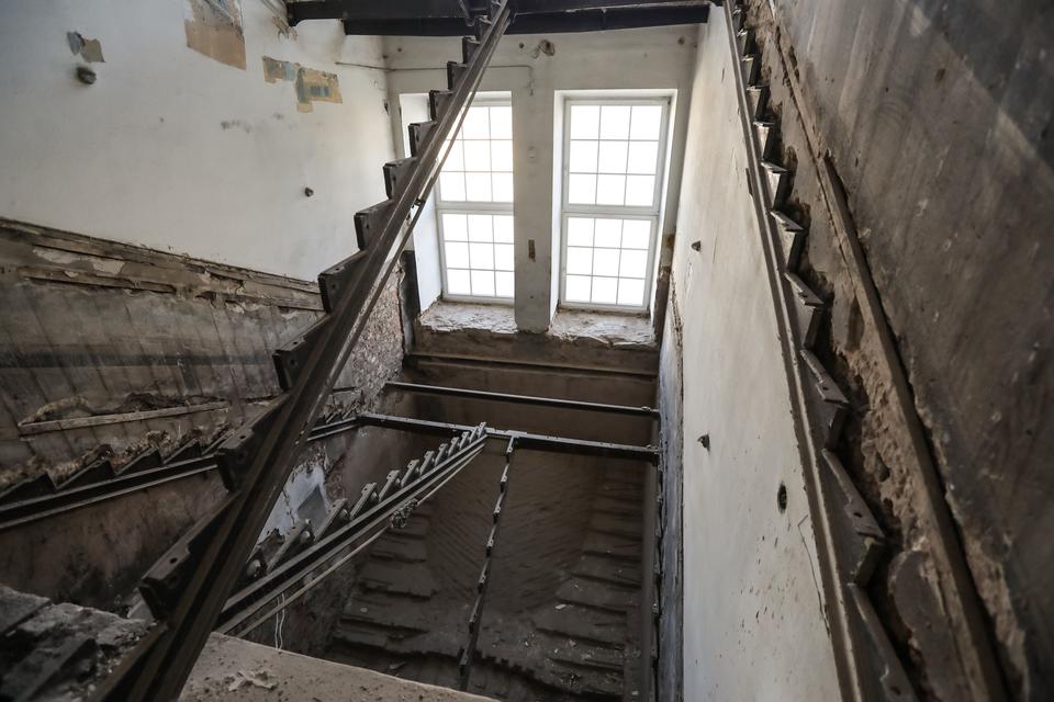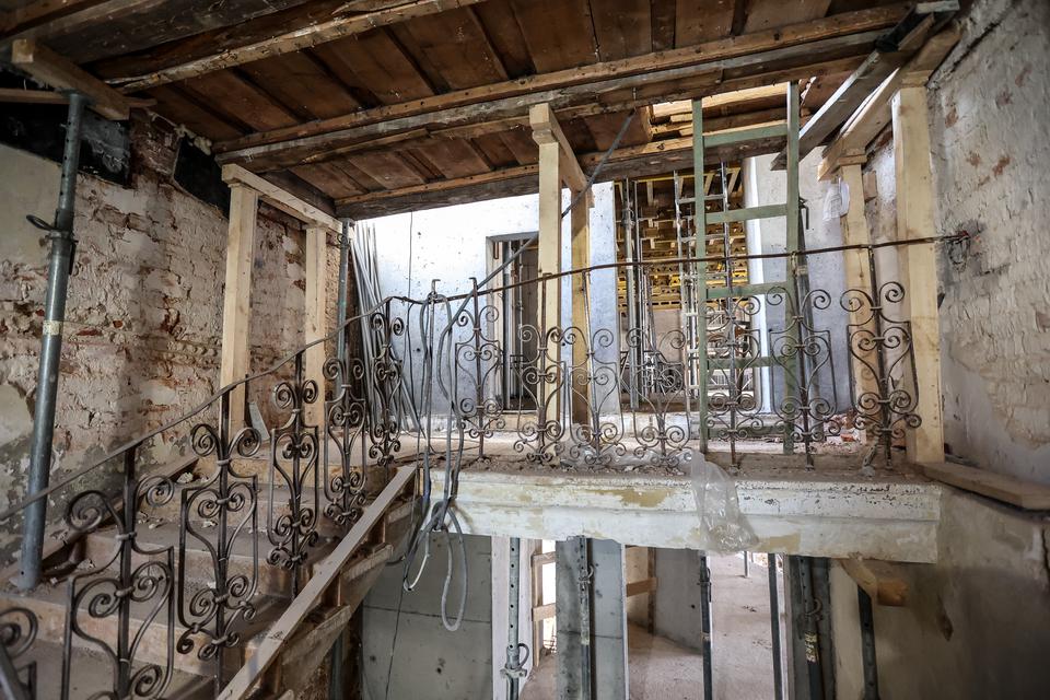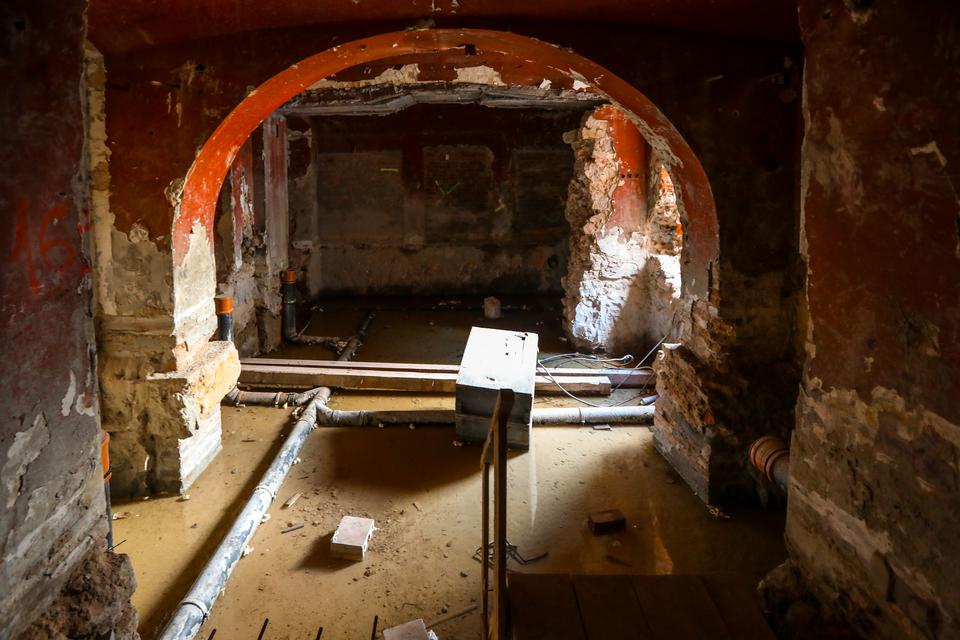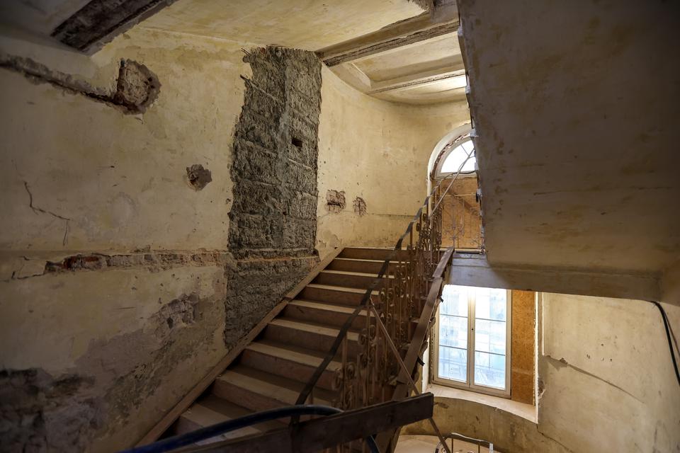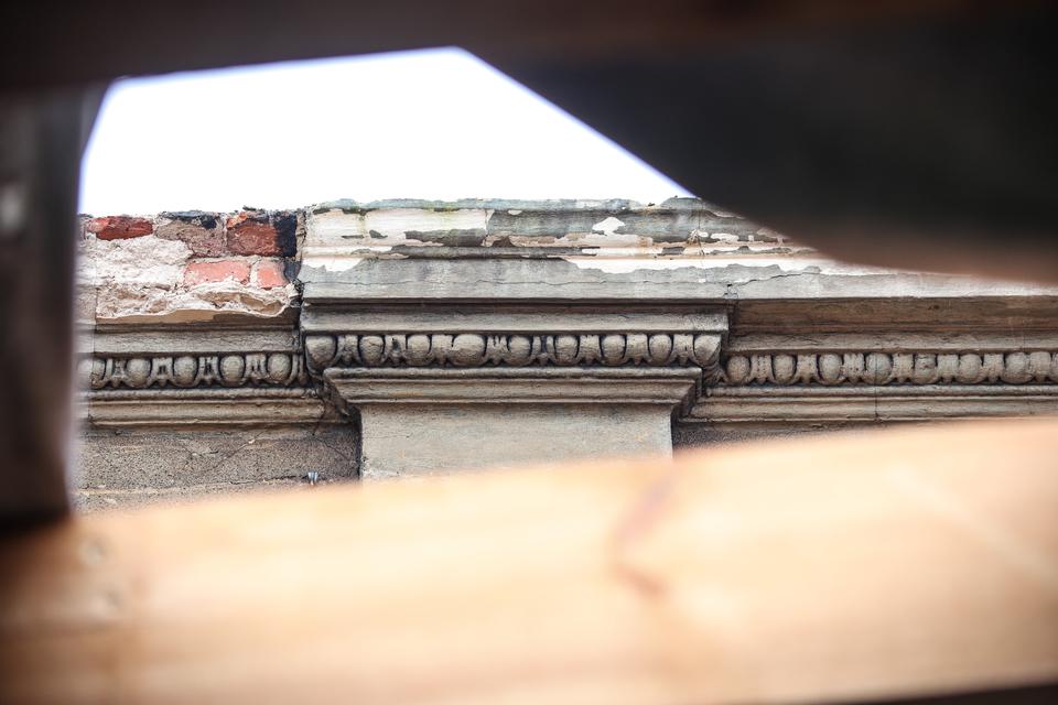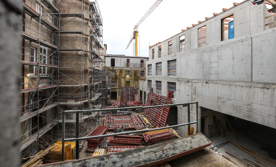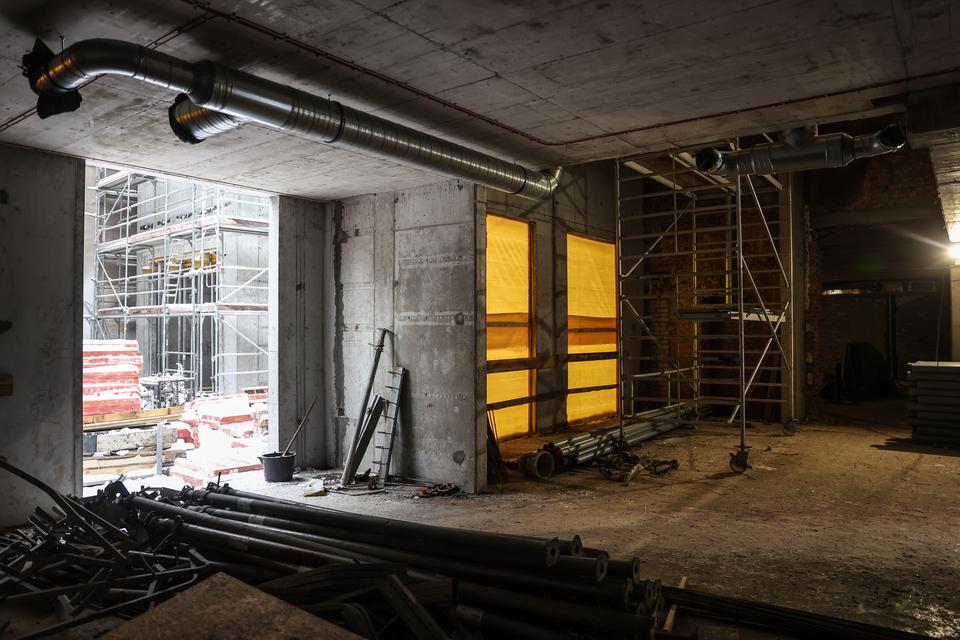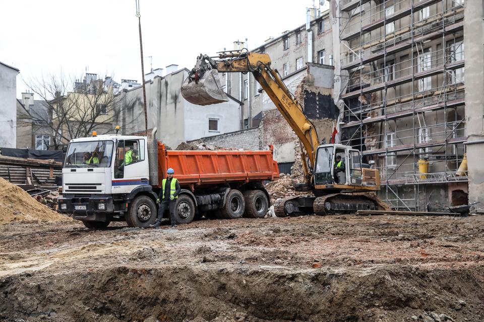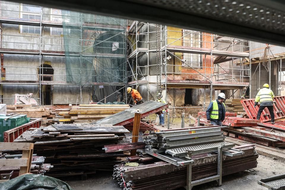 The first building works and advanced demolition works are being done at the construction site in 32 Sienkiewicza street. Installation and freight elevator were deconstructed. Disassembly of window frames and doors is taking place, as well as demolition of some partition walls and lining. Liquidation holes are being immured and walls are being strengthened. The ceilings in the main building are also being prepared for demolition.