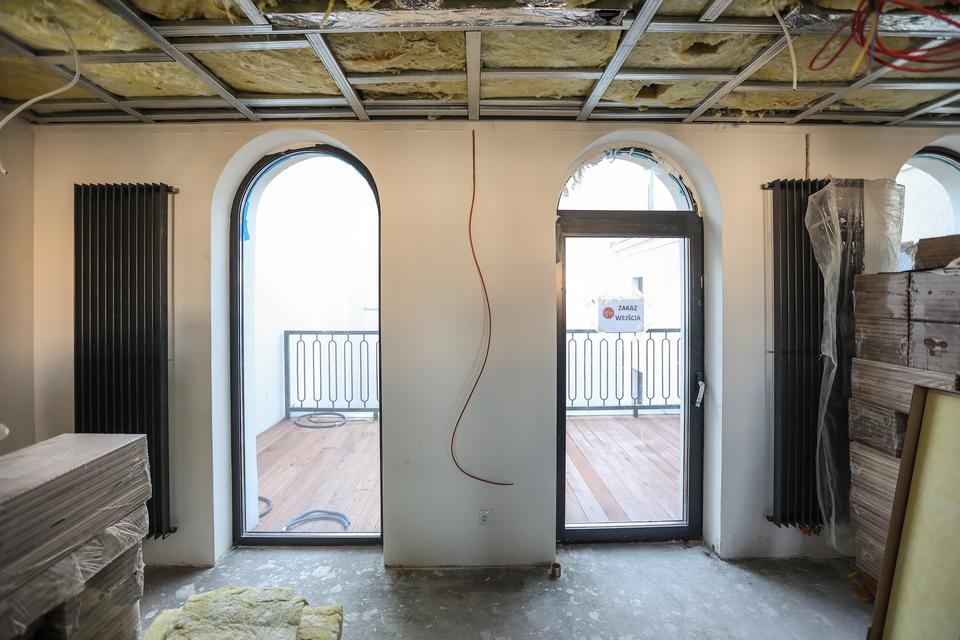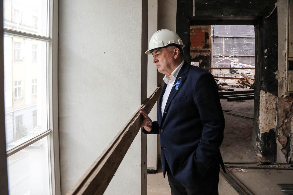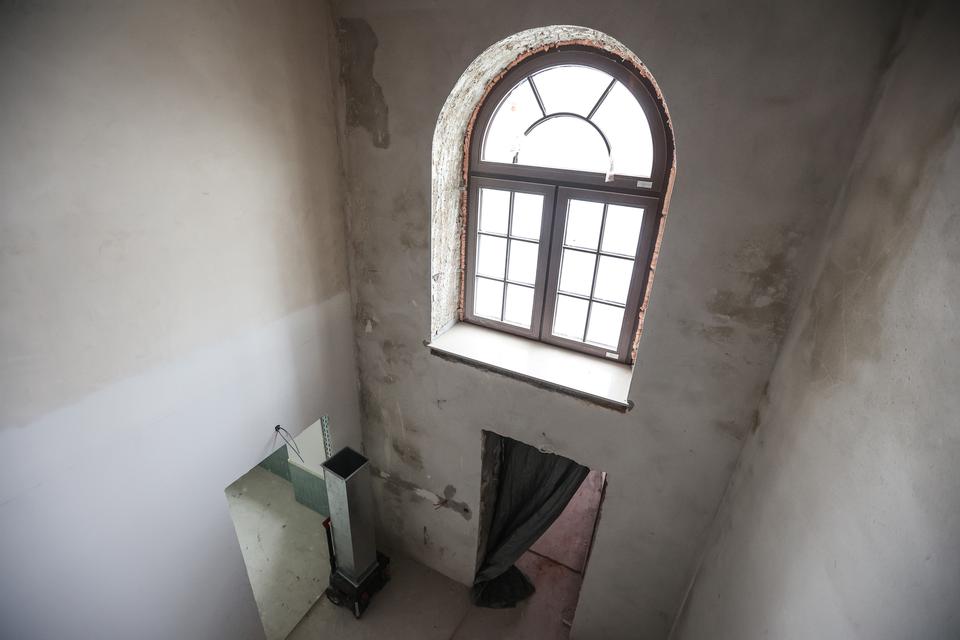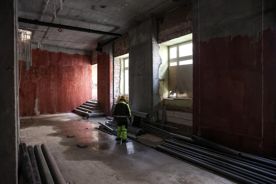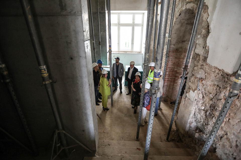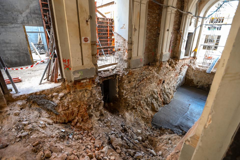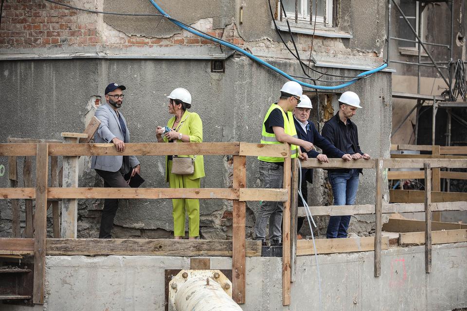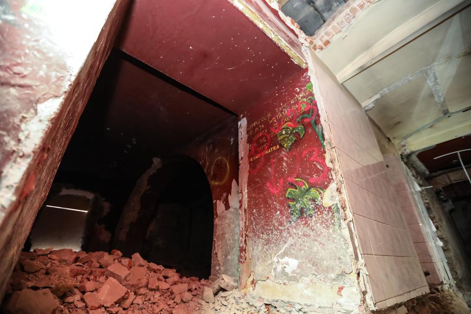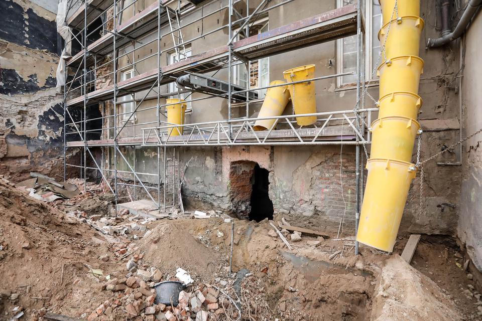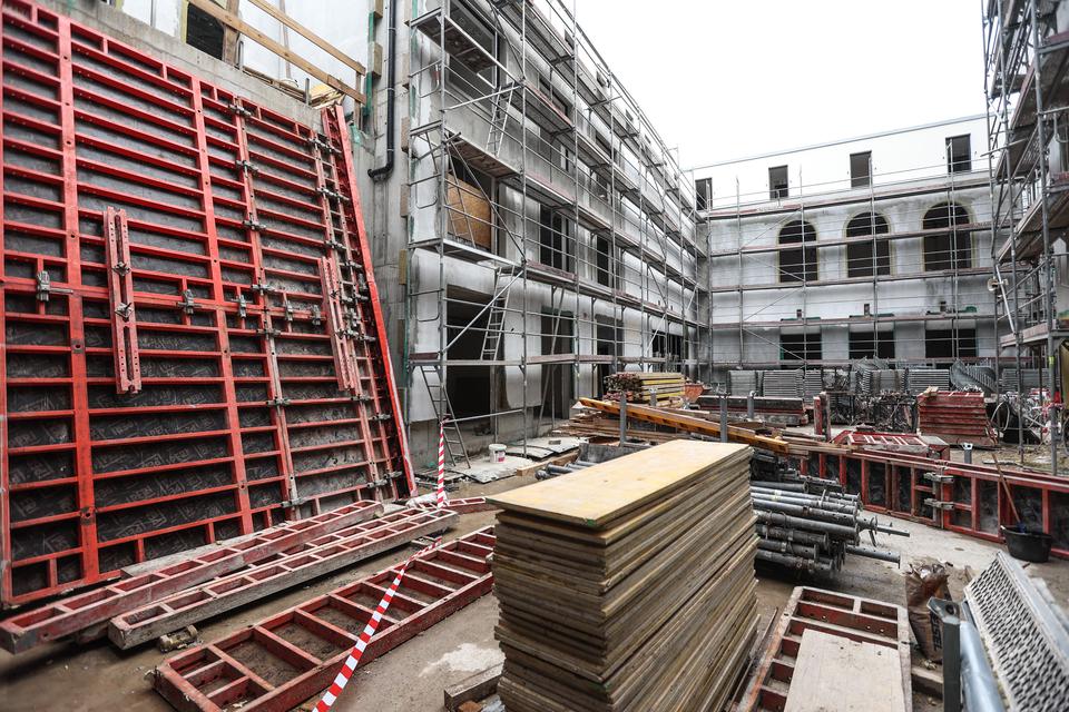The first building works and advanced demolition works are being done at the construction site in 32 Sienkiewicza street. Installation and freight elevator were deconstructed. Disassembly of window frames and doors is taking place, as well as demolition of some partition walls and lining. Liquidation holes are being immured and walls are being strengthened. The ceilings in the main building are also being prepared for demolition.