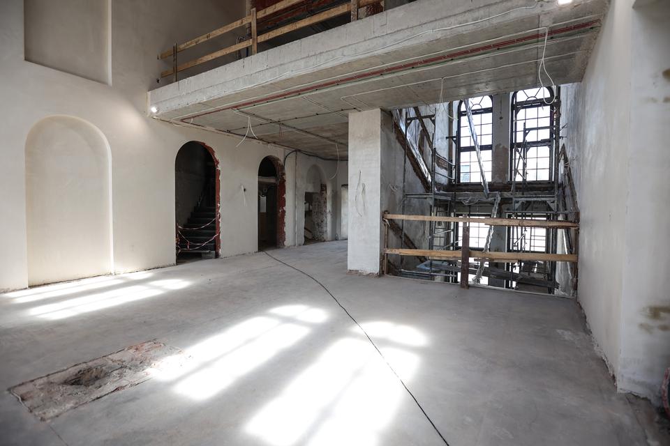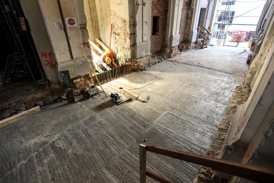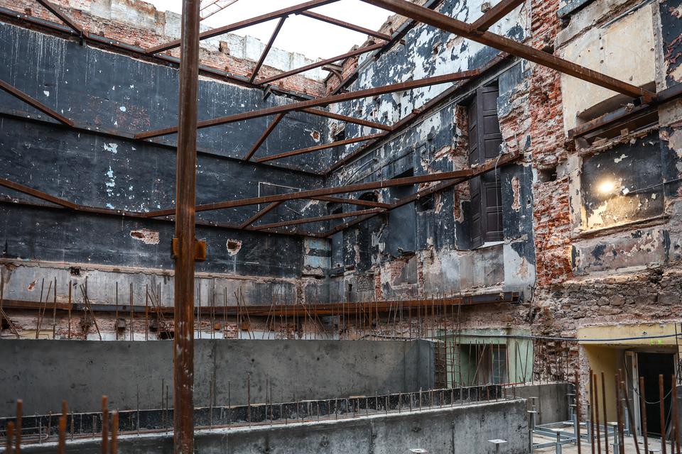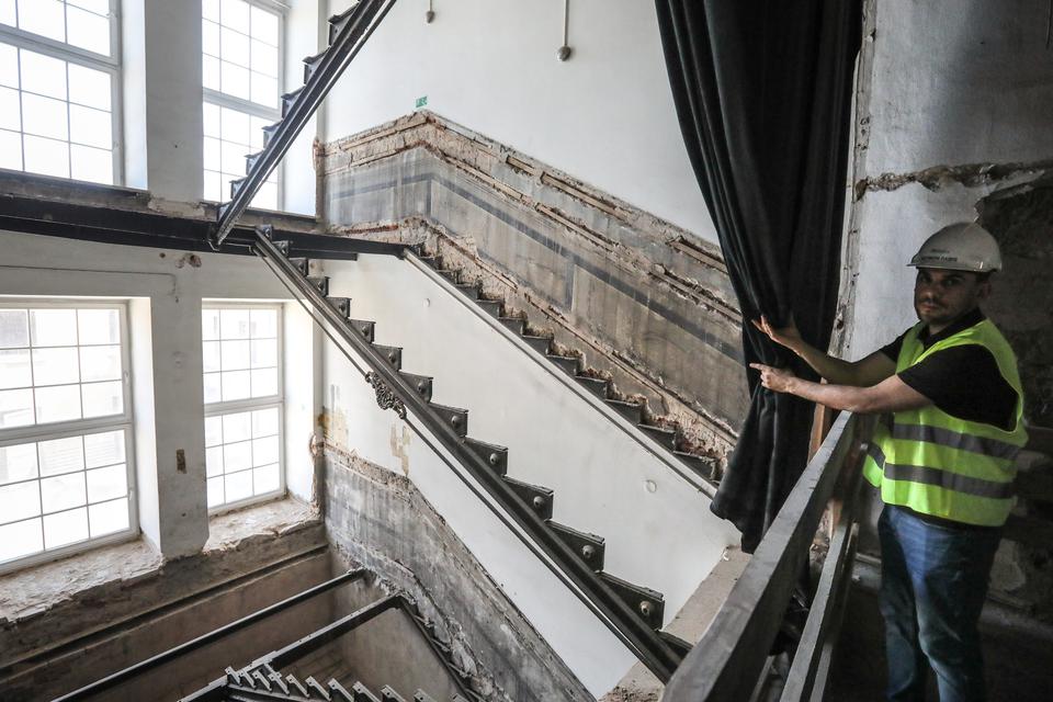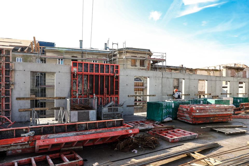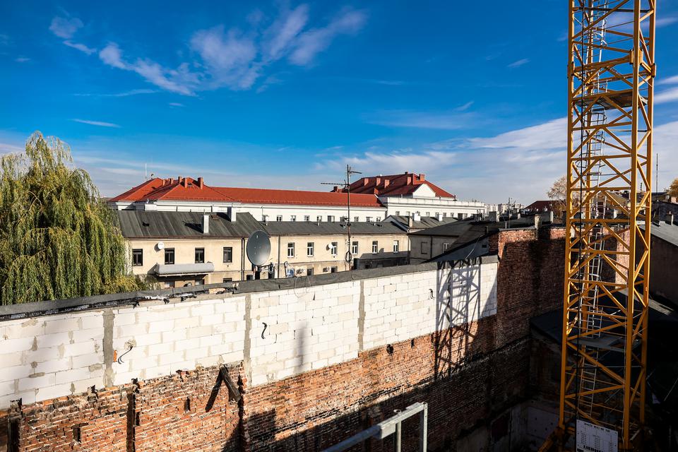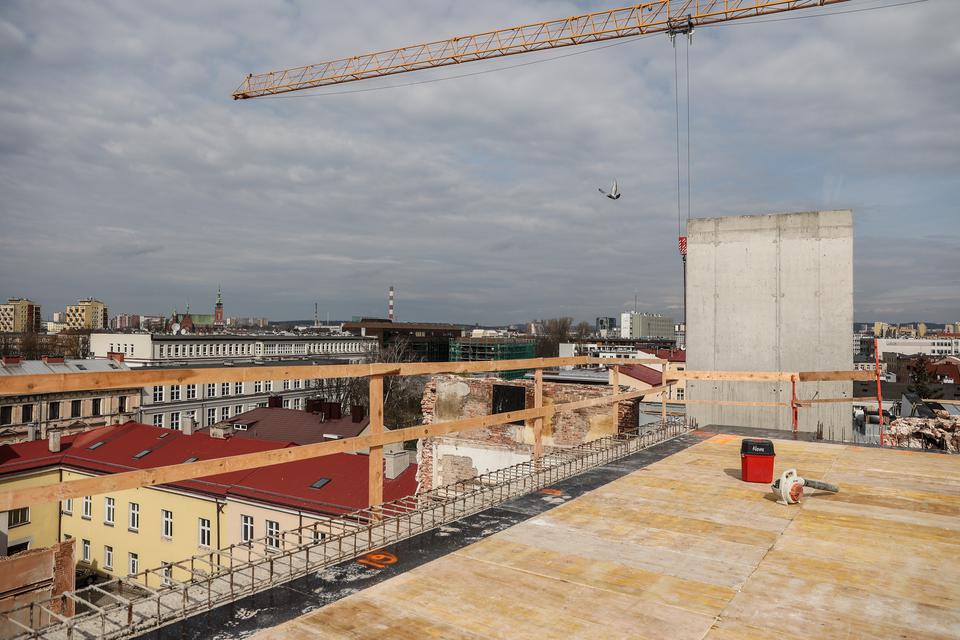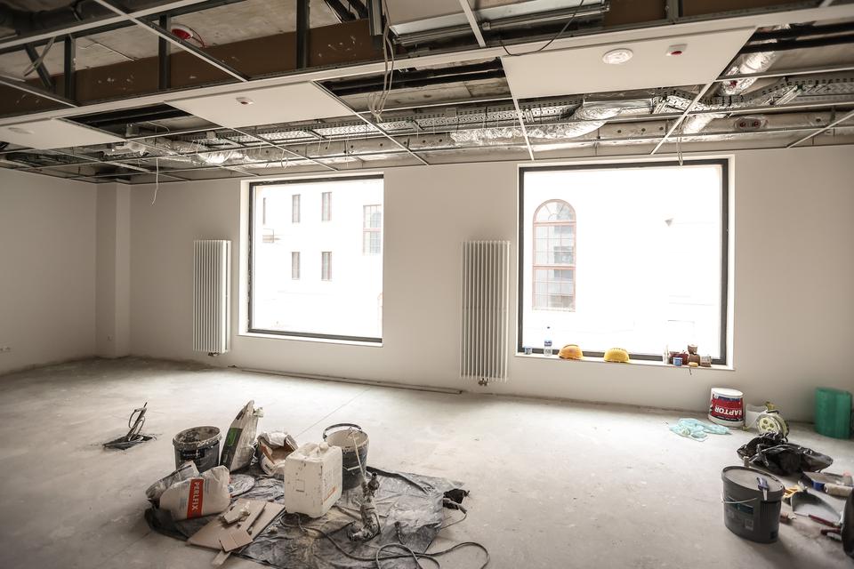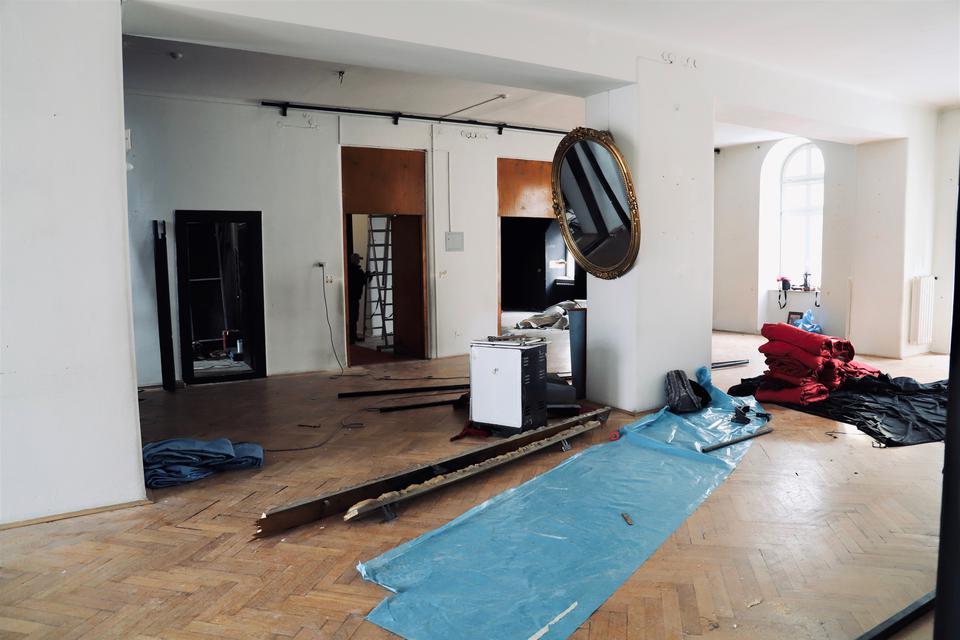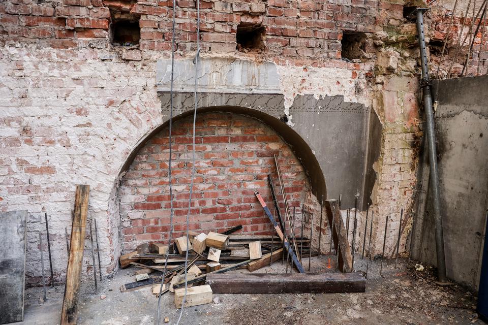 The first building works and advanced demolition works are being done at the construction site in 32 Sienkiewicza street. Installation and freight elevator were deconstructed. Disassembly of window frames and doors is taking place, as well as demolition of some partition walls and lining. Liquidation holes are being immured and walls are being strengthened. The ceilings in the main building are also being prepared for demolition.