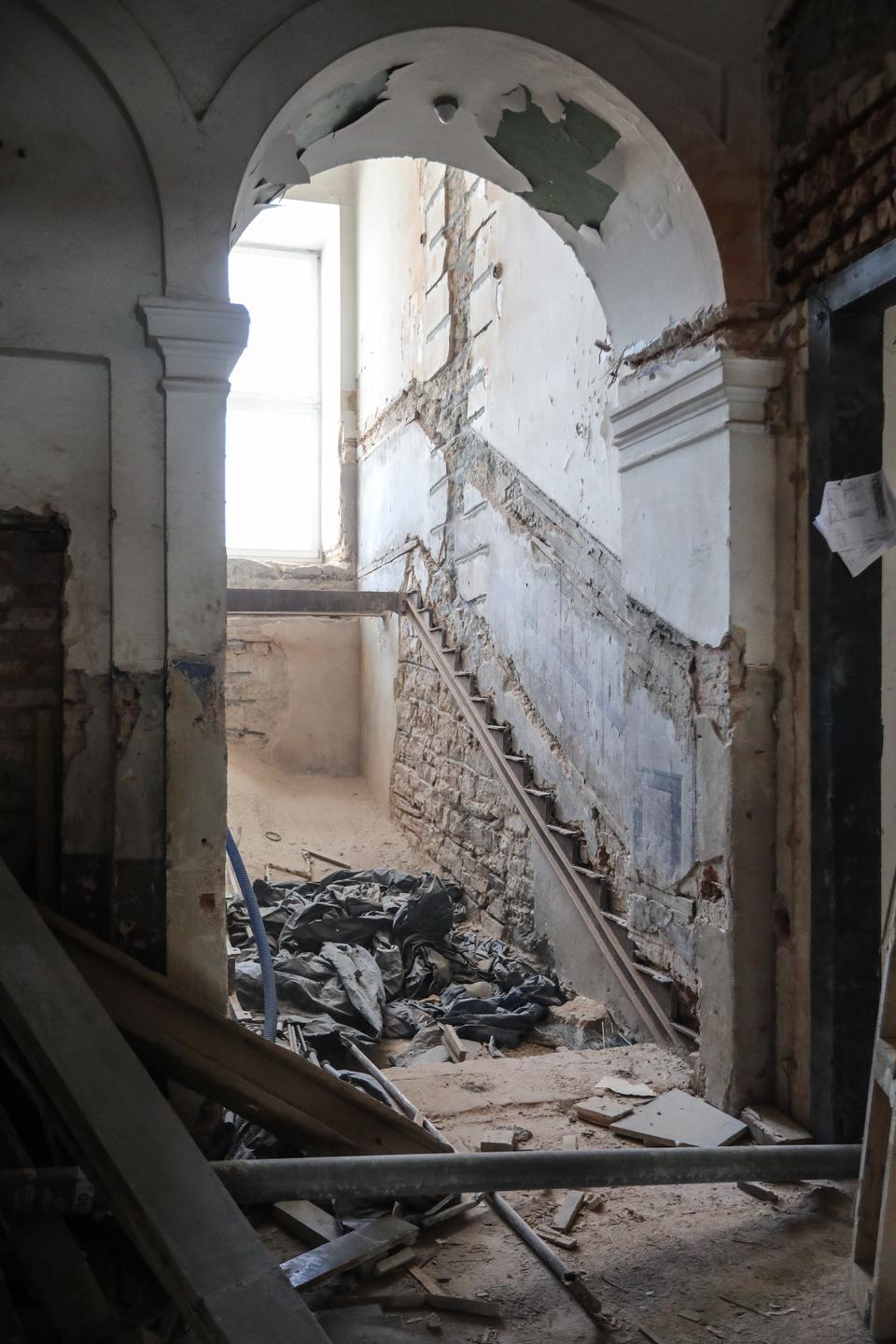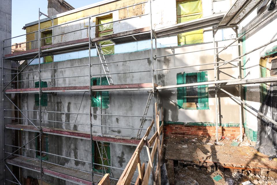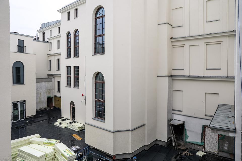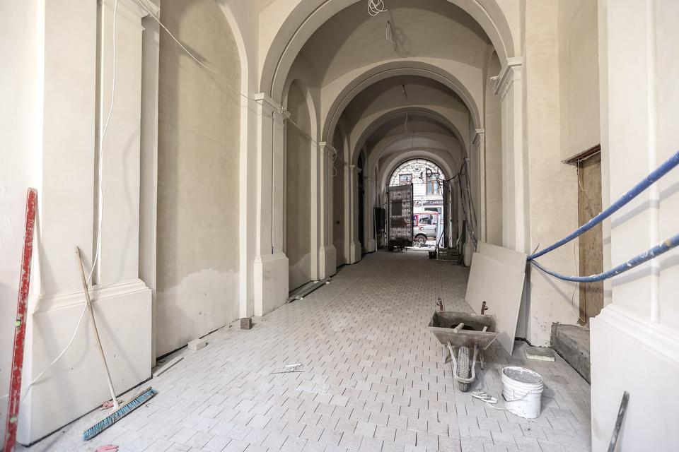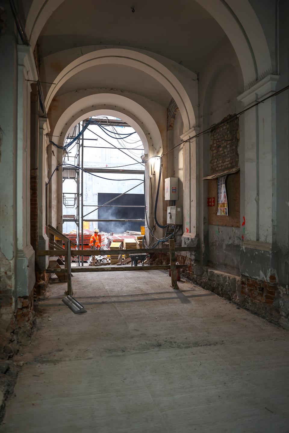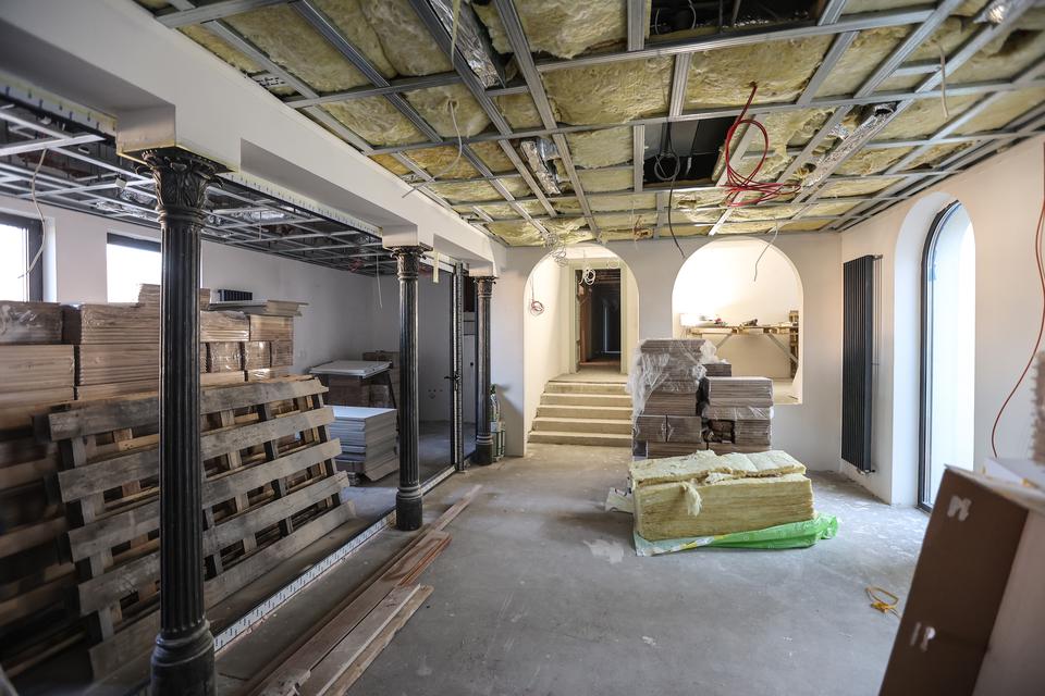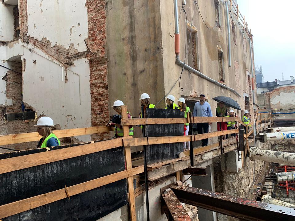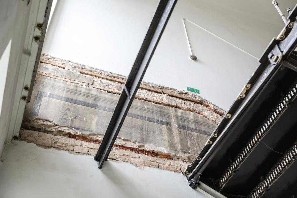 The first building works and advanced demolition works are being done at the construction site in 32 Sienkiewicza street. Installation and freight elevator were deconstructed. Disassembly of window frames and doors is taking place, as well as demolition of some partition walls and lining. Liquidation holes are being immured and walls are being strengthened. The ceilings in the main building are also being prepared for demolition.