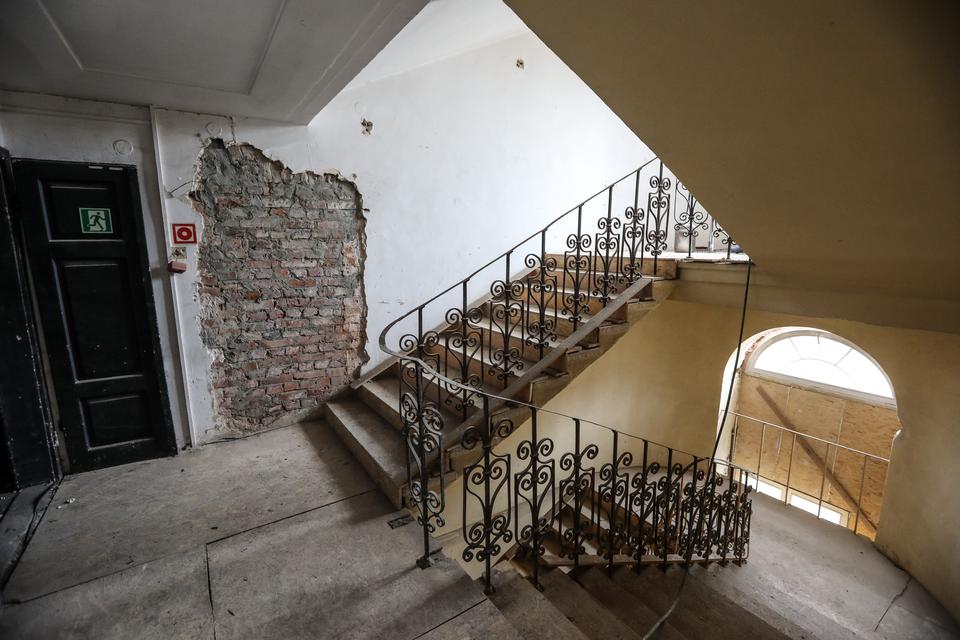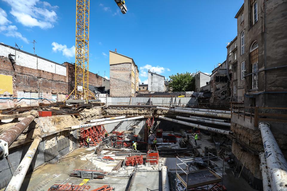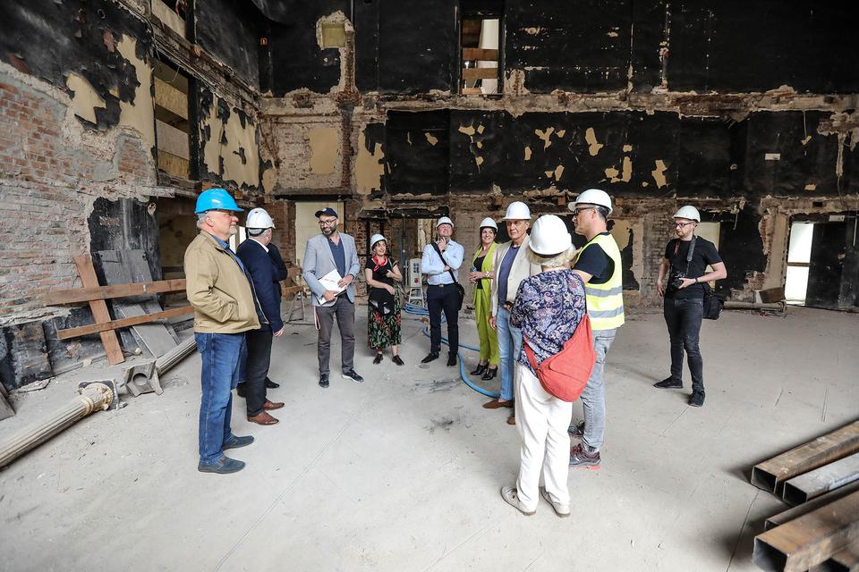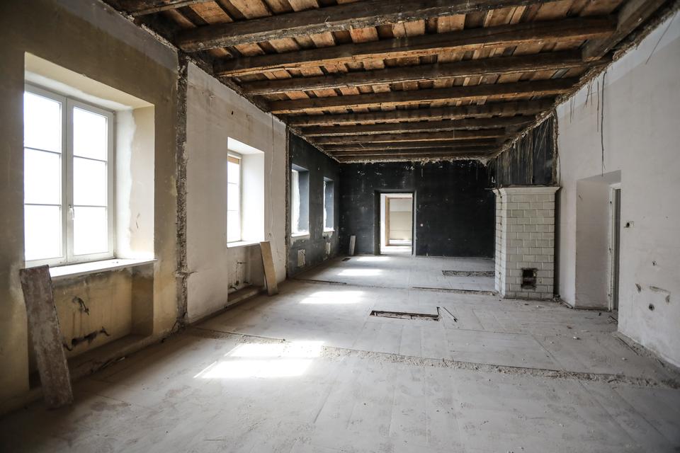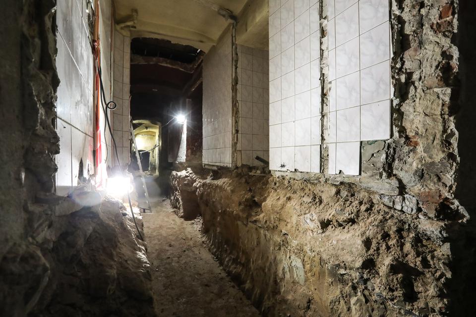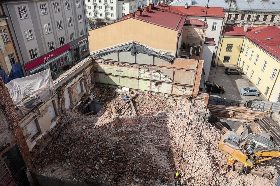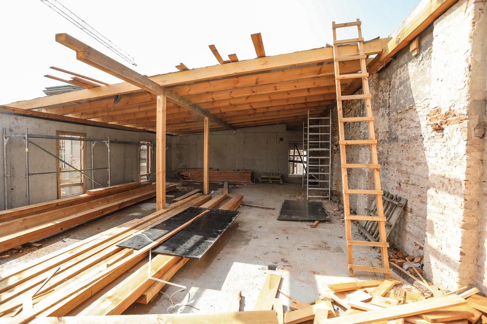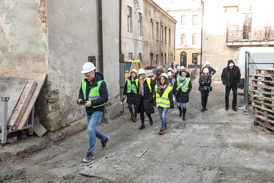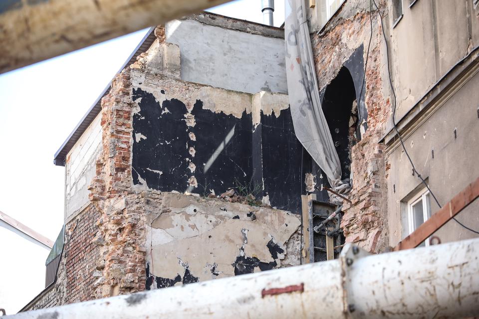 The first building works and advanced demolition works are being done at the construction site in 32 Sienkiewicza street. Installation and freight elevator were deconstructed. Disassembly of window frames and doors is taking place, as well as demolition of some partition walls and lining. Liquidation holes are being immured and walls are being strengthened. The ceilings in the main building are also being prepared for demolition.