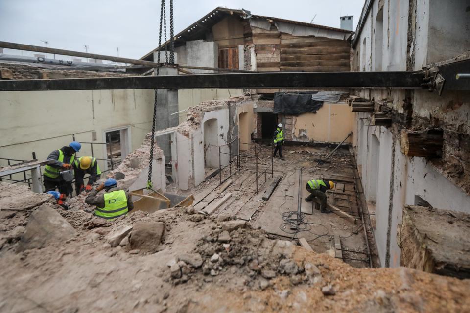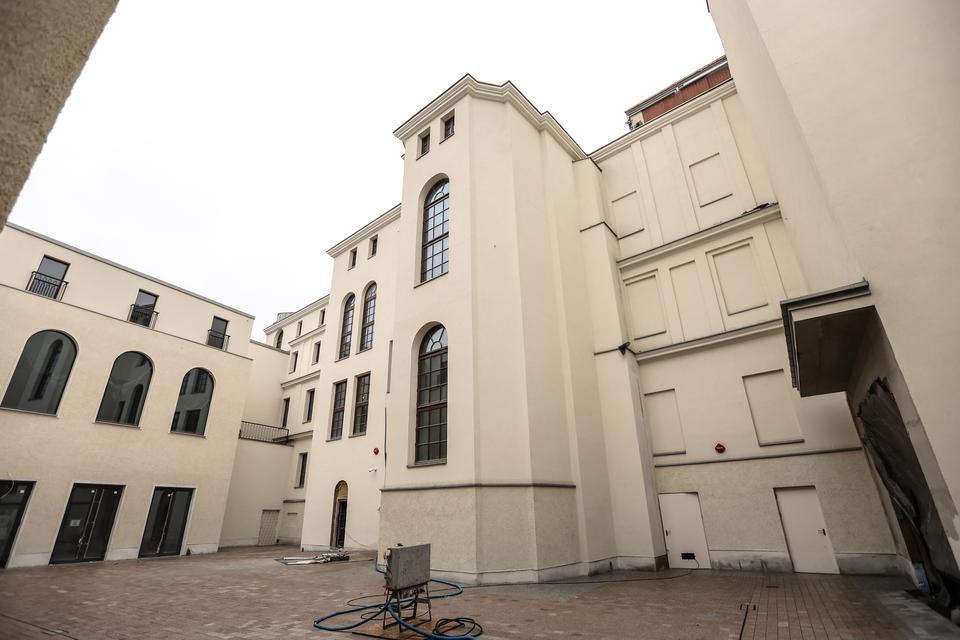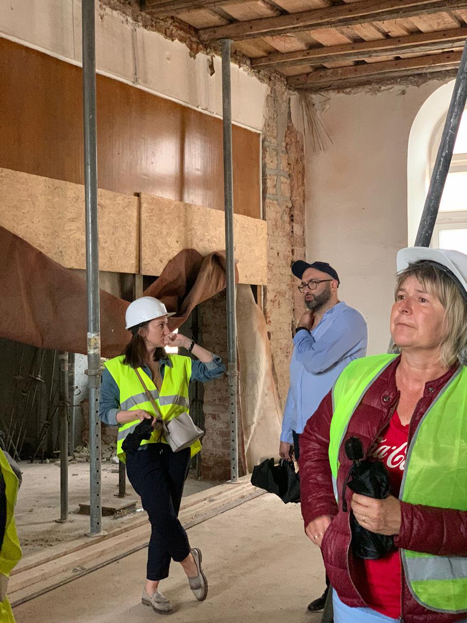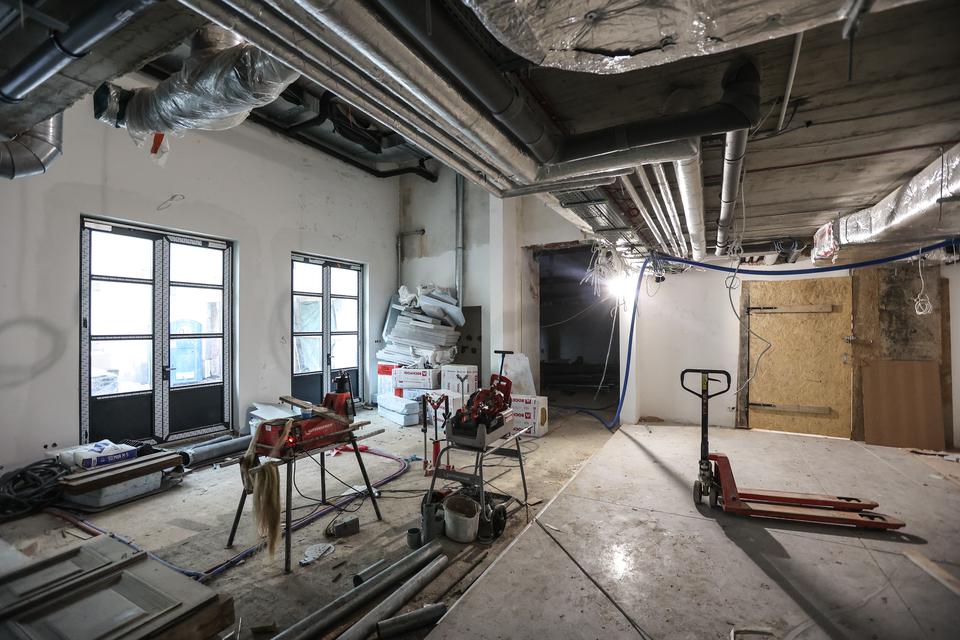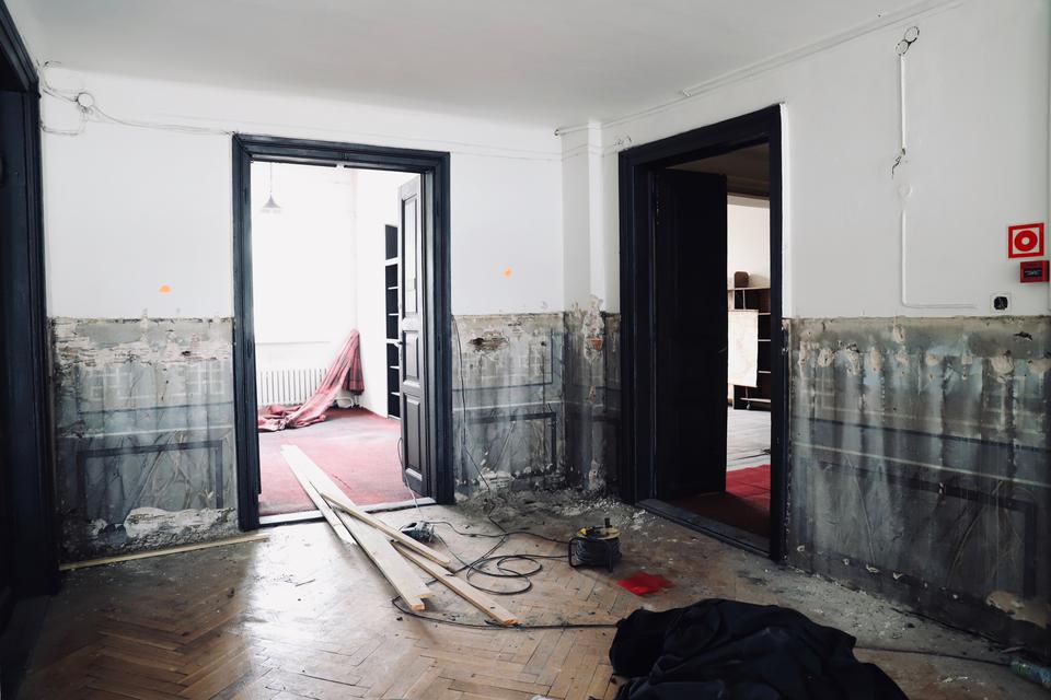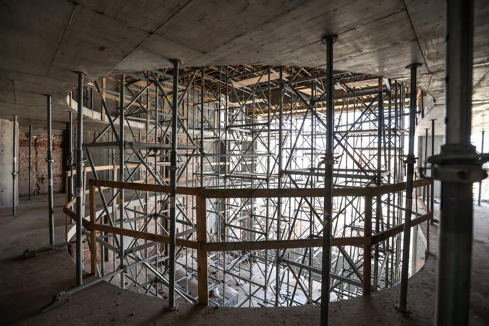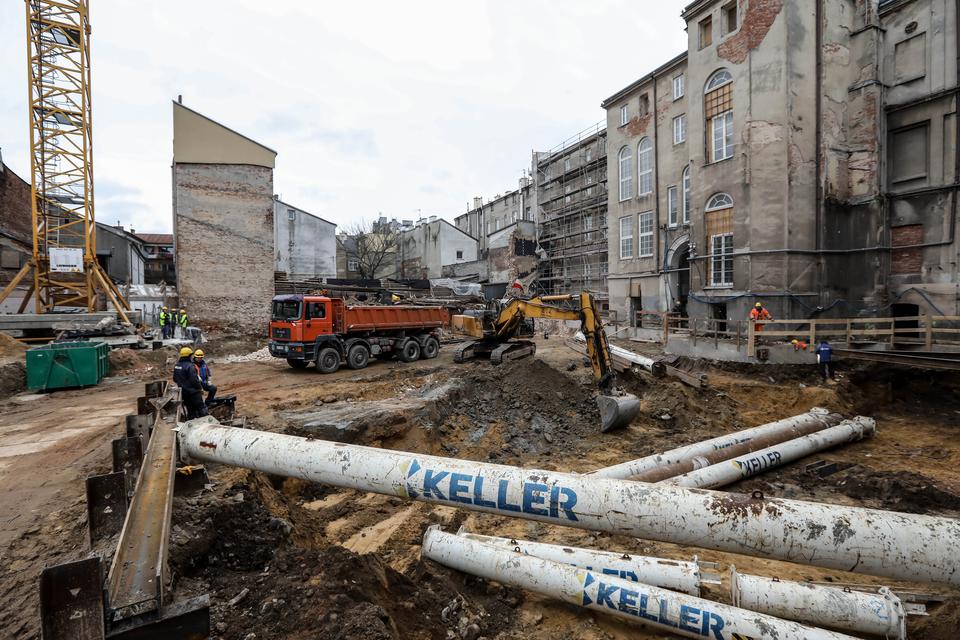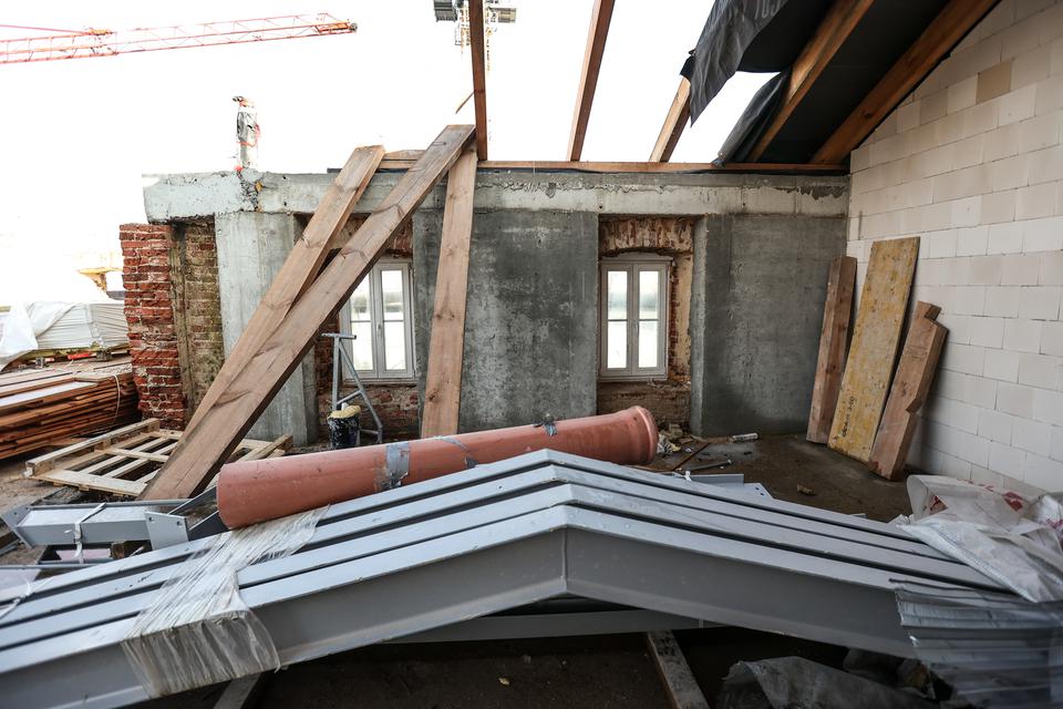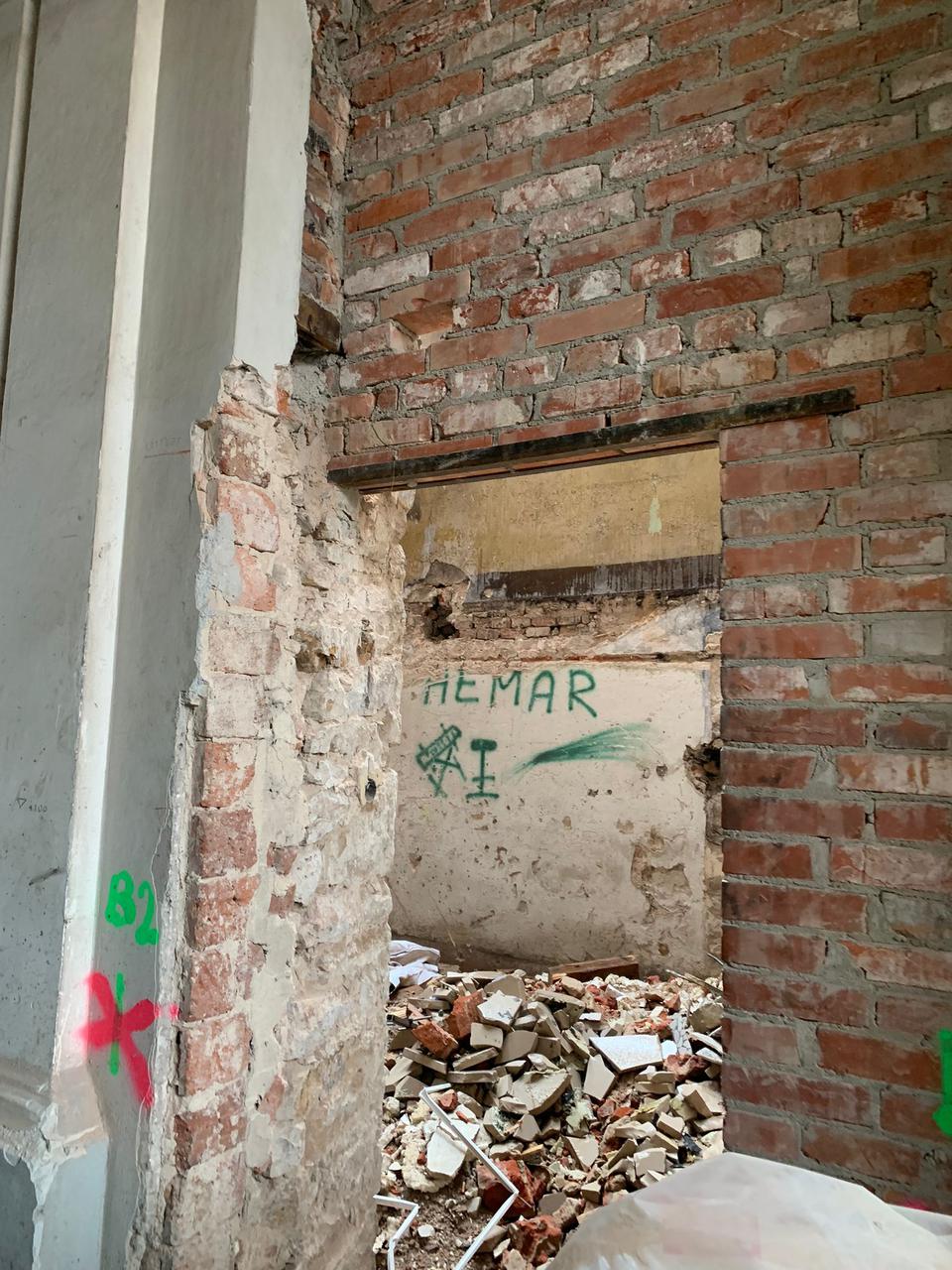 The first building works and advanced demolition works are being done at the construction site in 32 Sienkiewicza street. Installation and freight elevator were deconstructed. Disassembly of window frames and doors is taking place, as well as demolition of some partition walls and lining. Liquidation holes are being immured and walls are being strengthened. The ceilings in the main building are also being prepared for demolition.