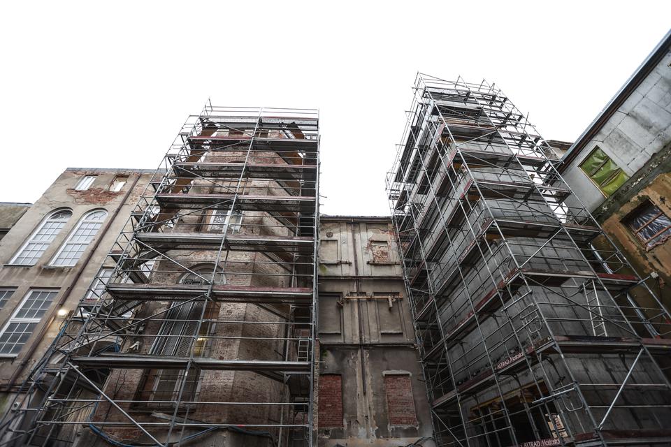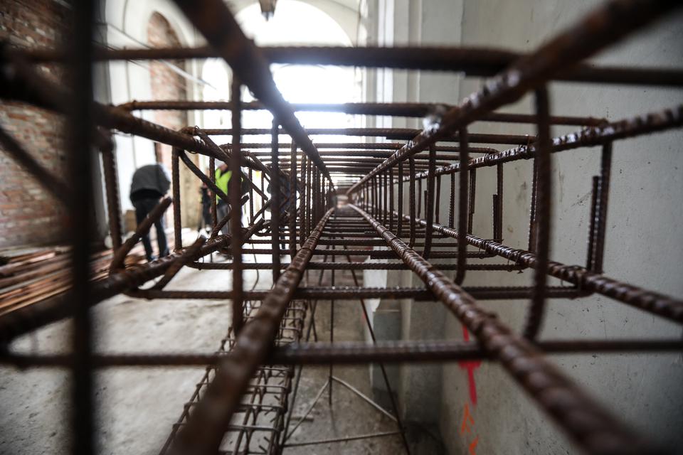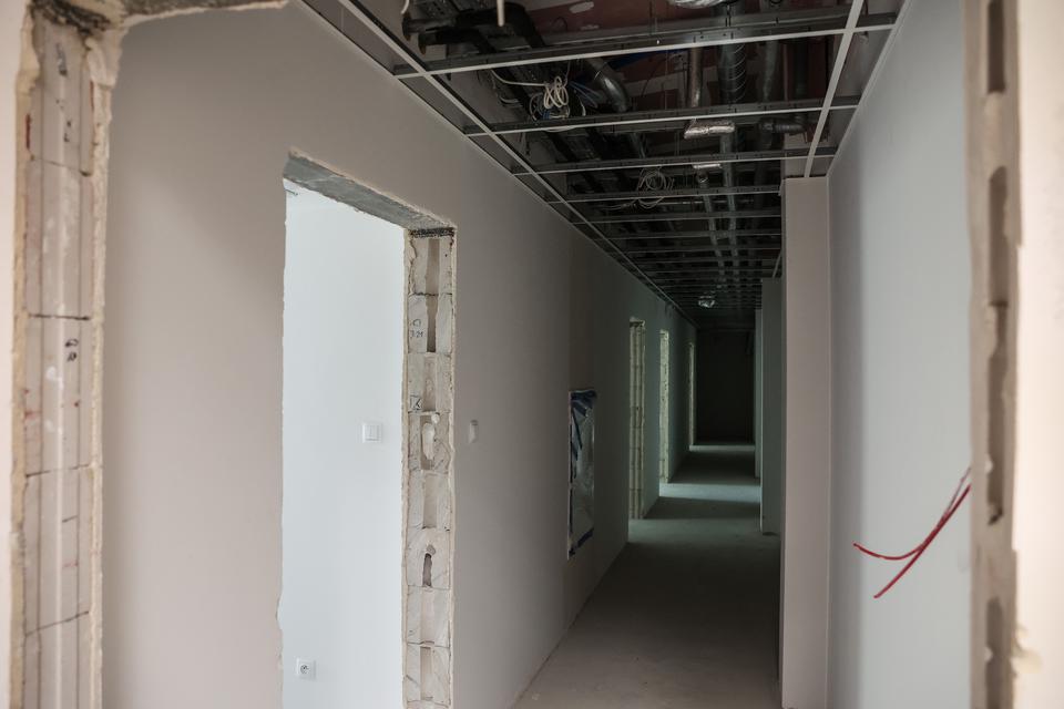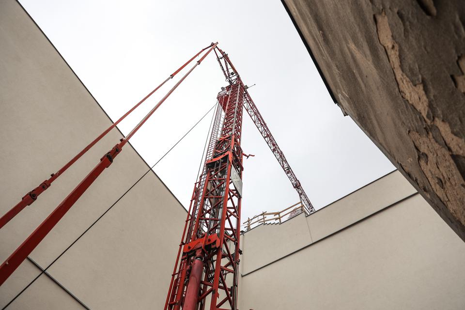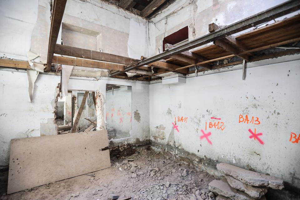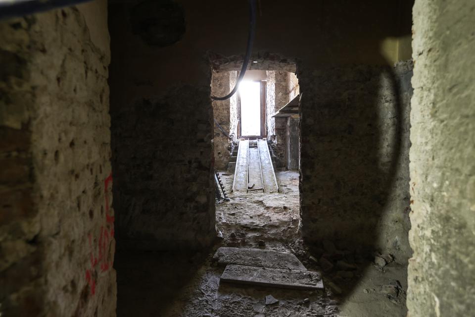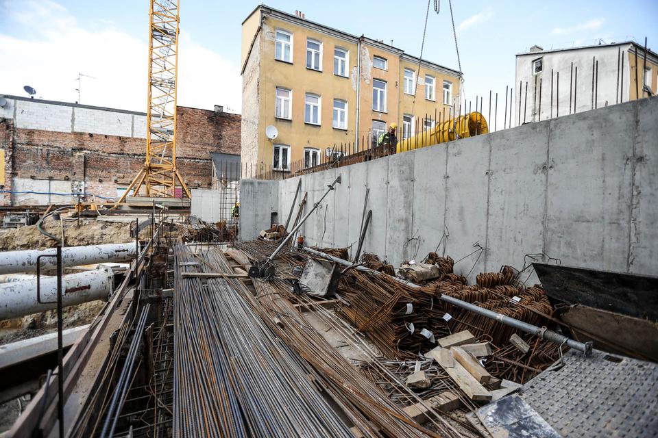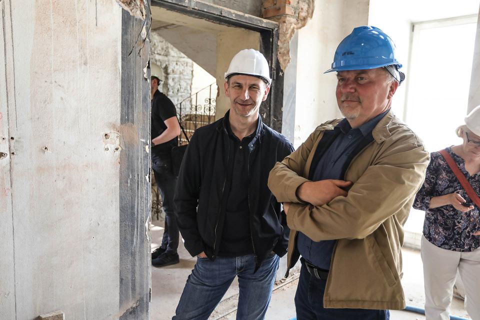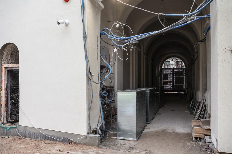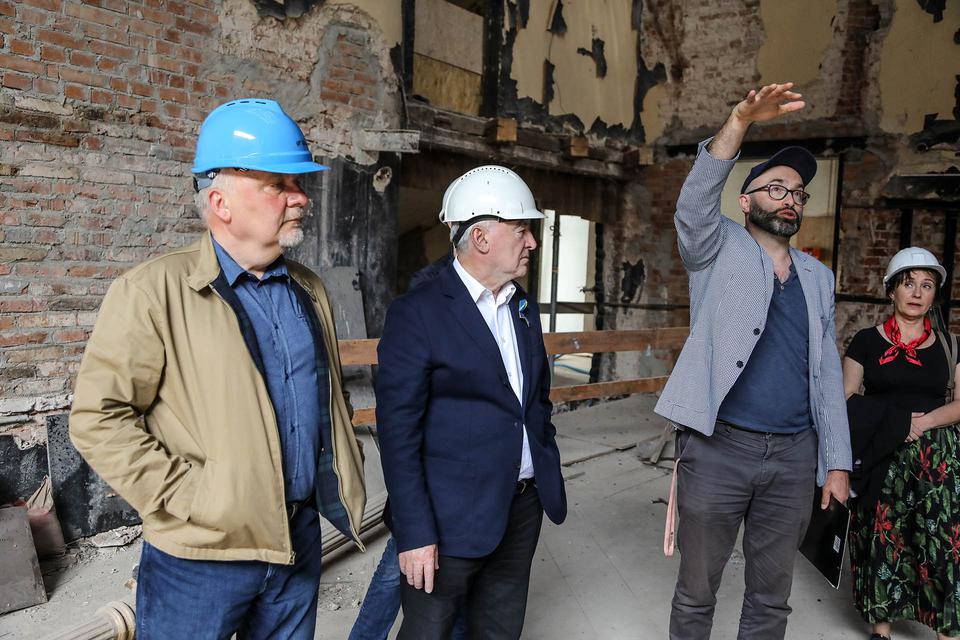 The first building works and advanced demolition works are being done at the construction site in 32 Sienkiewicza street. Installation and freight elevator were deconstructed. Disassembly of window frames and doors is taking place, as well as demolition of some partition walls and lining. Liquidation holes are being immured and walls are being strengthened. The ceilings in the main building are also being prepared for demolition.