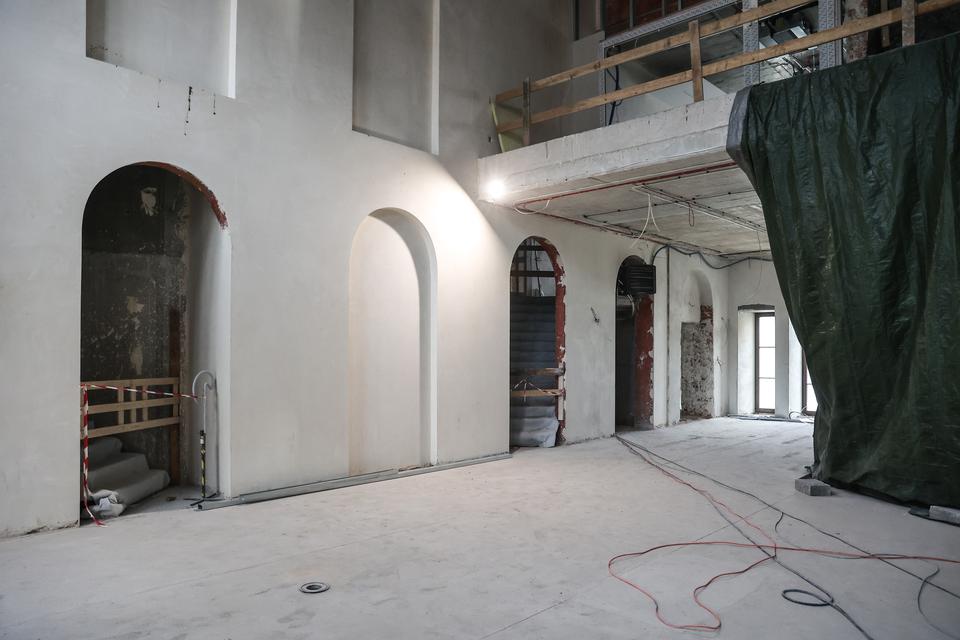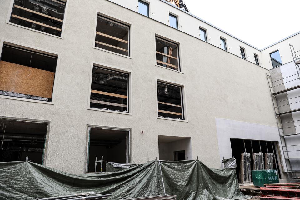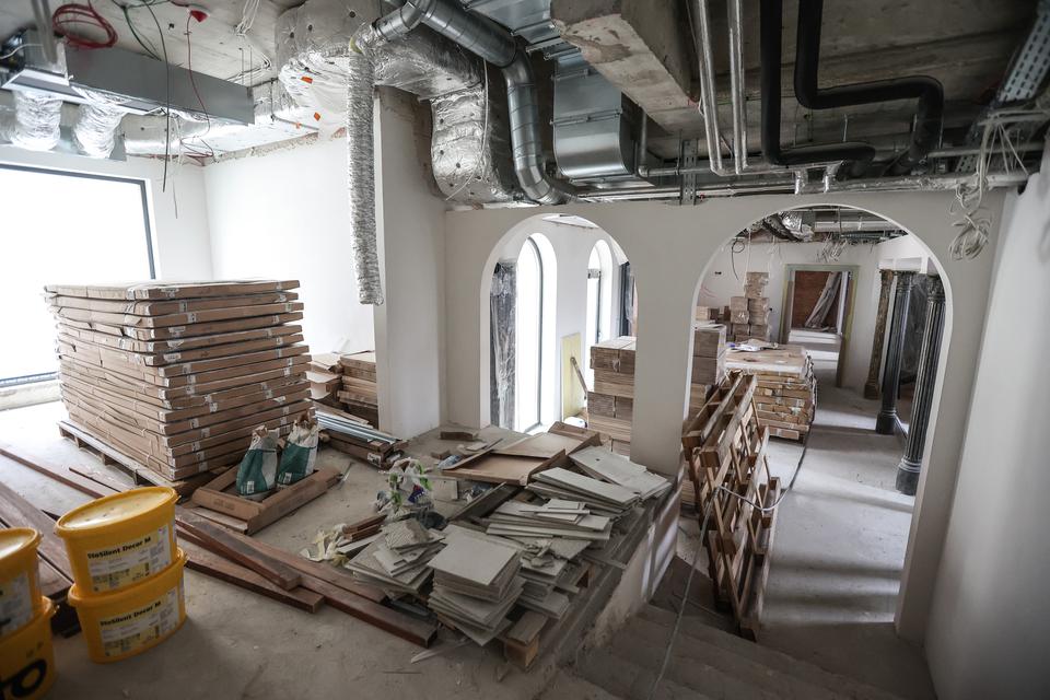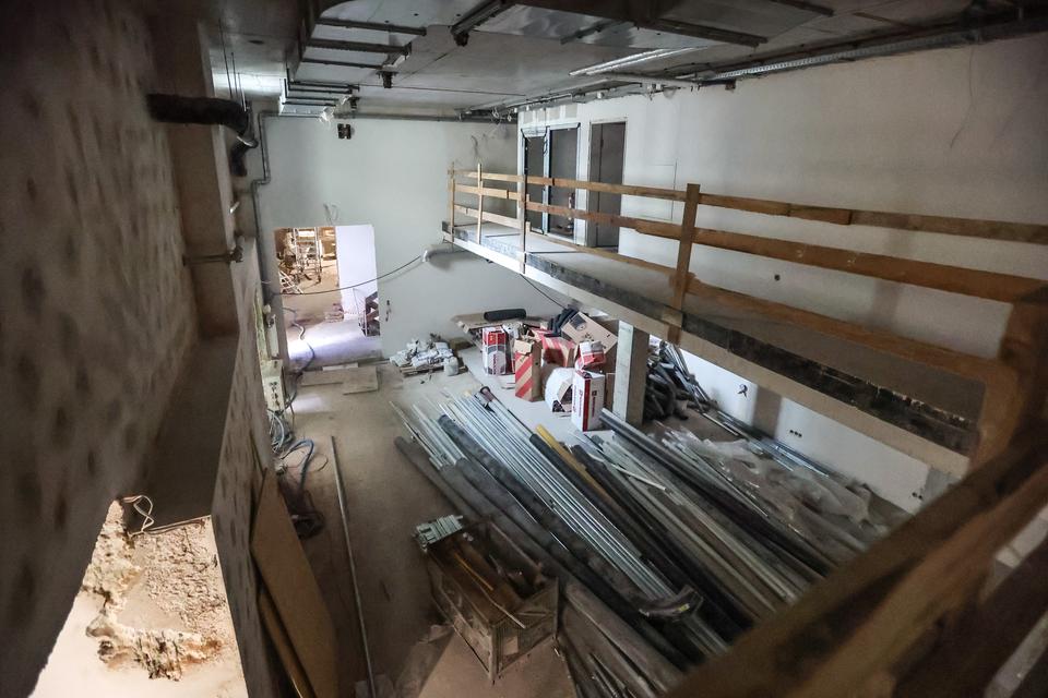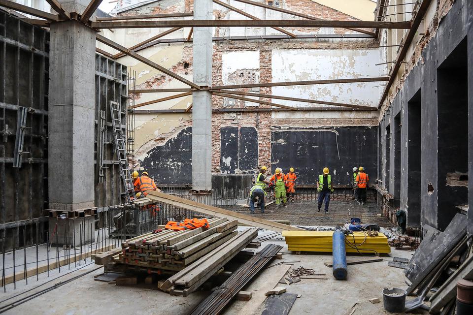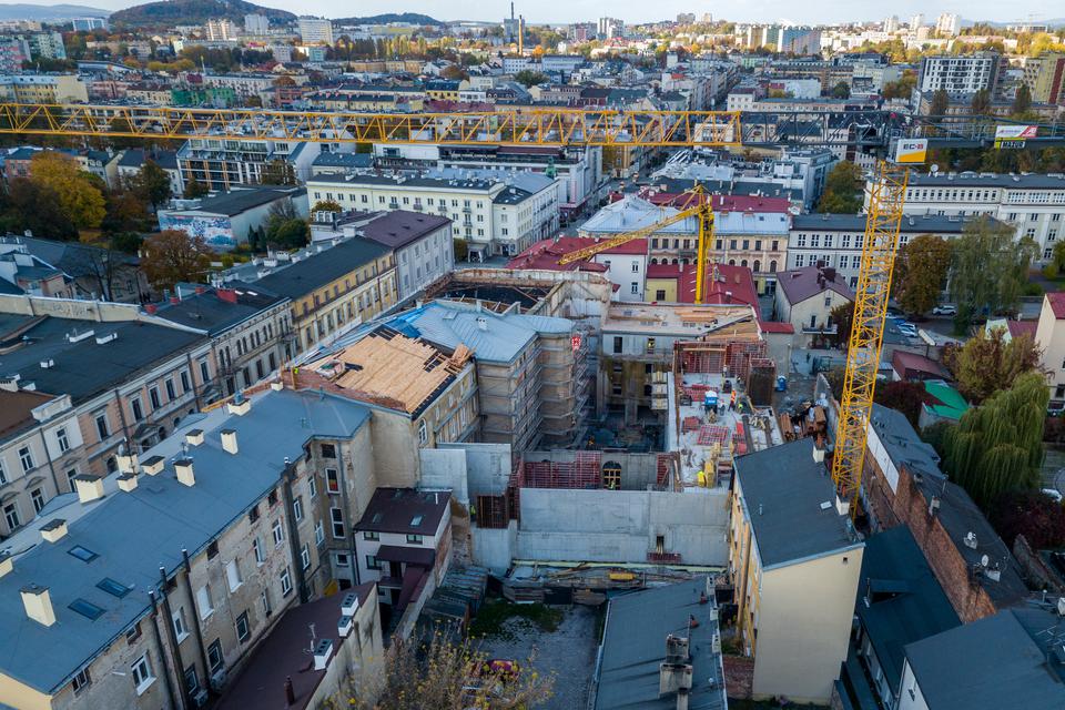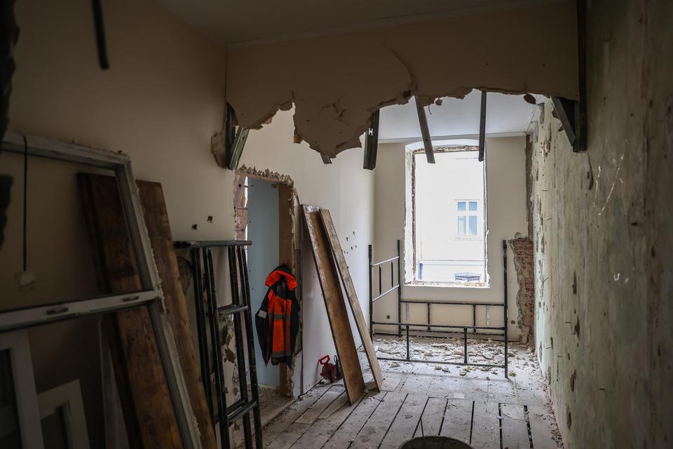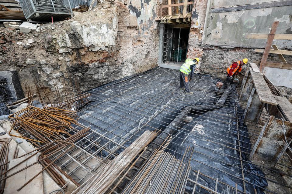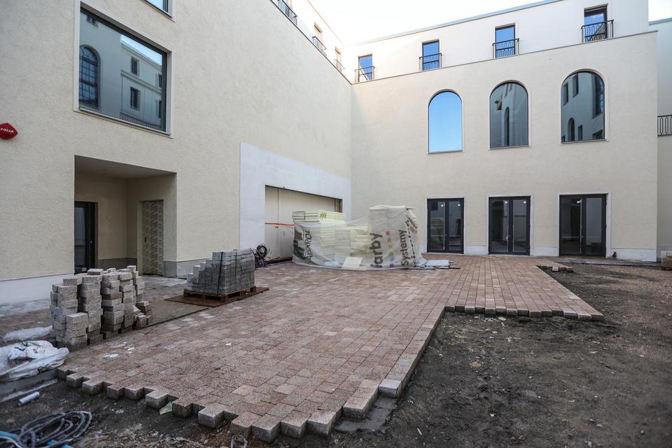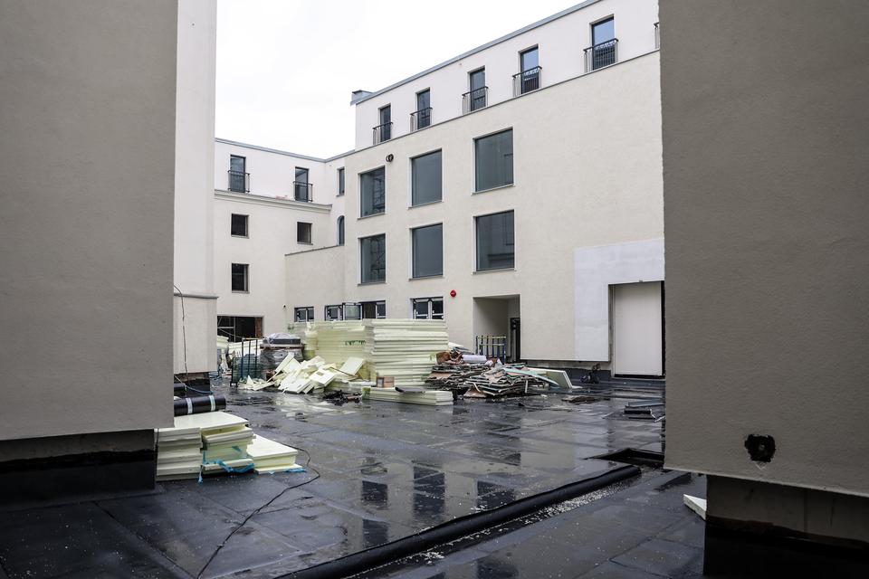 The first building works and advanced demolition works are being done at the construction site in 32 Sienkiewicza street. Installation and freight elevator were deconstructed. Disassembly of window frames and doors is taking place, as well as demolition of some partition walls and lining. Liquidation holes are being immured and walls are being strengthened. The ceilings in the main building are also being prepared for demolition.