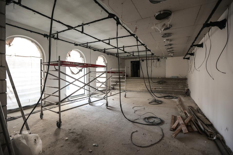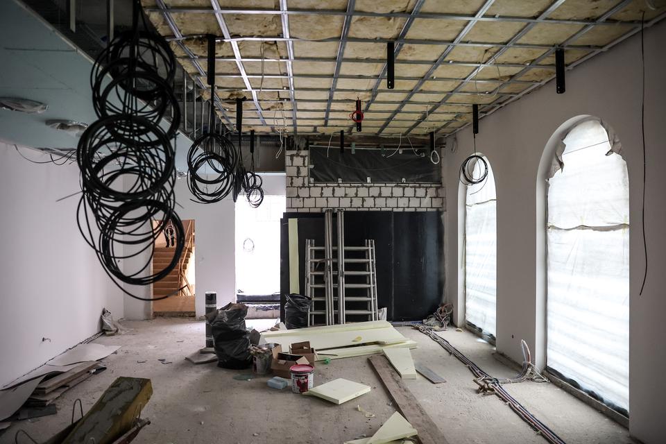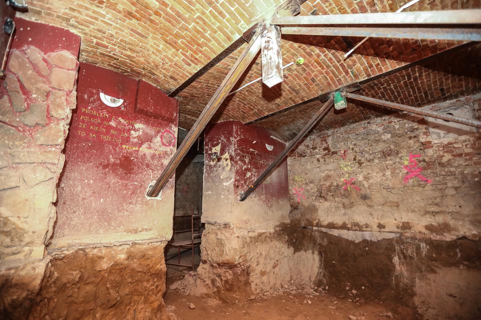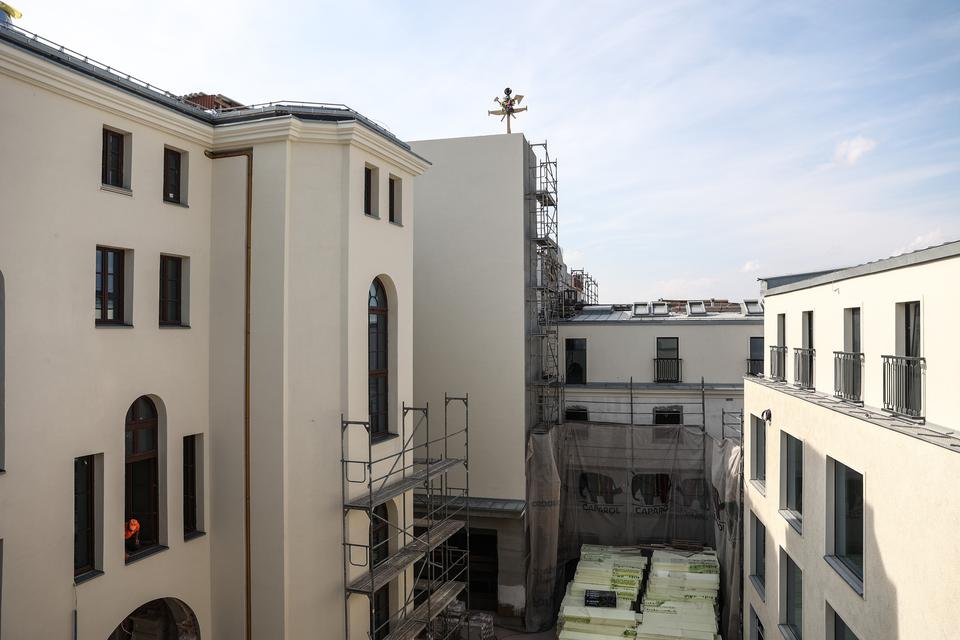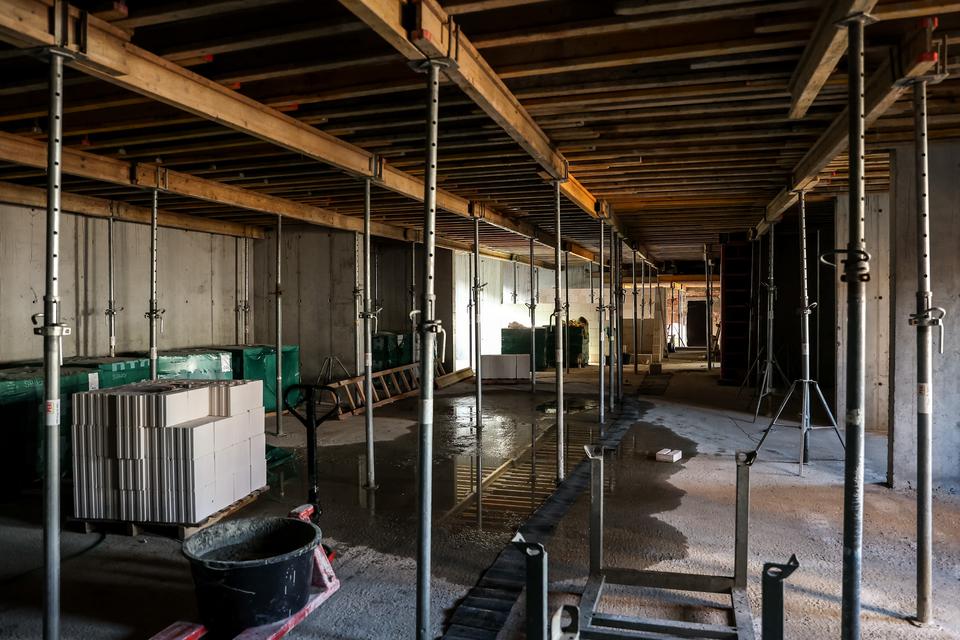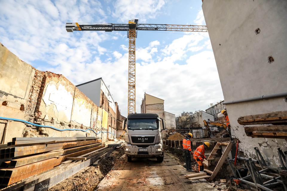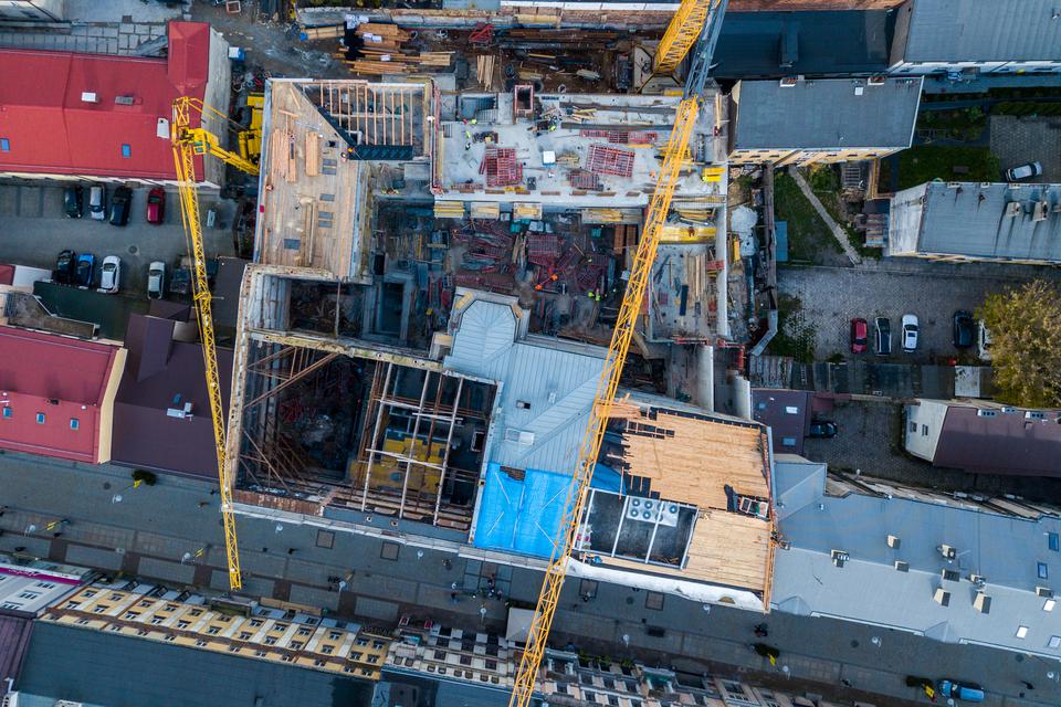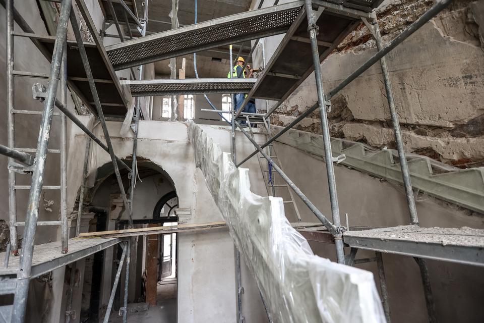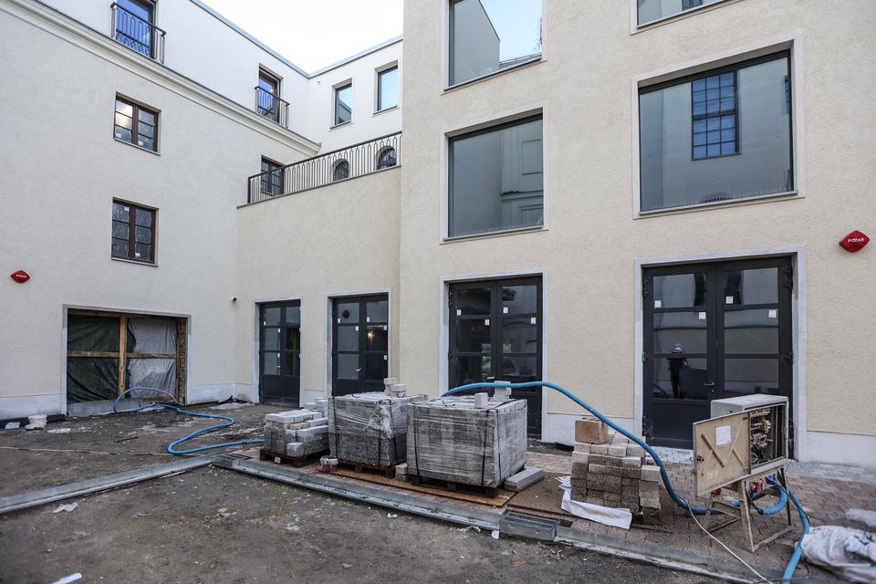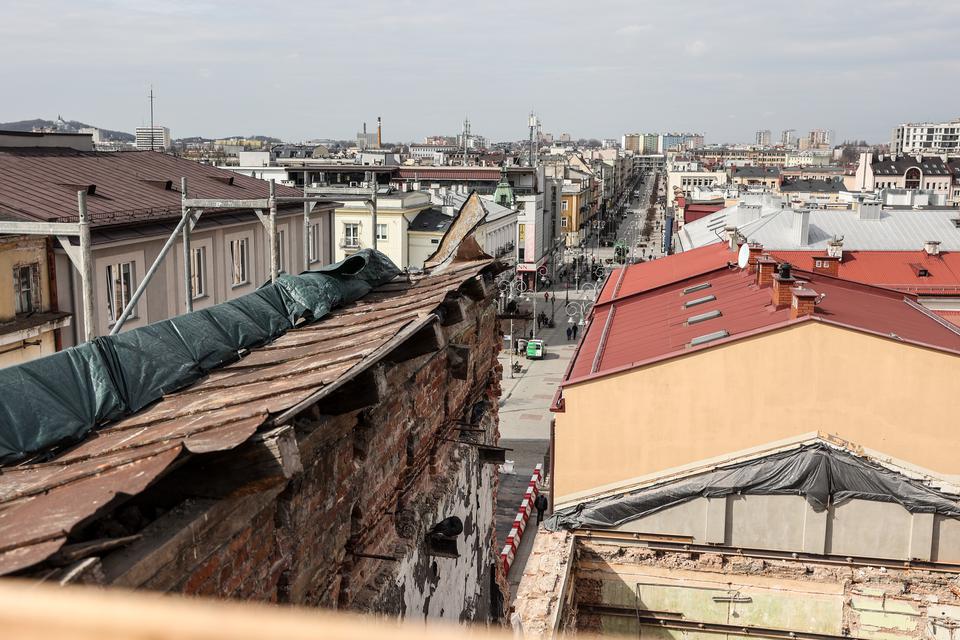 The first building works and advanced demolition works are being done at the construction site in 32 Sienkiewicza street. Installation and freight elevator were deconstructed. Disassembly of window frames and doors is taking place, as well as demolition of some partition walls and lining. Liquidation holes are being immured and walls are being strengthened. The ceilings in the main building are also being prepared for demolition.