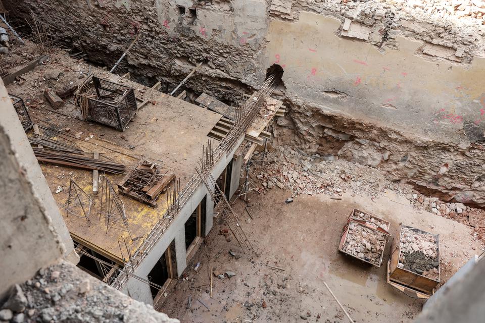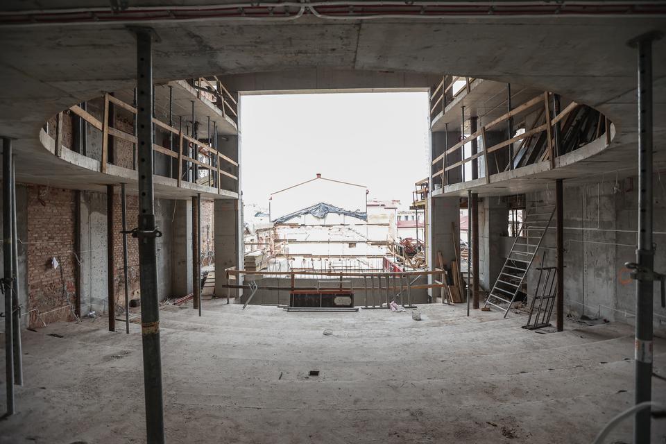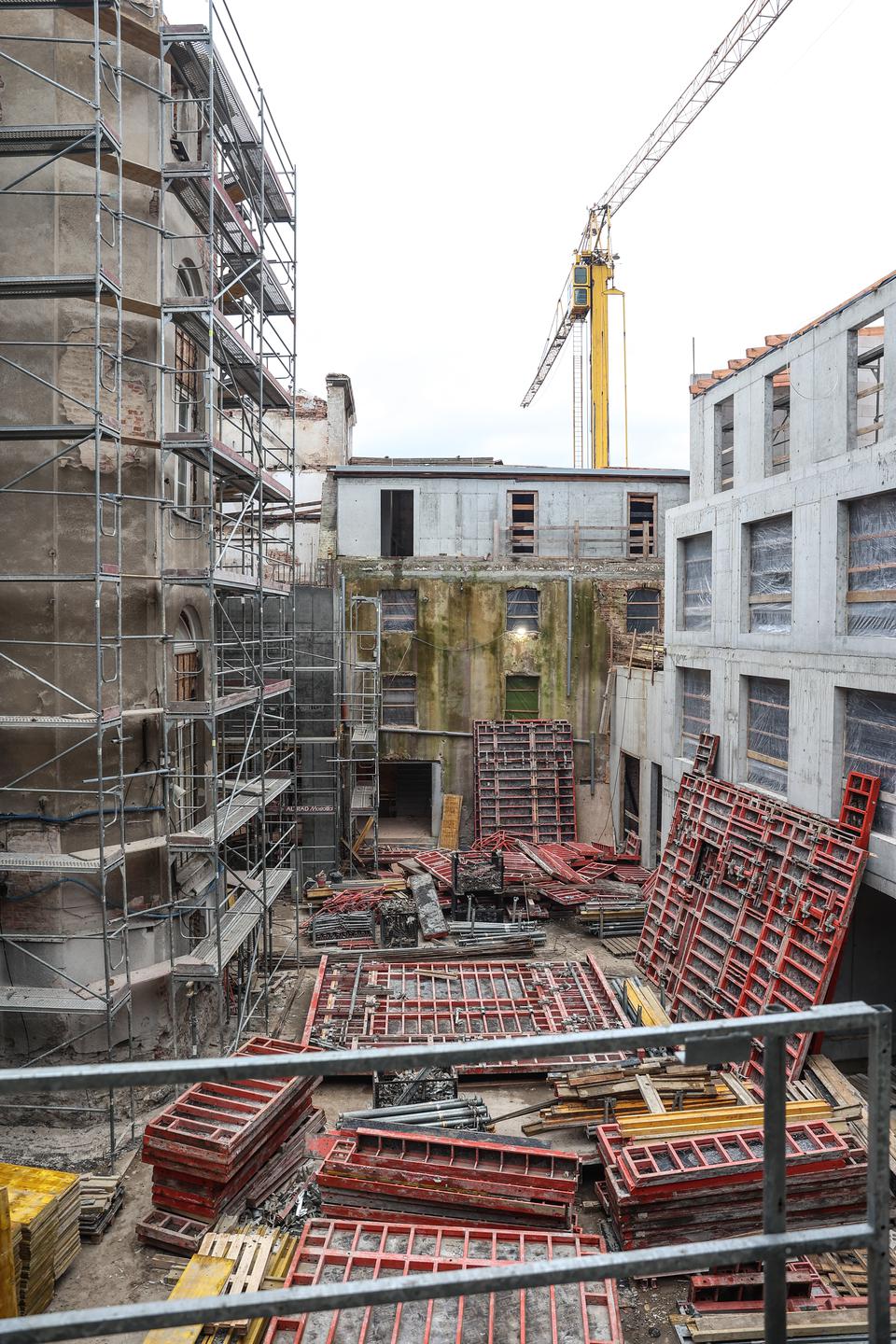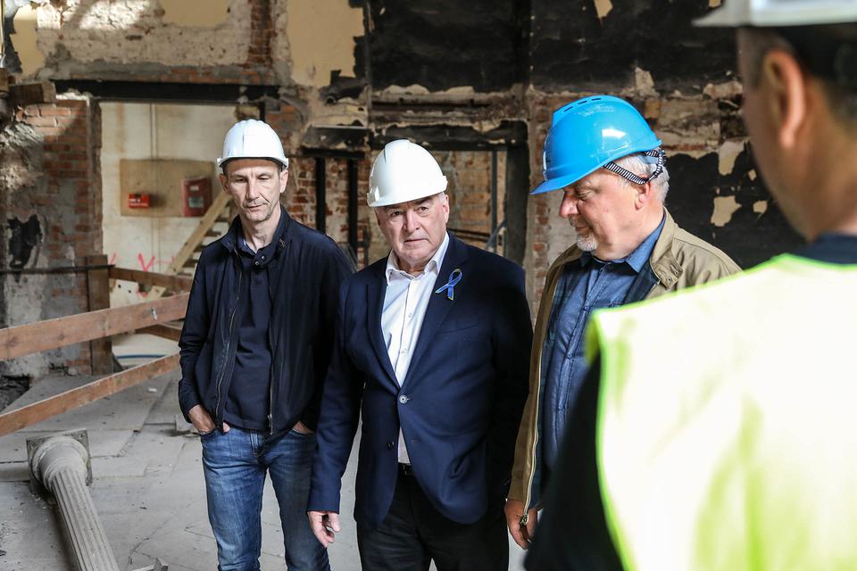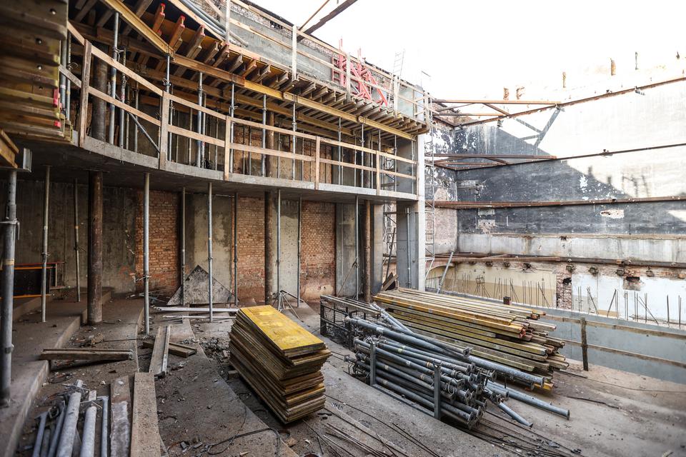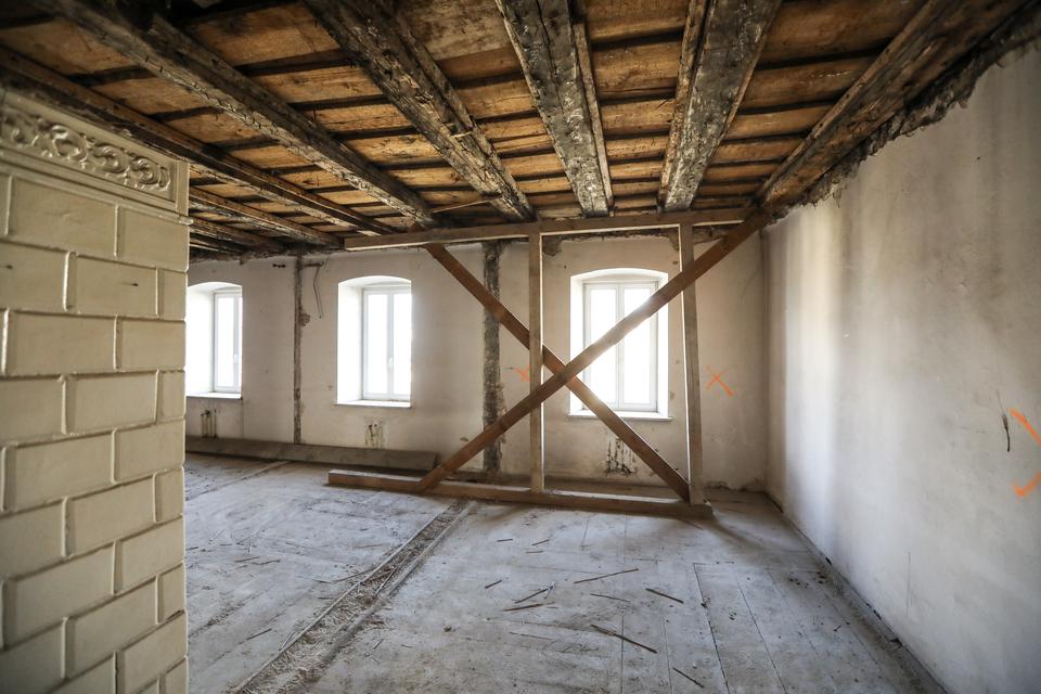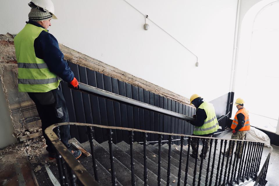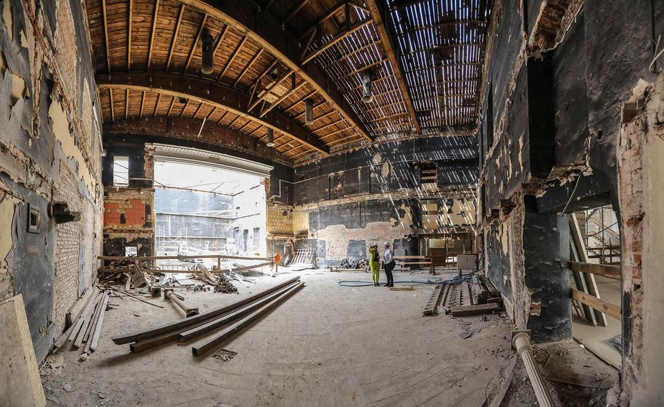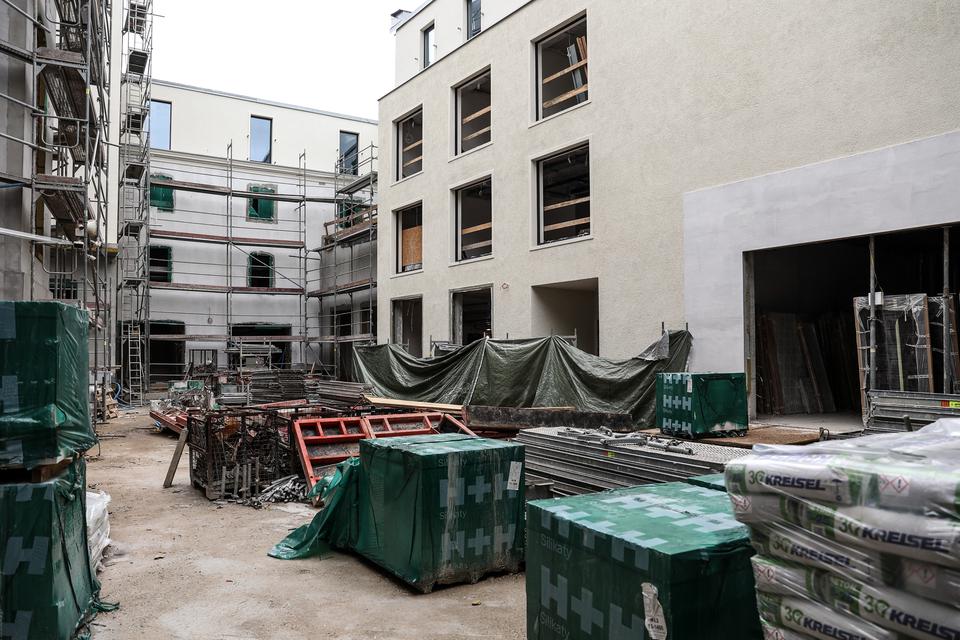 The first building works and advanced demolition works are being done at the construction site in 32 Sienkiewicza street. Installation and freight elevator were deconstructed. Disassembly of window frames and doors is taking place, as well as demolition of some partition walls and lining. Liquidation holes are being immured and walls are being strengthened. The ceilings in the main building are also being prepared for demolition.