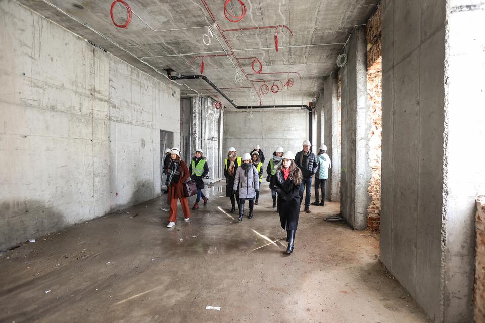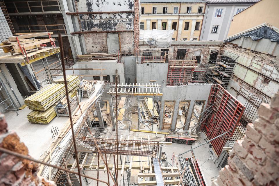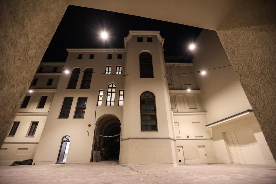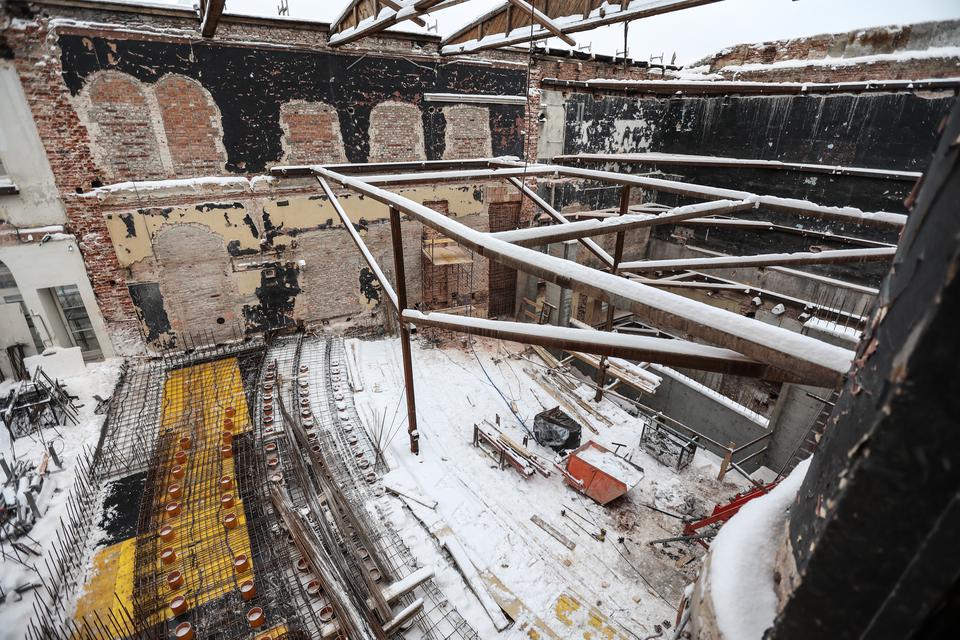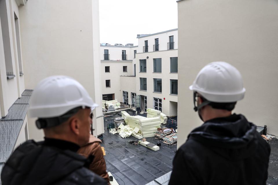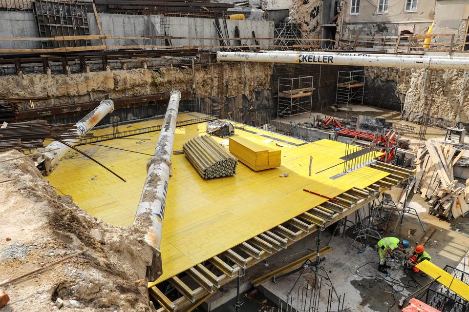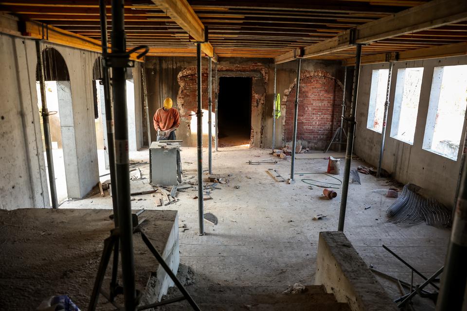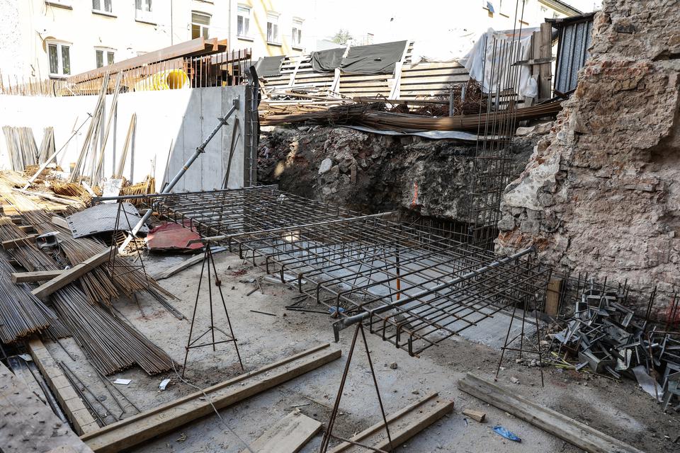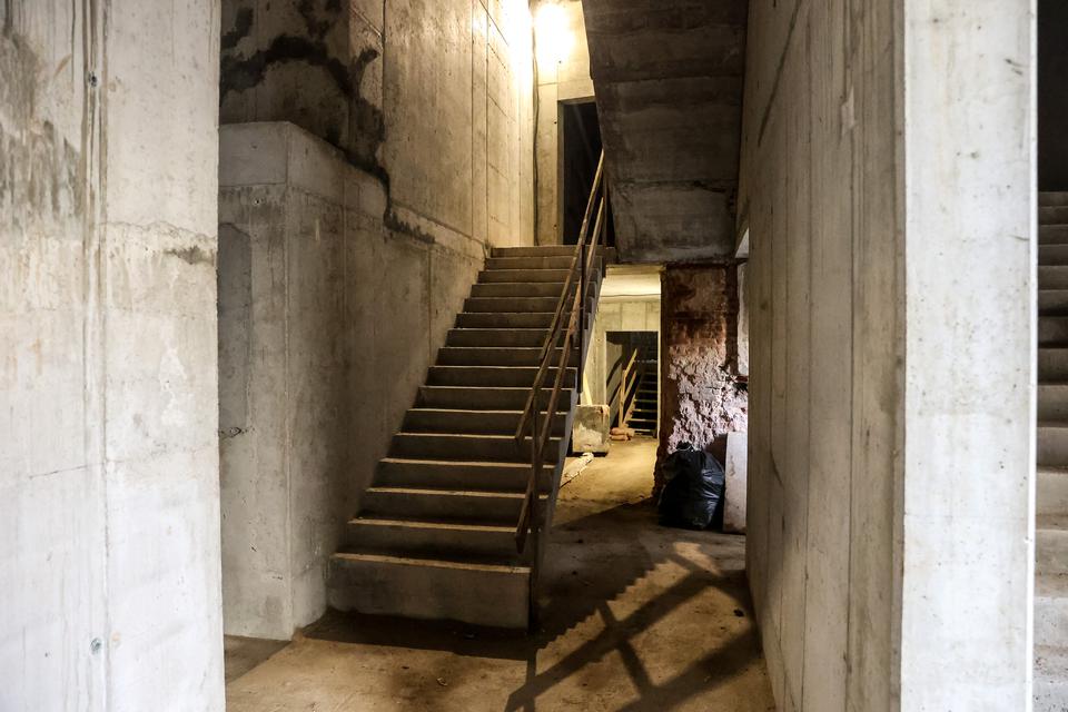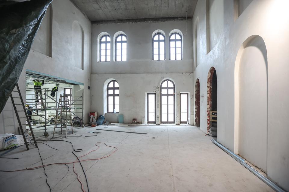 The first building works and advanced demolition works are being done at the construction site in 32 Sienkiewicza street. Installation and freight elevator were deconstructed. Disassembly of window frames and doors is taking place, as well as demolition of some partition walls and lining. Liquidation holes are being immured and walls are being strengthened. The ceilings in the main building are also being prepared for demolition.