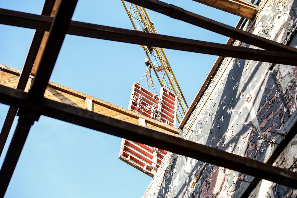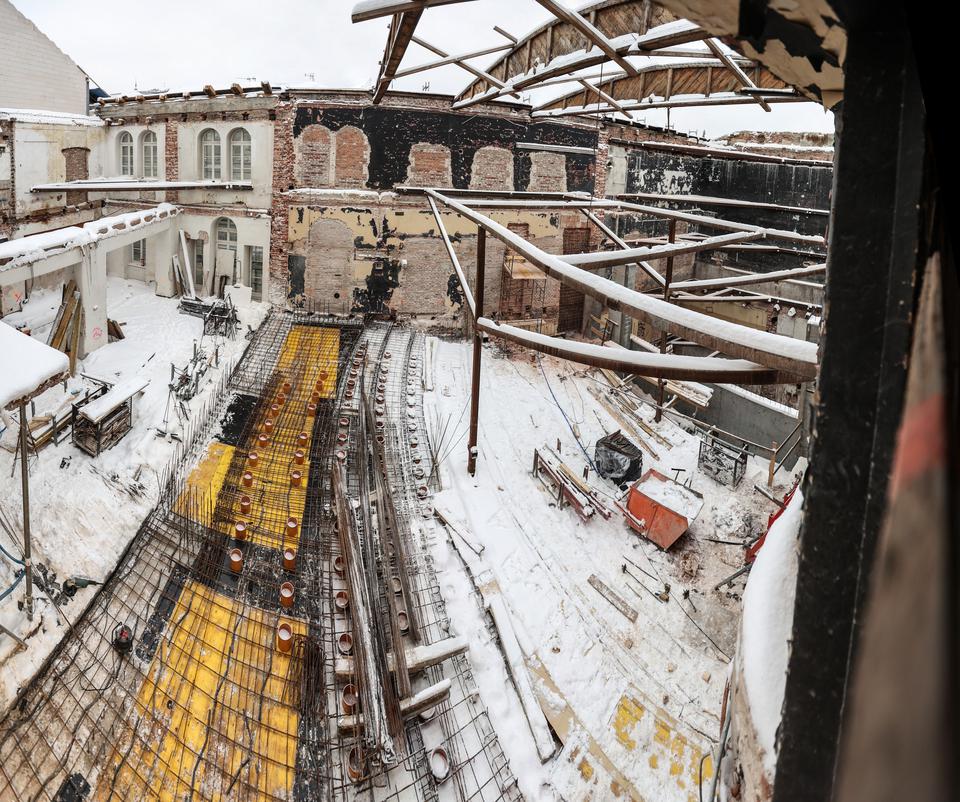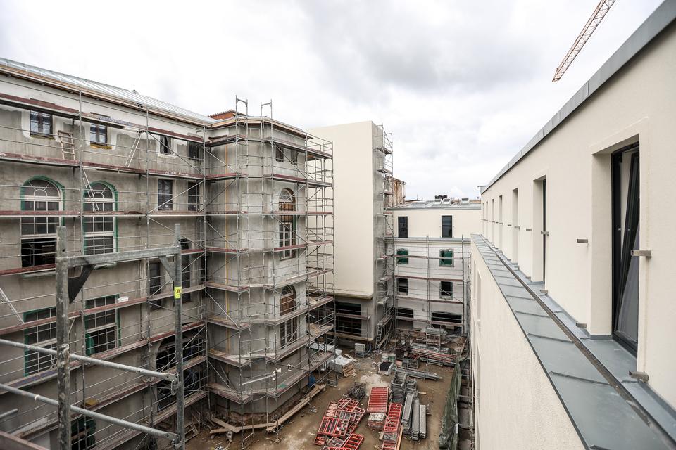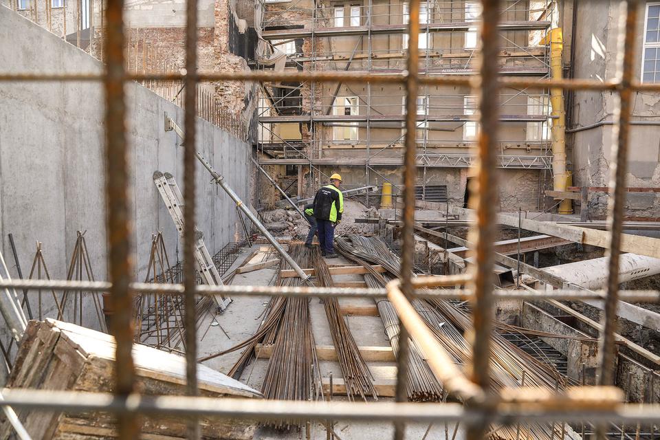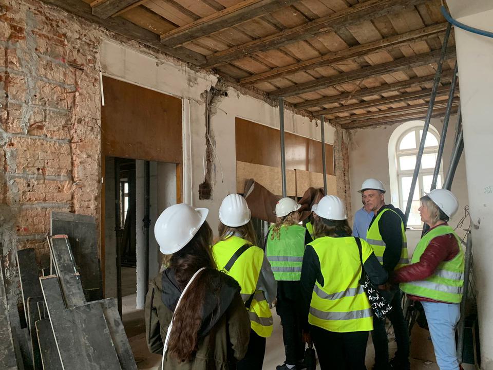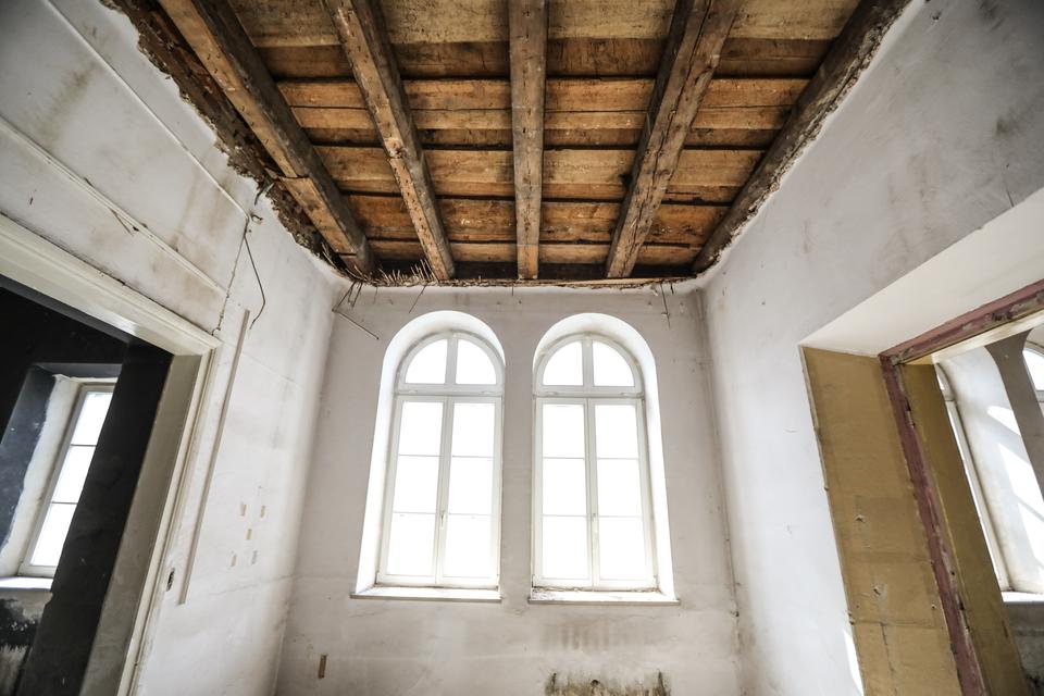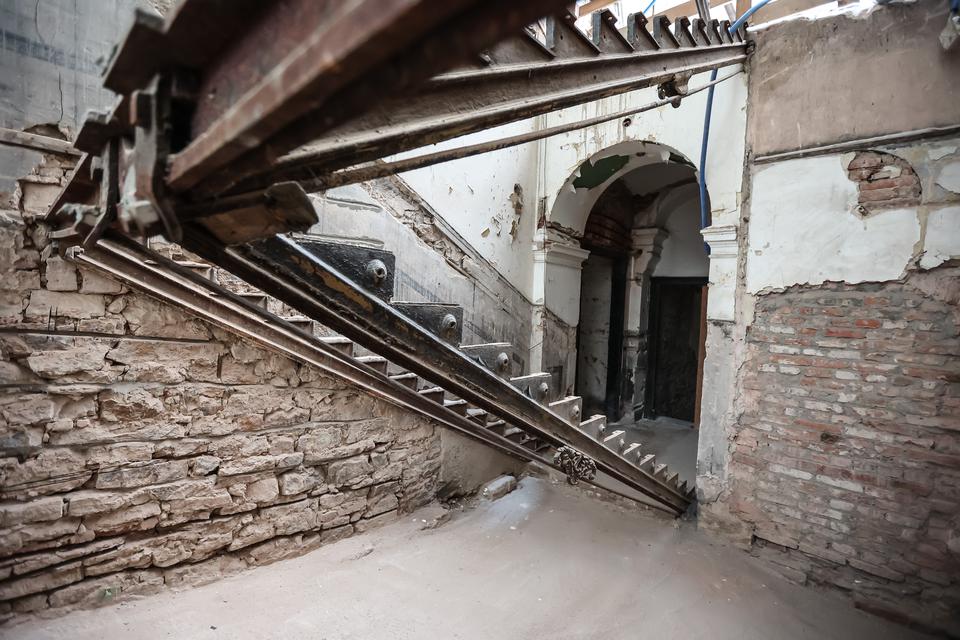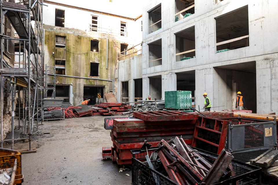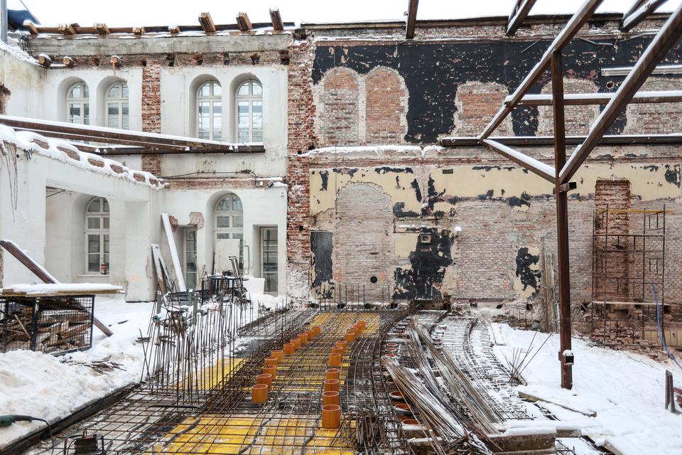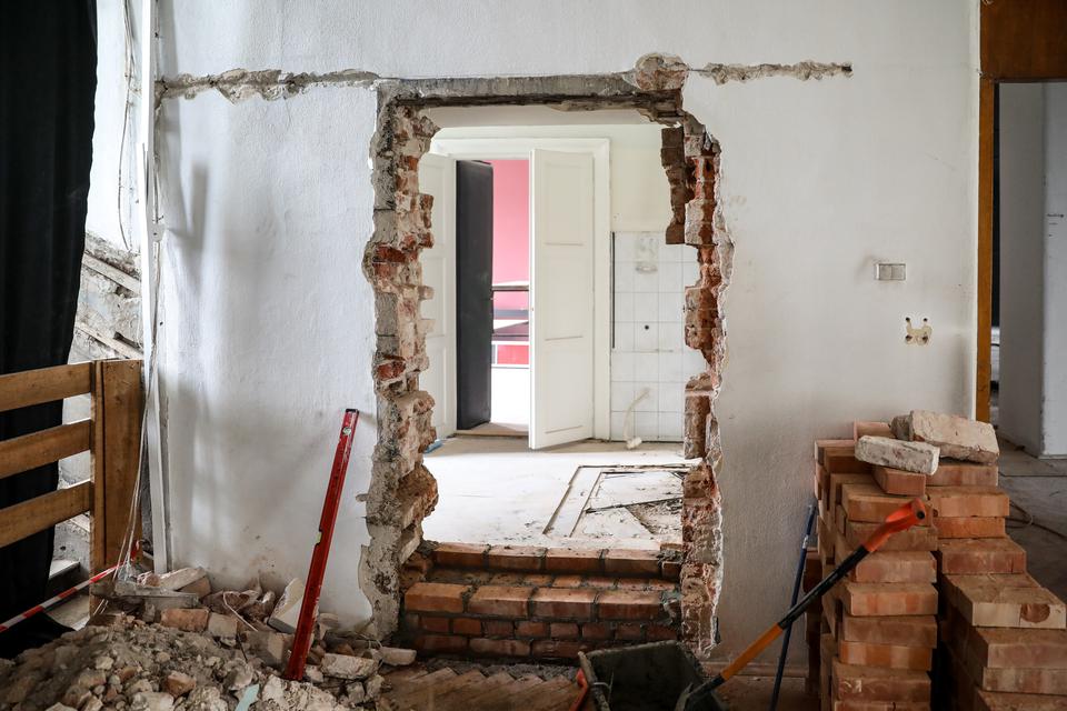 The first building works and advanced demolition works are being done at the construction site in 32 Sienkiewicza street. Installation and freight elevator were deconstructed. Disassembly of window frames and doors is taking place, as well as demolition of some partition walls and lining. Liquidation holes are being immured and walls are being strengthened. The ceilings in the main building are also being prepared for demolition.