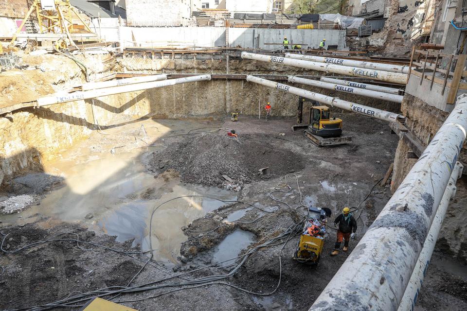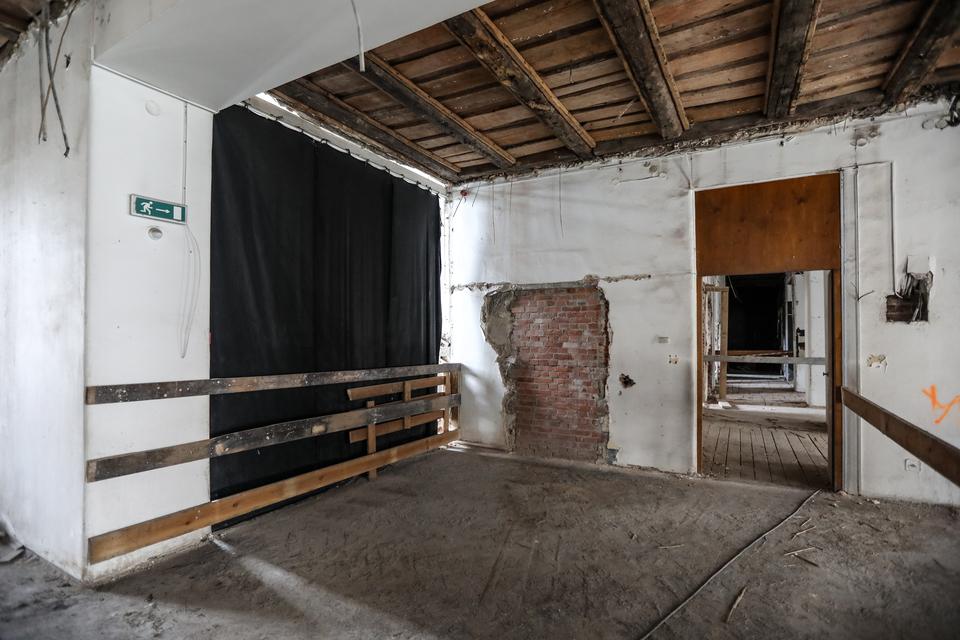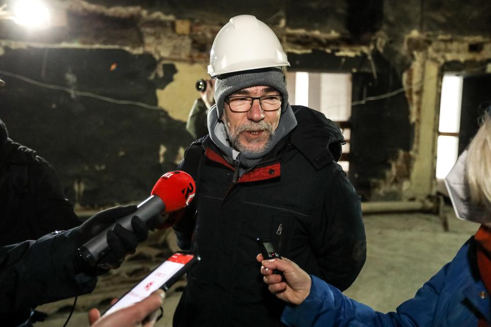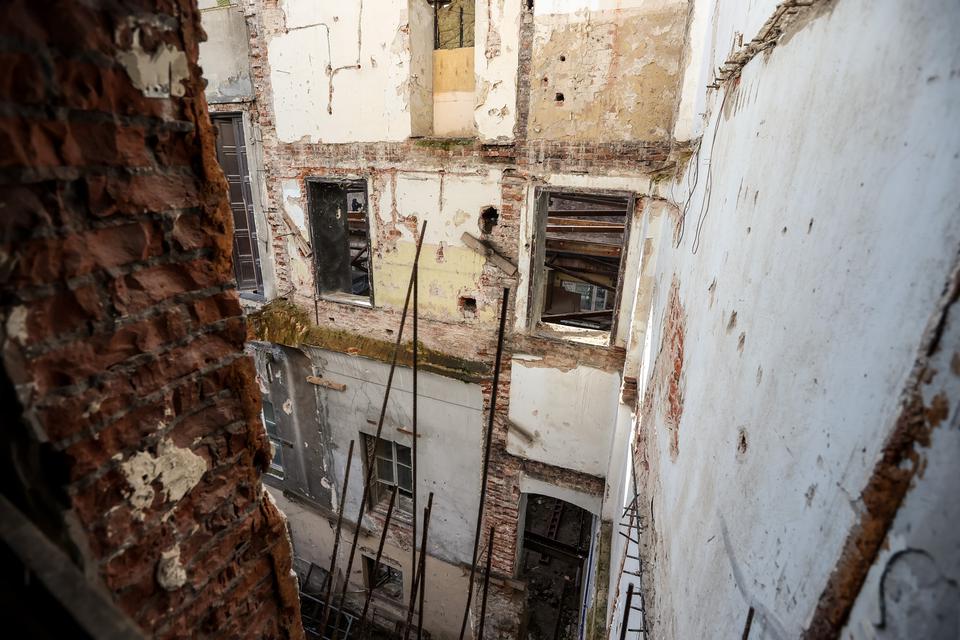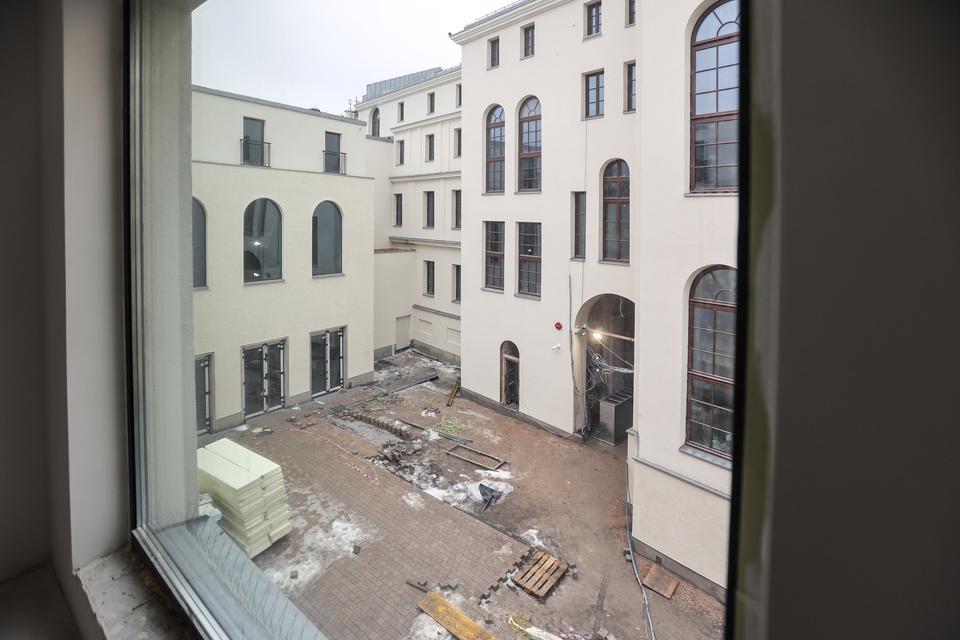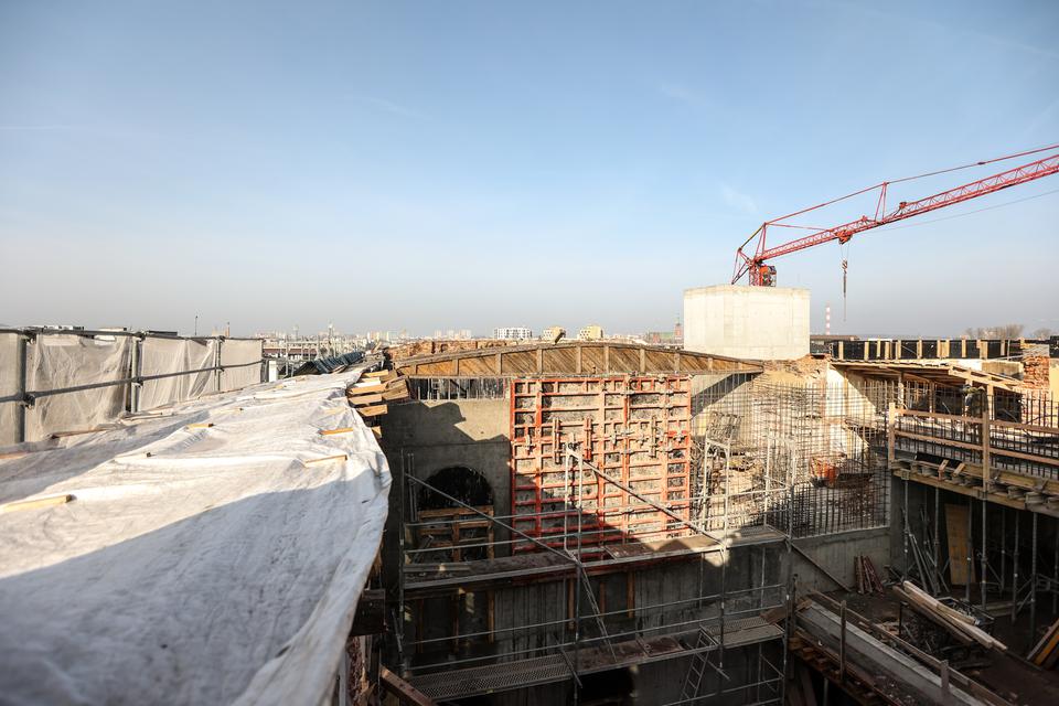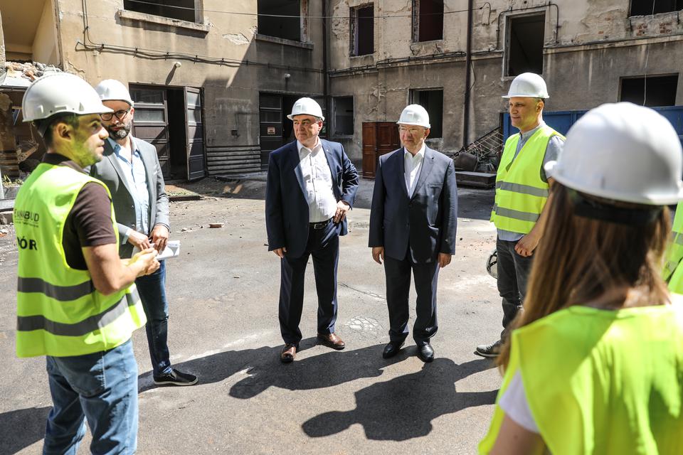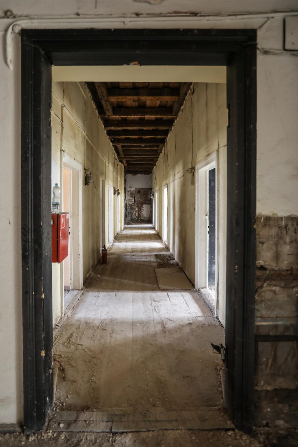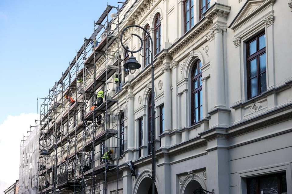 The first building works and advanced demolition works are being done at the construction site in 32 Sienkiewicza street. Installation and freight elevator were deconstructed. Disassembly of window frames and doors is taking place, as well as demolition of some partition walls and lining. Liquidation holes are being immured and walls are being strengthened. The ceilings in the main building are also being prepared for demolition.