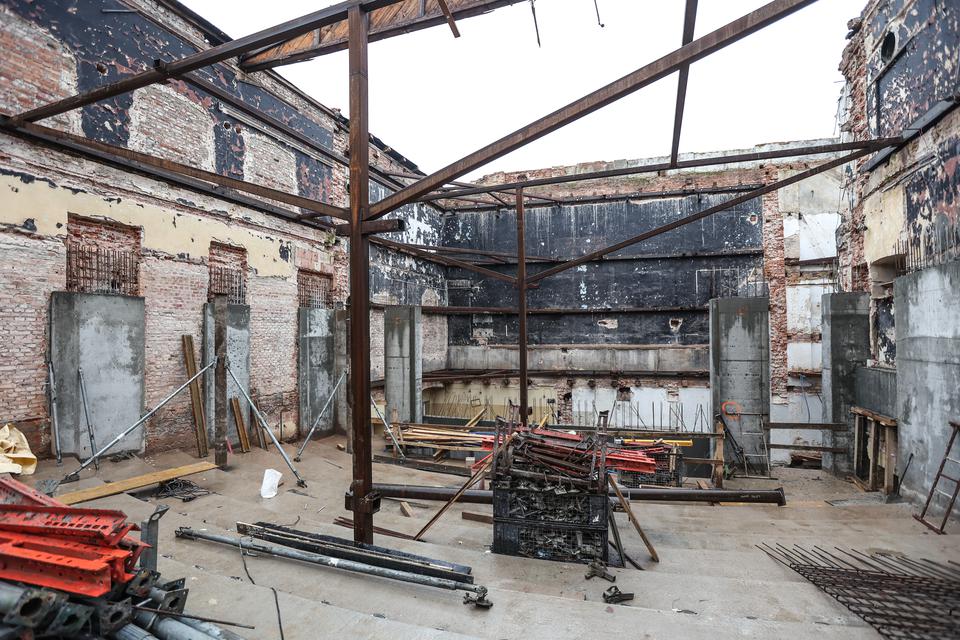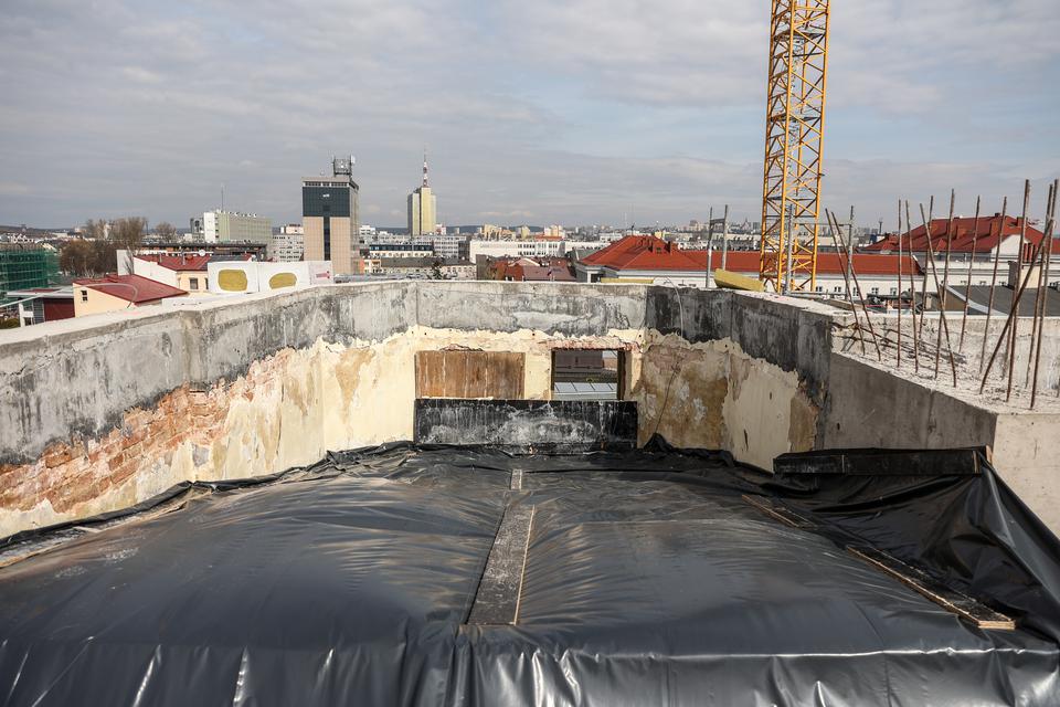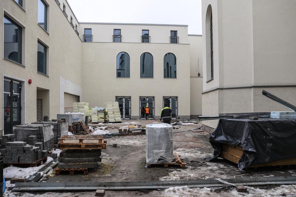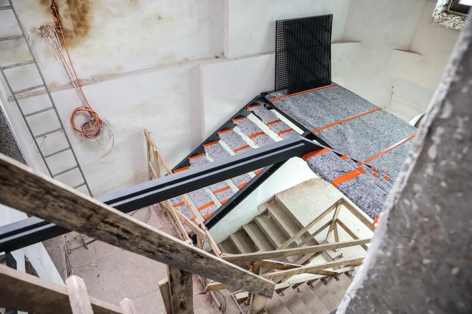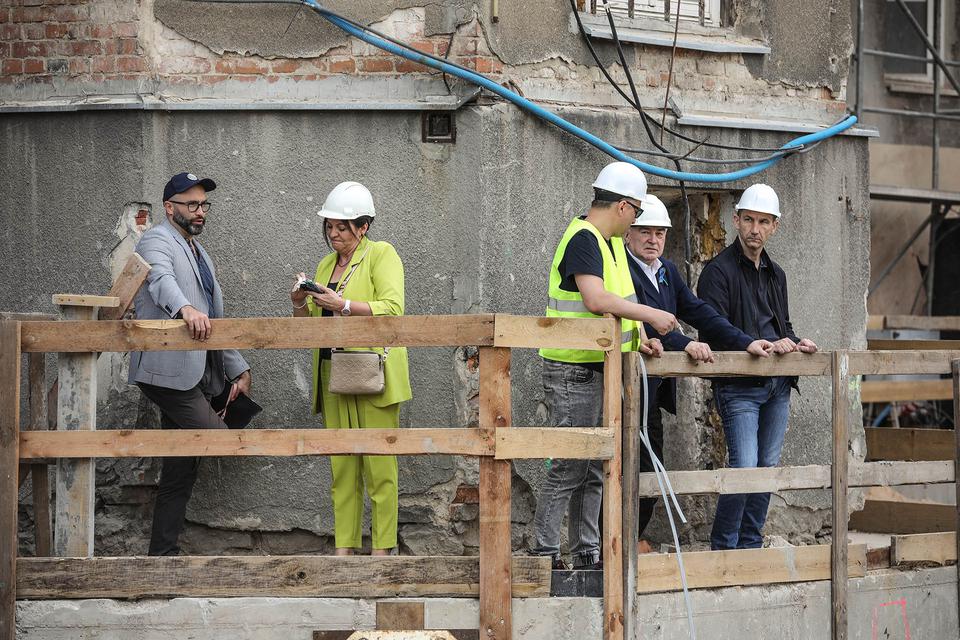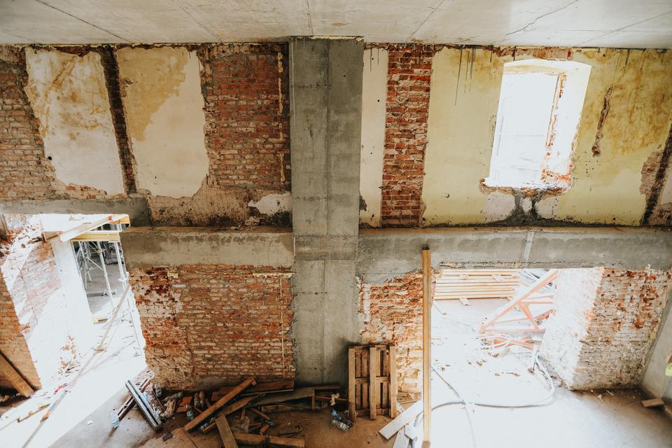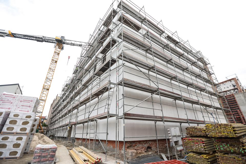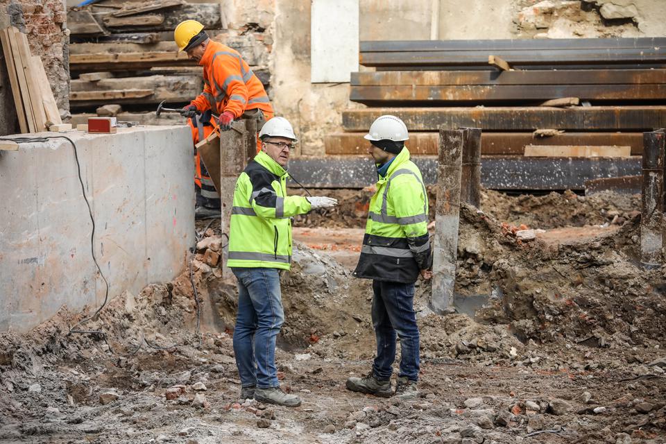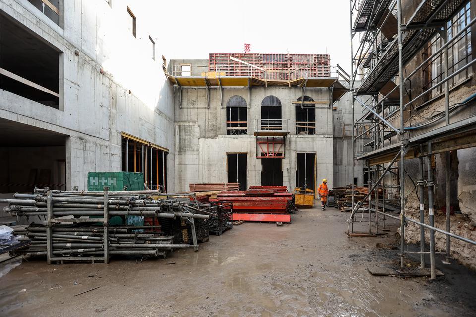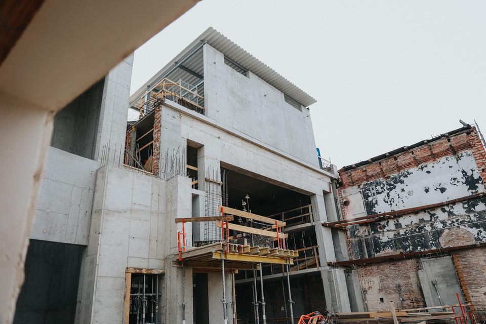 The first building works and advanced demolition works are being done at the construction site in 32 Sienkiewicza street. Installation and freight elevator were deconstructed. Disassembly of window frames and doors is taking place, as well as demolition of some partition walls and lining. Liquidation holes are being immured and walls are being strengthened. The ceilings in the main building are also being prepared for demolition.