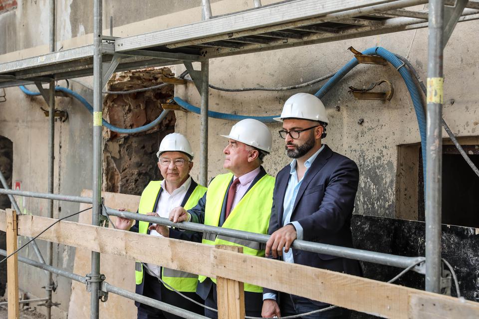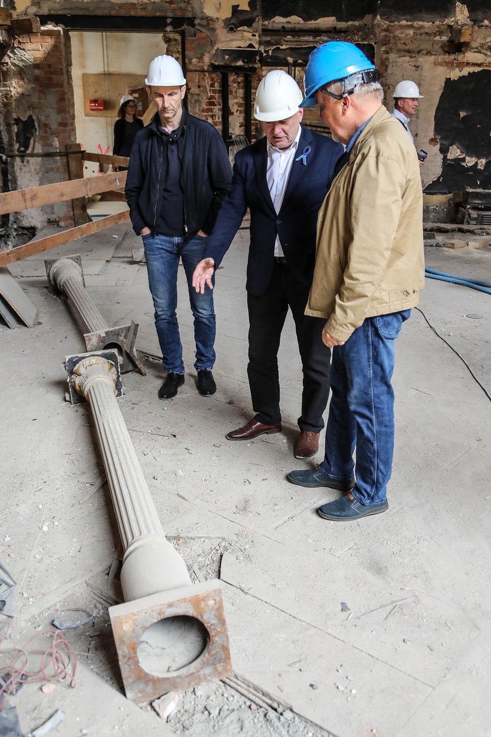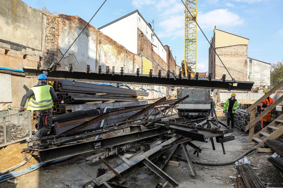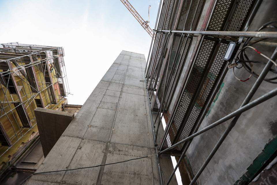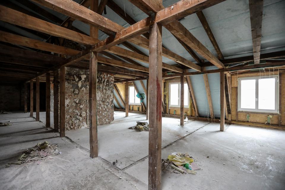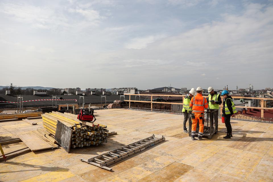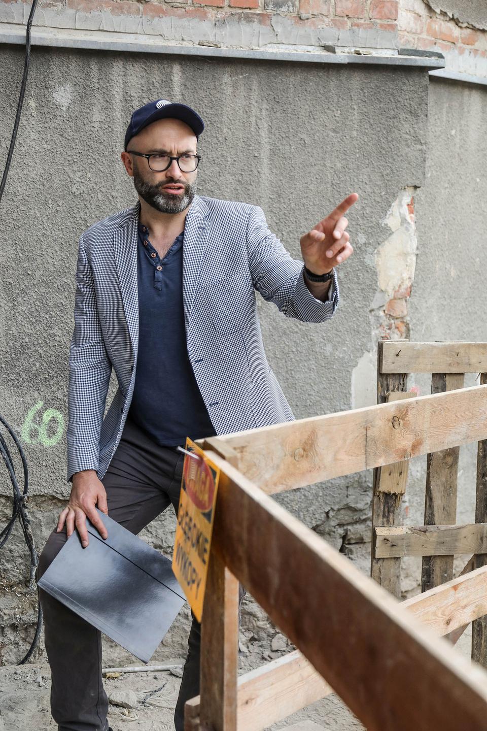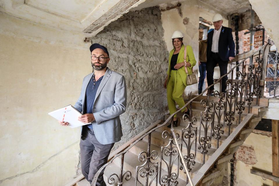 The first building works and advanced demolition works are being done at the construction site in 32 Sienkiewicza street. Installation and freight elevator were deconstructed. Disassembly of window frames and doors is taking place, as well as demolition of some partition walls and lining. Liquidation holes are being immured and walls are being strengthened. The ceilings in the main building are also being prepared for demolition.