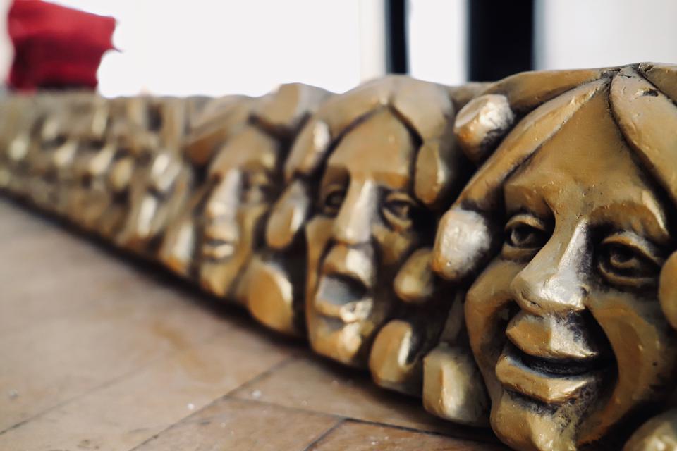 The examination above the scene unveiled the further secrets. The gildings on the caryatids were discovered. In the joist of lintel there was a Latin citation from Horace: Omne tulit punctum, qui miscuit utile dulci (He gains universal applause who mingles the useful with the agreeable). The inscription was encrusted, and behind it there used to hang the coat of arms of City of Kielce.