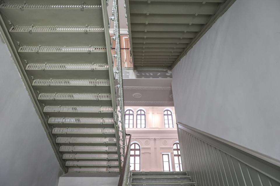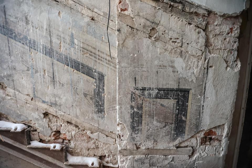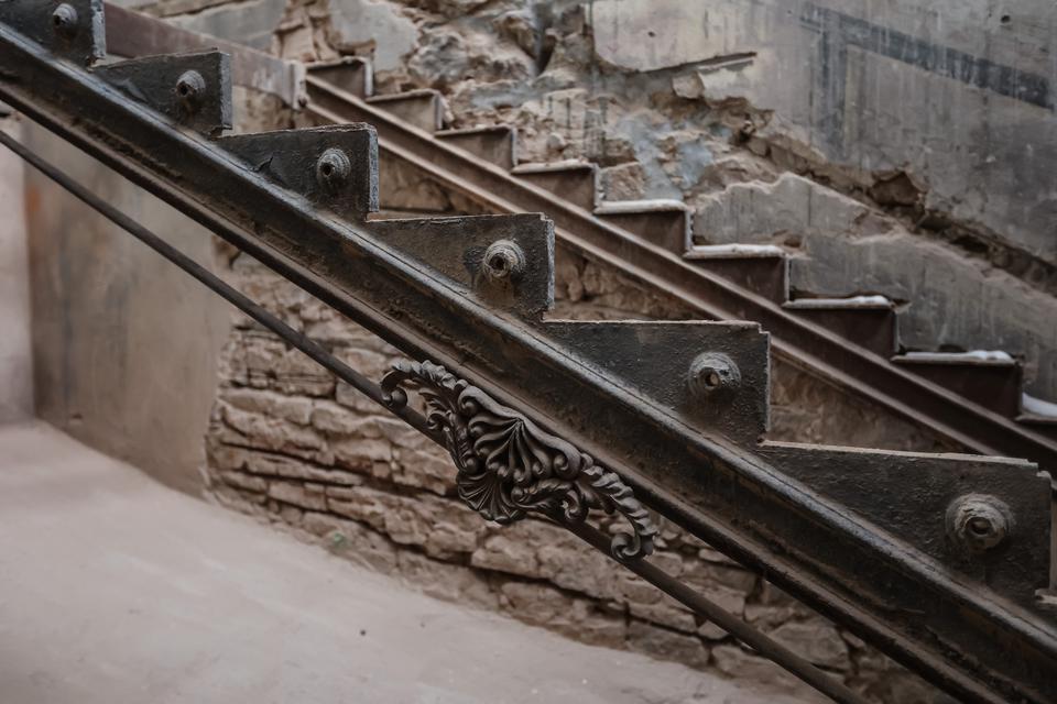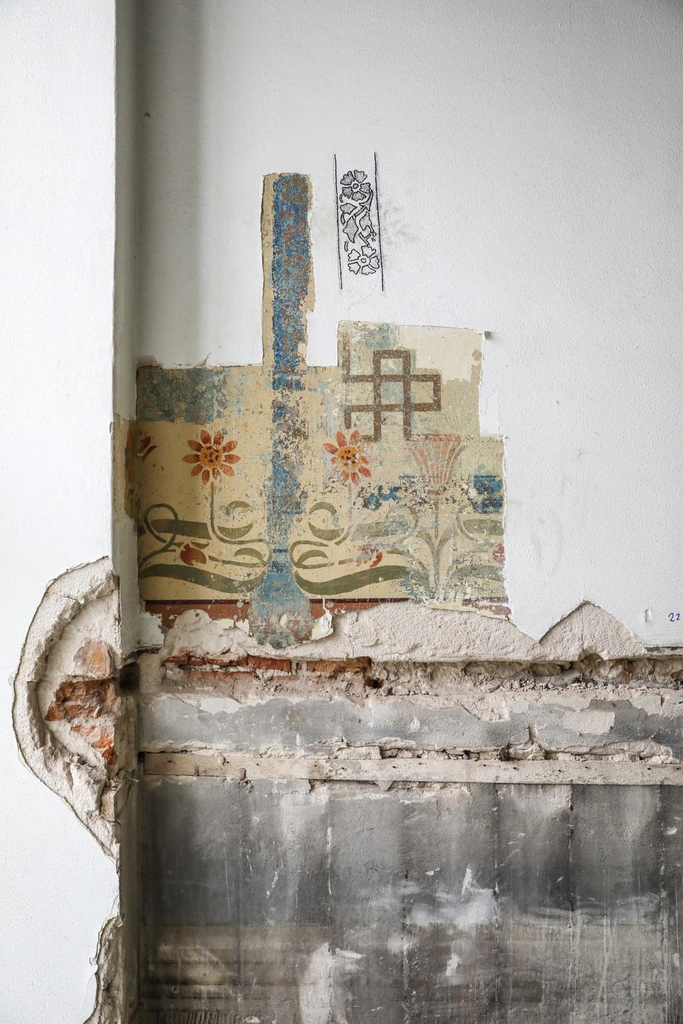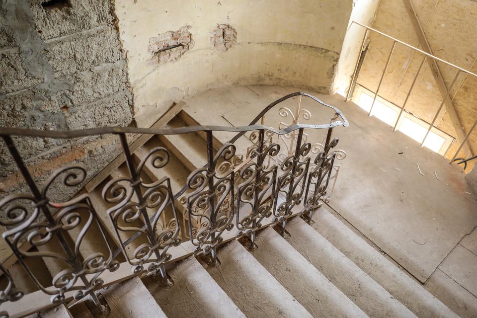 The conservator stated that the lining is not coherent with the system of cast-iron stairs’ run mounted in the stairway. It can show that they had been painted before the stairs were installed (The description in “Kielce Newspaper” from 1878 claims that the stairway was equipped with cast-iron stairs). There is a possibility that inconsistence of polychrome with the run of stairs after their installation induced the owner to cover the wall with the wood paneling.
